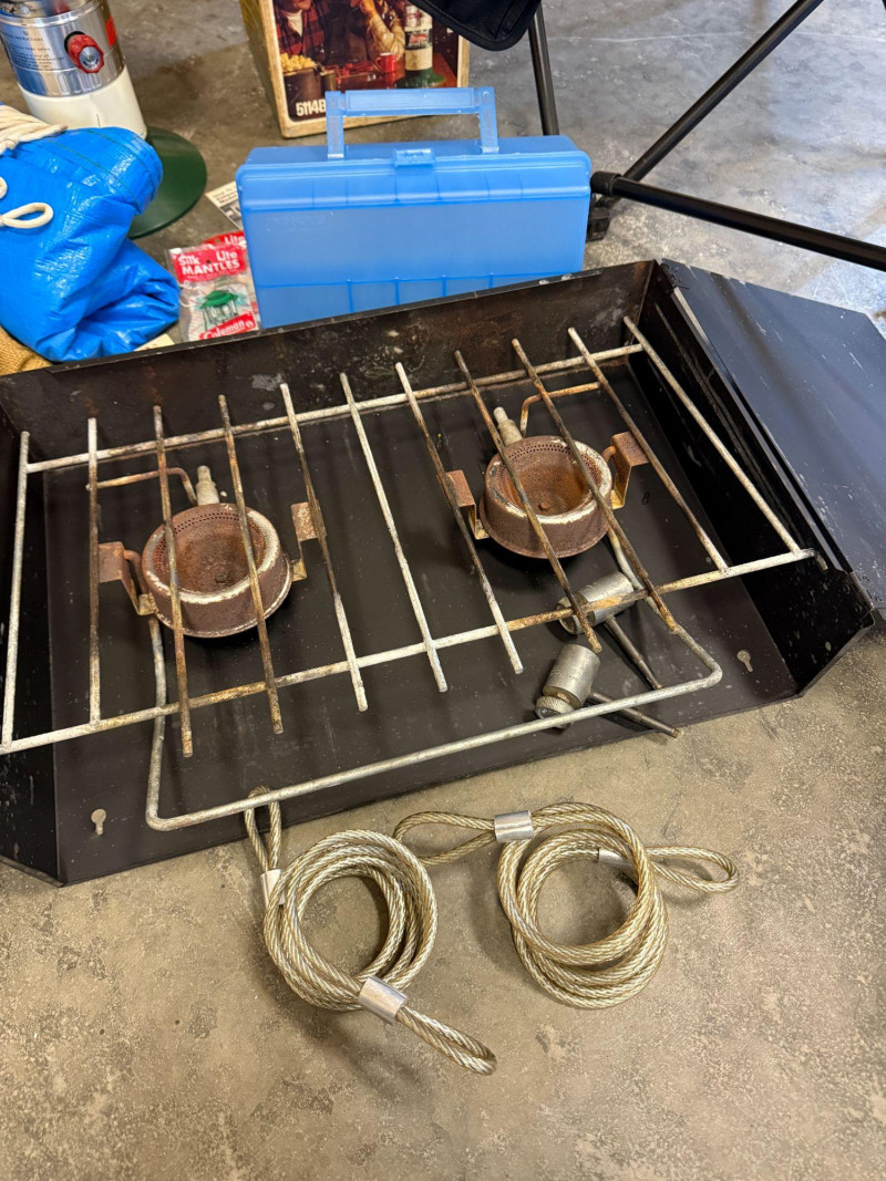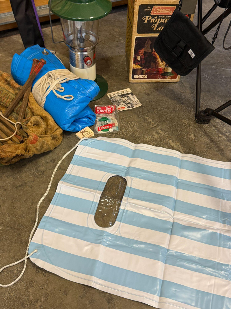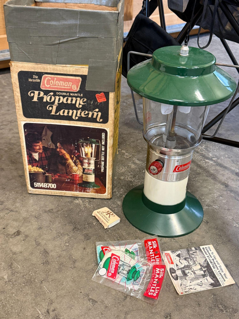 Coleman outdoor equipment has been widely used by campers and outdoors enthusiasts since the early 20th century. Propane lanterns and camp stoves such as those included in this lot became standard gear for mid- to late-20th-century camping trips, valued for their reliability and portability in outdoor settings.