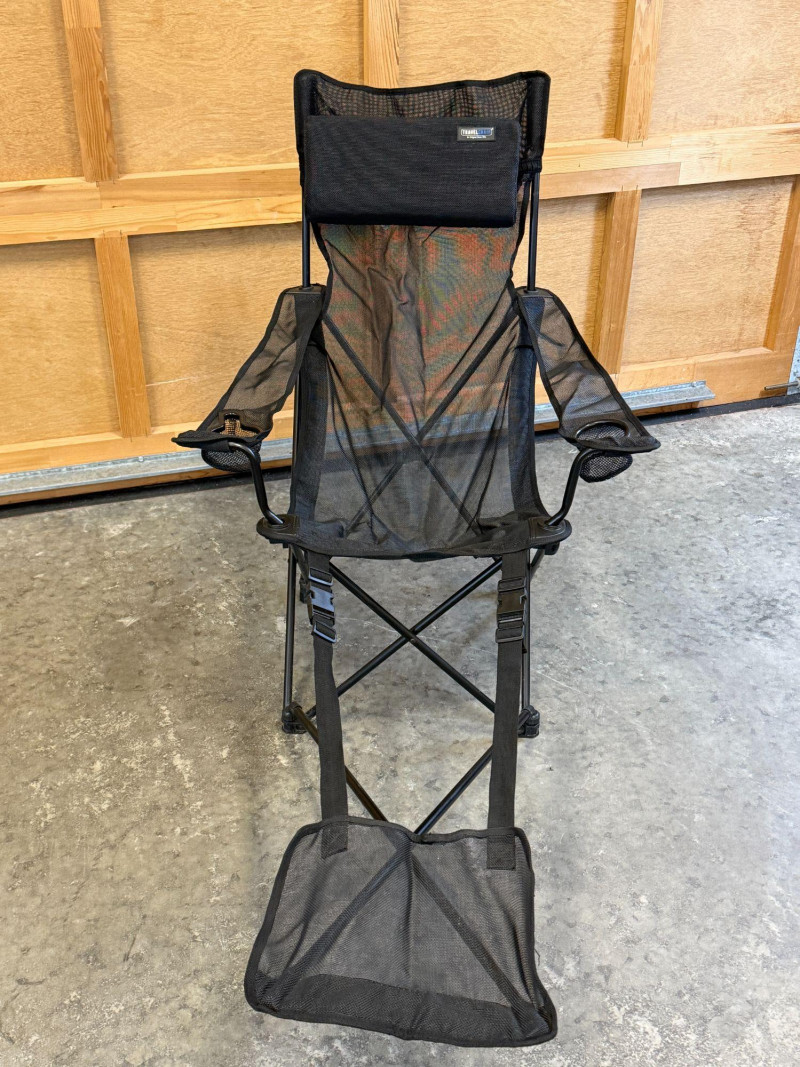 Pre-owned estate items showing wear consistent with age and outdoor use. Some surface wear and light rust on metal components. Chair fabric shows some fraying at the cup holder area. Items are untested and sold as found. Please review photos carefully for overall condition and included items.