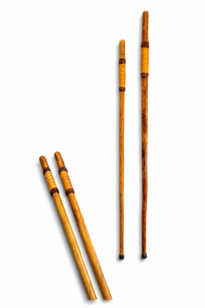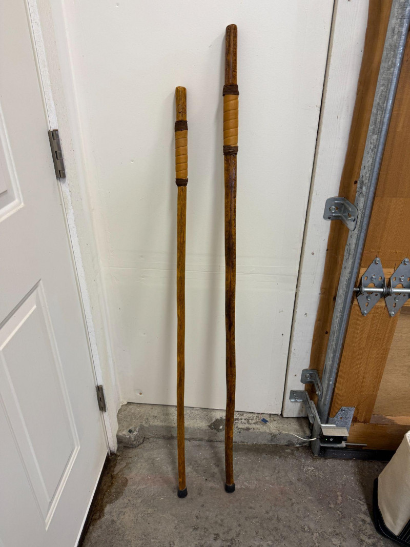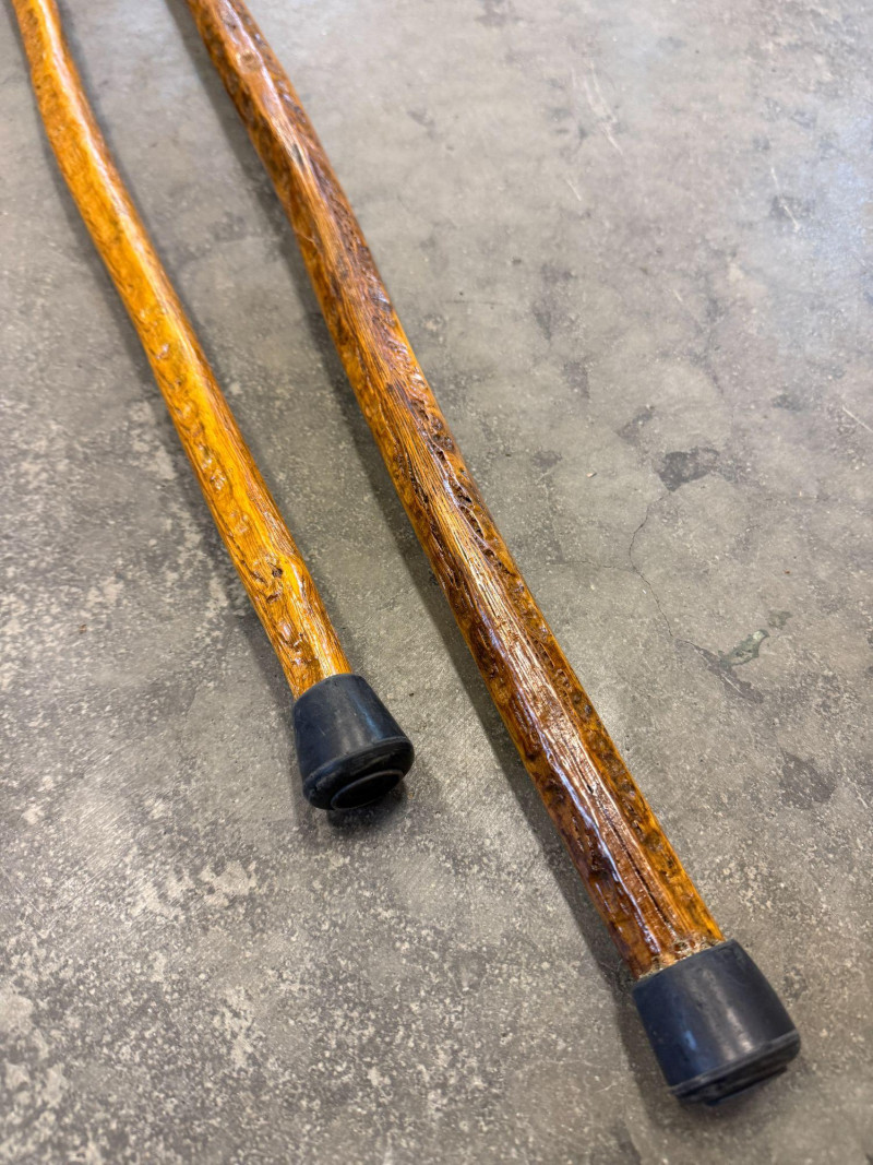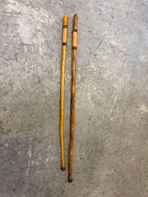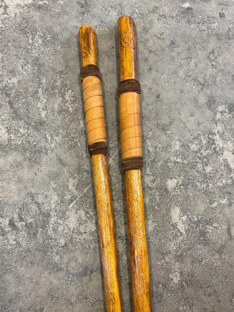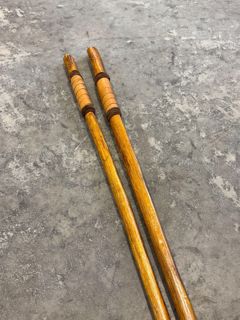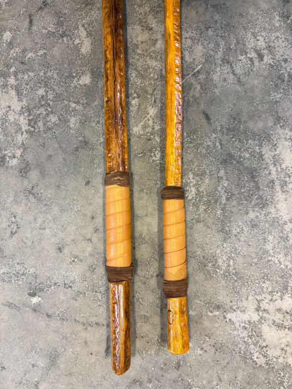 Pre-owned condition with light cosmetic wear consistent with normal use. Wood surfaces show natural grain and carved texture with minor handling marks. Leather grips appear intact. Rubber tips present on both sticks.
