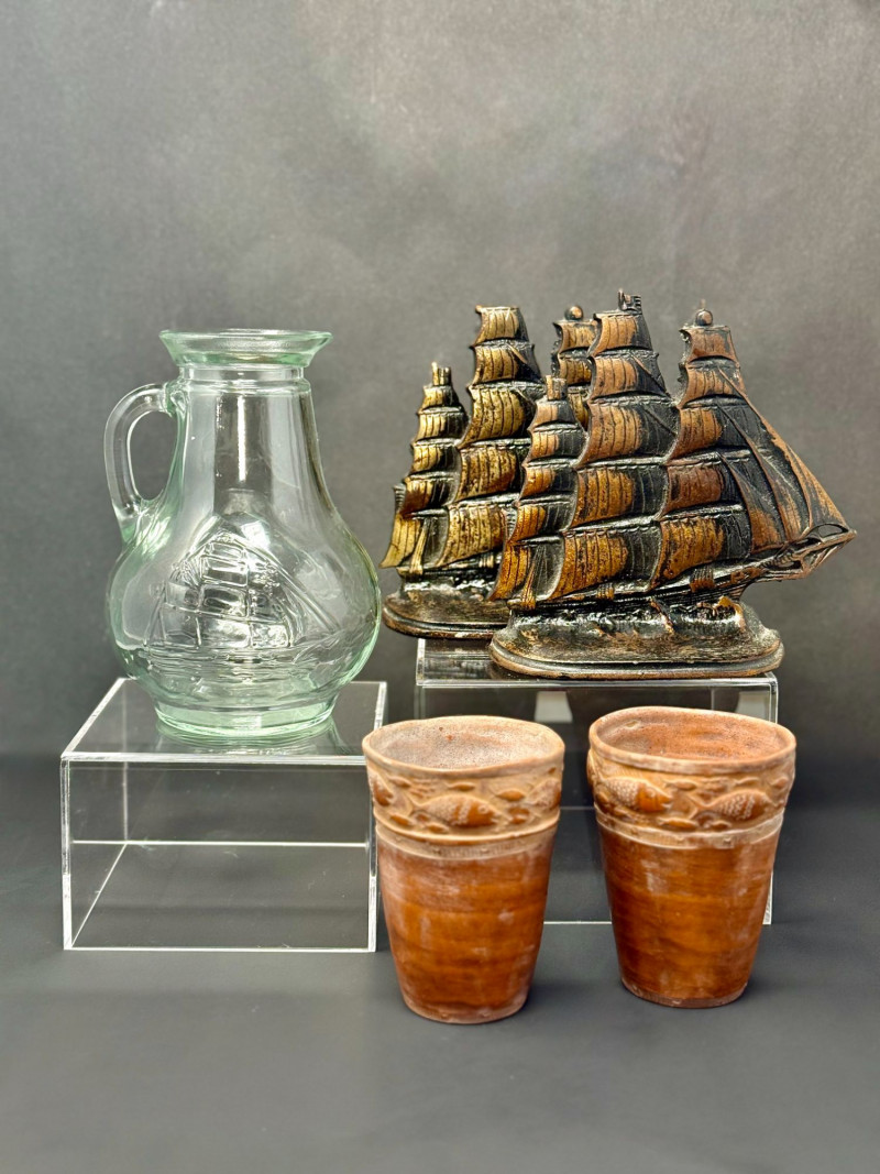 Vintage Nautical Clipper Ship Bookends with Embossed Glass Pitcher & Terracotta Cups Lot This curated vintage nautical lot features a pair of brass clipper ship bookends paired with an embossed glass pitcher and matching terracotta cups. Together, the pieces create a cohesive maritime display blending traditional seafaring motifs with mid-century decorative charm. The brass bookends depict classic American clipper ships with detailed sails and hulls, cast in a warm brass tone and mounted on weighted bases. These sculptural bookends reflect early 20th-century fascination with maritime history and were often used as statement accents in libraries, offices, and coastal homes. Accompanying the bookends is a clear glass pitcher embossed with a sailing ship motif, likely produced by Federal Glass in the mid-20th century. Nautical glassware such as this was popular for casual entertaining and summer table settings, especially in seaside and lakeside interiors. Completing the lot are two terracotta cups featuring raised decorative bands with marine-inspired detailing. Their earthy tone and handcrafted appearance provide a grounded contrast to the glass and metal elements, adding warmth and texture to the overall grouping. Together, these pieces offer a unified nautical theme while showcasing a mix of materials, periods, and functional décor. Dimensions: Condition: Notes: Estimated Value: