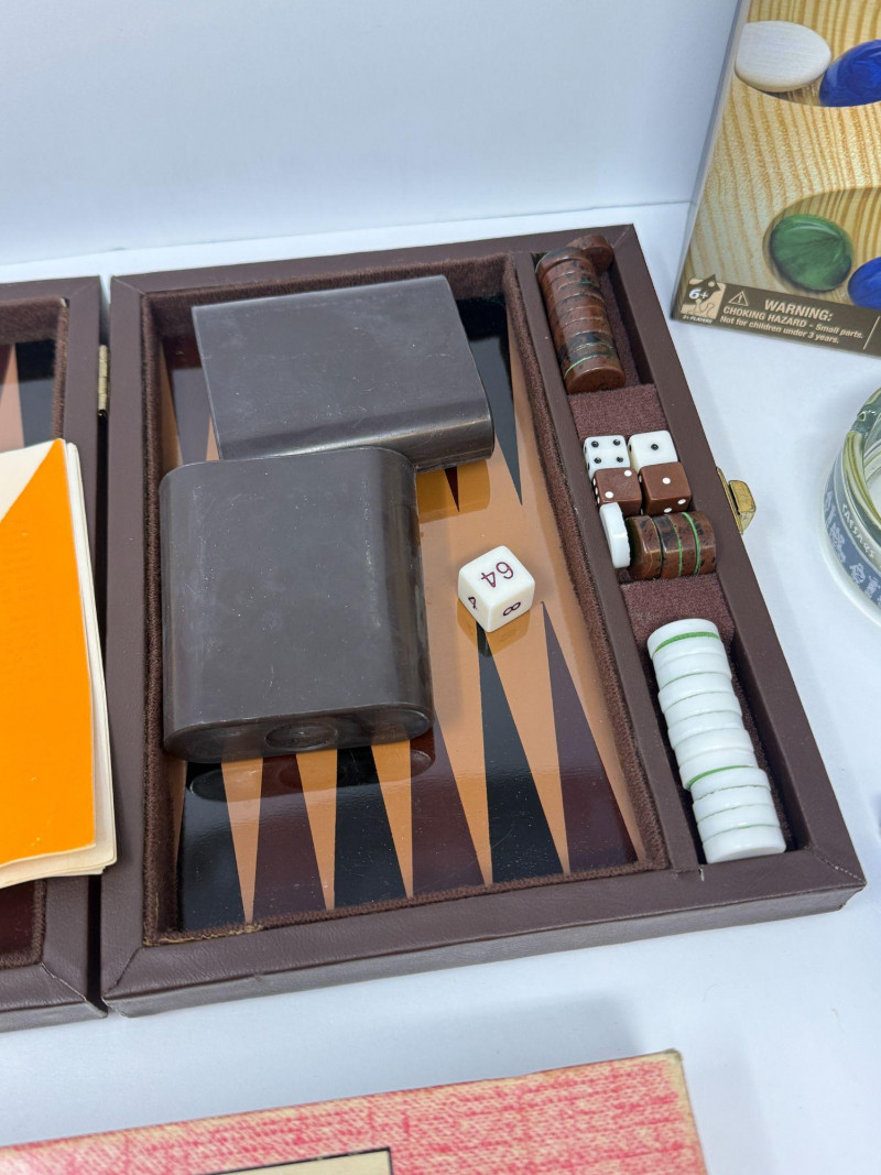 Pre-owned vintage condition. Boxes show wear consistent with age and storage. Backgammon set appears to include pieces and dice. Other games appear largely complete but contents have not been fully verified.