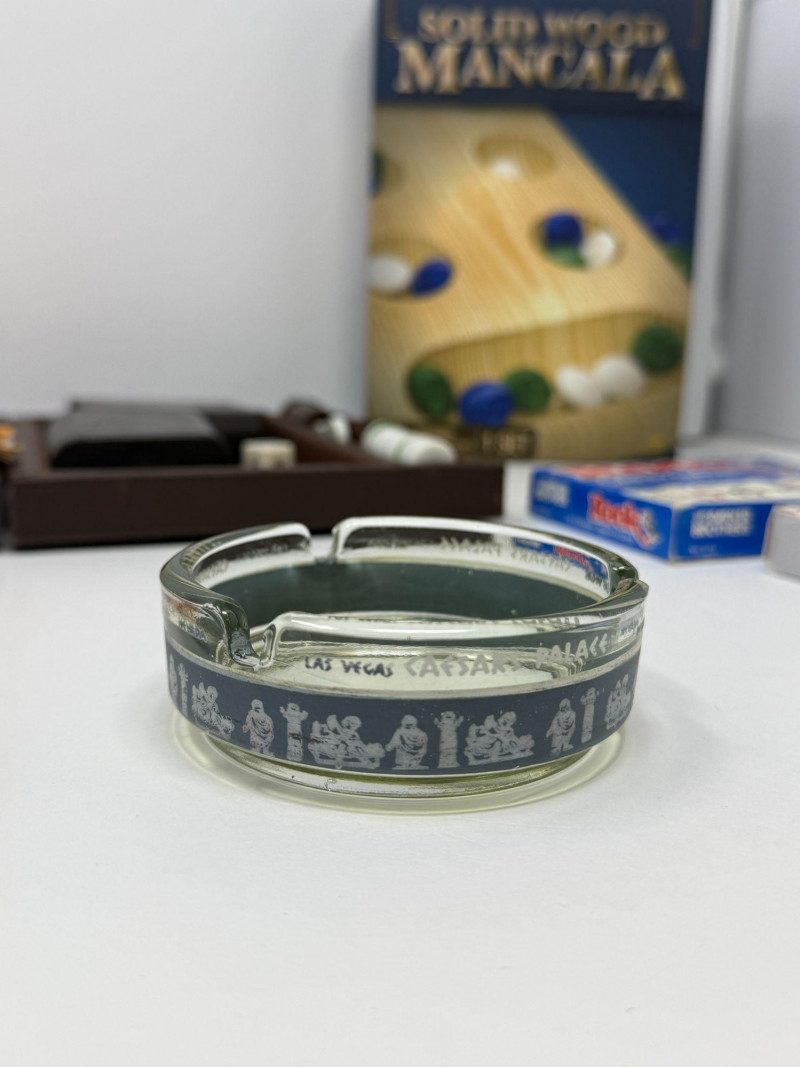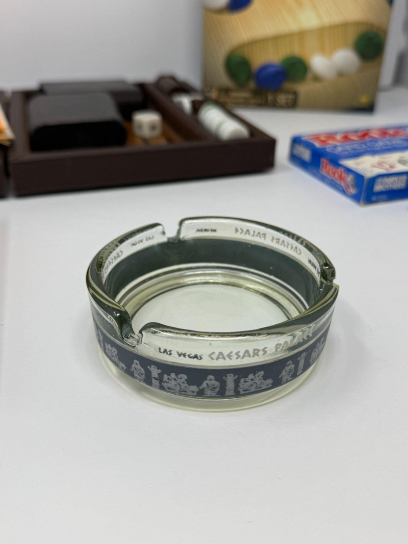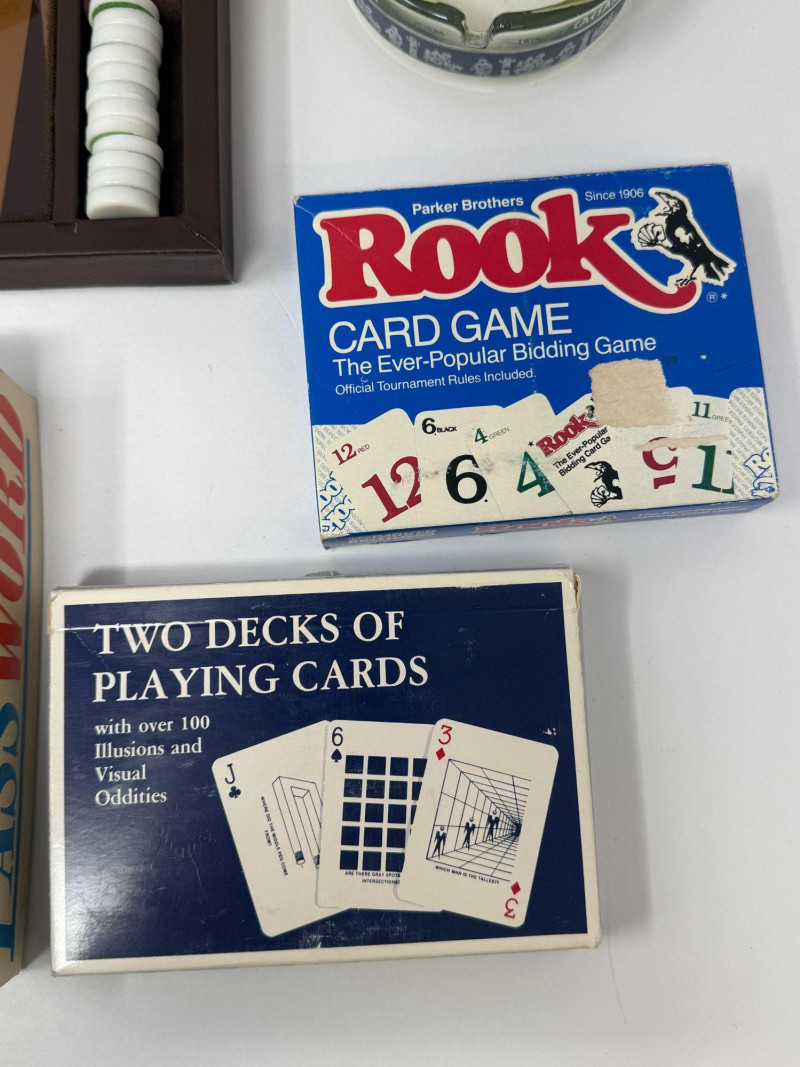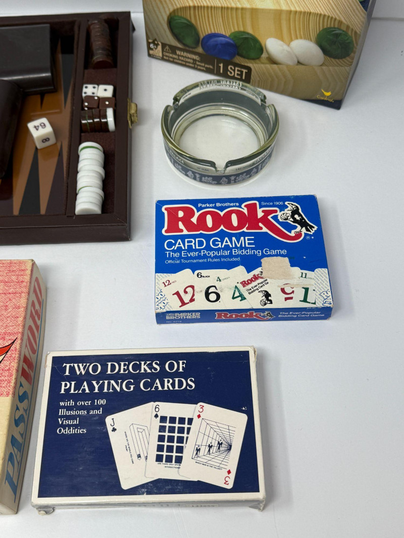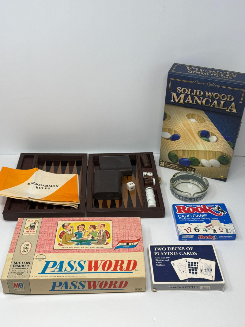 Vintage Board Games Lot – Backgammon, Password, Rook Mixed vintage board game and tabletop game lot featuring several classic family games and accessories. This collection includes a folding backgammon set with pieces and dice, the classic Milton Bradley “Password” board game, a Parker Brothers Rook card game, a solid wood Mancala game set, a two-deck playing card set with visual illusions, and a Las Vegas Caesars Palace glass ashtray. These classic tabletop games were popular family entertainment pieces from the mid-20th century through the late 20th century and remain collectible for nostalgia, décor, and casual gameplay. Vintage game lots like this are popular with collectors, game enthusiasts, and those looking for retro game night sets, typically bringing $40–$100 depending on condition and completeness. Measurements (Approximate): Condition: Historical Note: