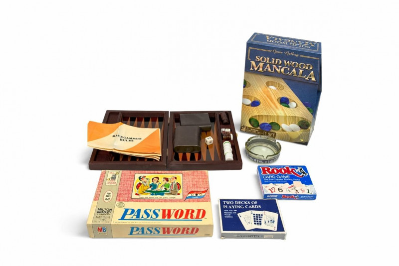Games like Password (1960s Milton Bradley) and Rook (Parker Brothers, early 20th century) were staples of American family game nights. Backgammon and Mancala are much older strategy games with origins dating back thousands of years across Europe, the Middle East, and Africa, making them enduring classics of tabletop gaming.