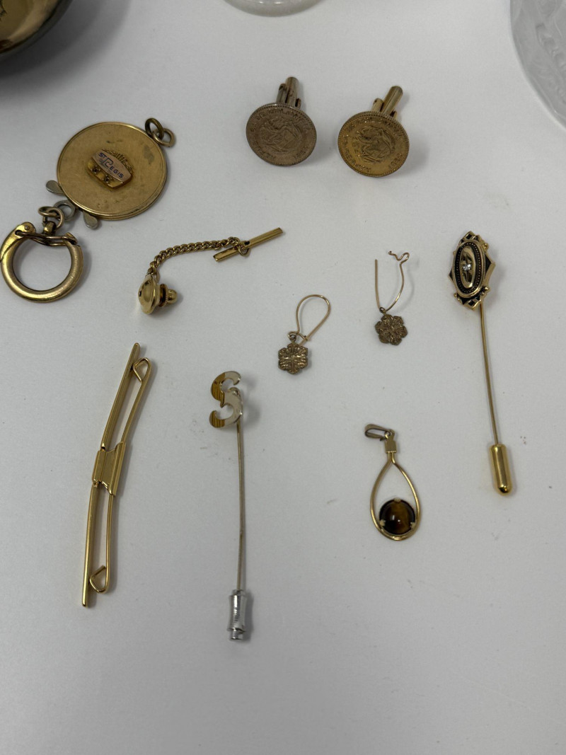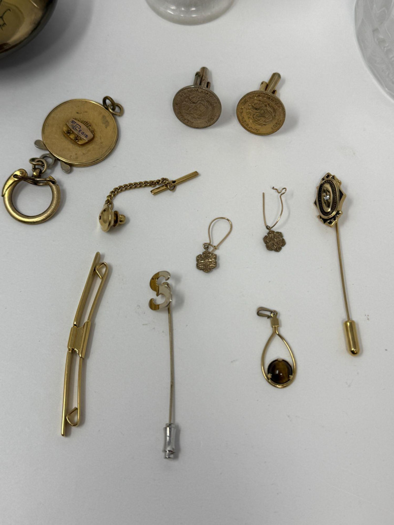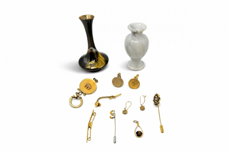 Vintage Jewelry & Vase Lot – Pins, Cufflinks, Marble Mixed vintage decorative and jewelry lot featuring a combination of small collectibles, accessories, and decorative vases. This assorted grouping includes gold-tone jewelry pieces, cufflinks, earrings, tie accessories, and two small decorative vases. Items appear to include stick pins, brooch-style pins, cufflinks, earrings, a tie tack with chain, and other small gold-tone accessories. The lot also features a white marble or alabaster vase and a decorative metal bud vase with engraved scene. Mixed collectible lots like this are popular with vintage jewelry collectors, crafters, and resale buyers looking for wearable pieces, parts, or display items. Measurements (Approximate): Condition: Historical Note: