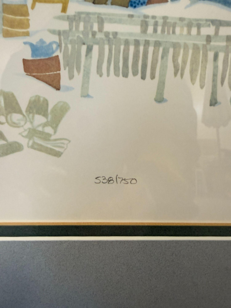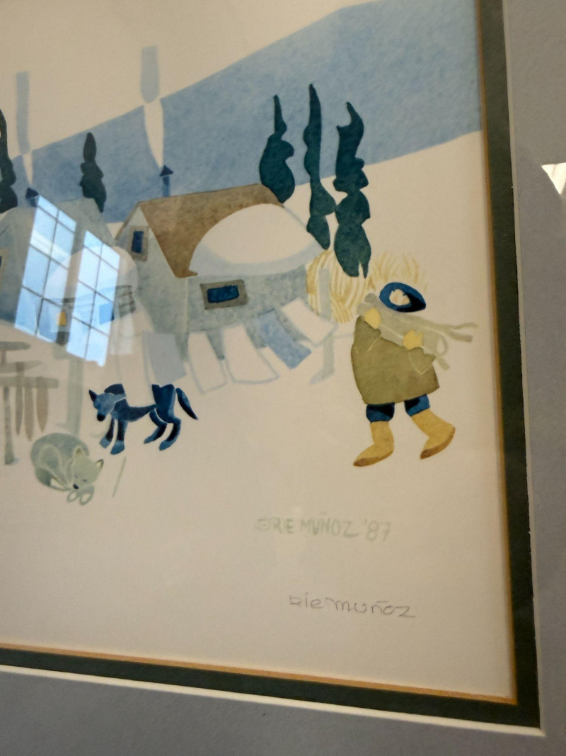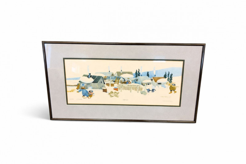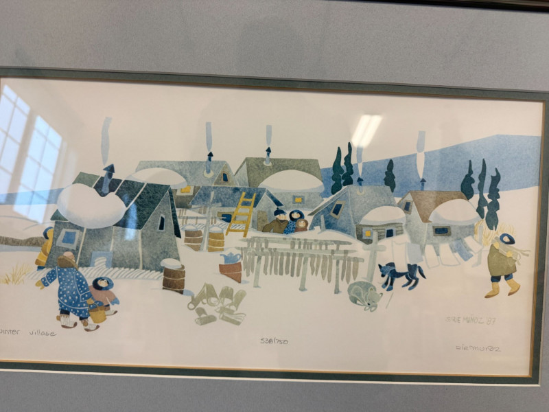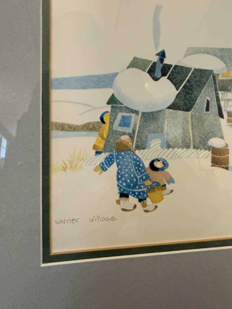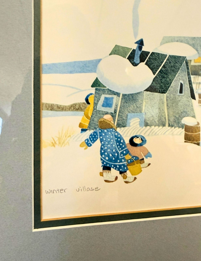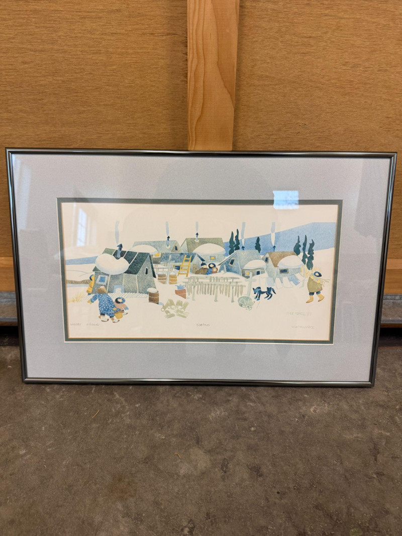 Rie Munoz Winter Village Print Signed & Numbered Framed limited edition print titled “Winter Village” by Rie Munoz, dated 1987. The artwork depicts a charming winter village scene with homes, villagers, and animals in a snowy landscape rendered in Munoz’s distinctive folk-art style. The print is hand signed by the artist and numbered 538/750, making it part of a limited edition series. Rie Munoz was a well-known Alaskan artist and illustrator, celebrated for her warm and whimsical depictions of village life, especially scenes inspired by Alaska Native and rural Alaskan communities. Her works are widely collected and displayed in homes and galleries throughout Alaska and beyond. Details: Title: Winter Village Artist: Rie Munoz Year: 1987 Signed: Yes (hand signed lower right) Numbered: 538/750 Medium: Limited edition print Framed and matted under glass Approximate Size: Condition: Note: