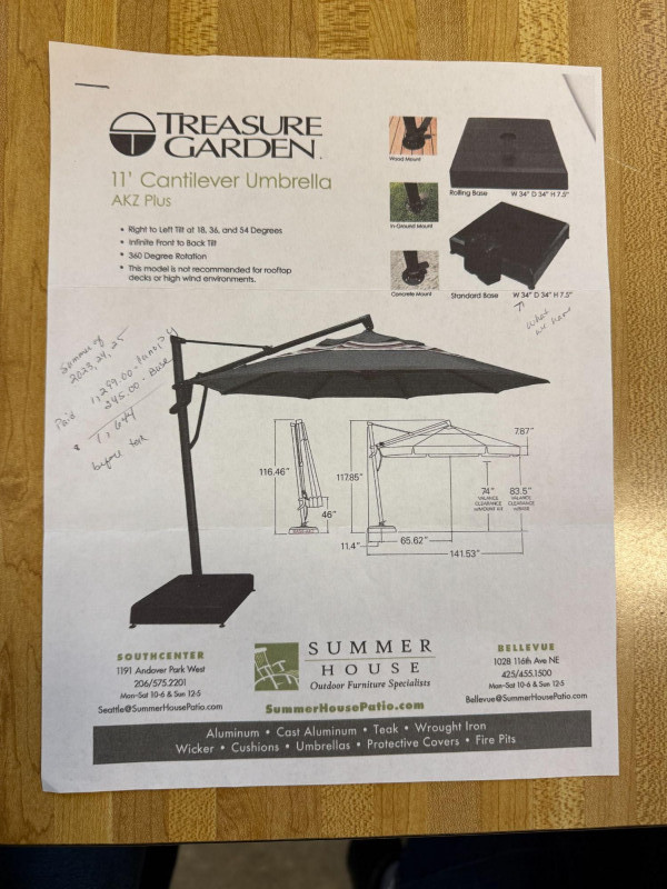 Treasure Garden AKZ Plus 11' Cantilever Patio Umbrella with Weighted Base High-quality Treasure Garden AKZ Plus 11' Cantilever Umbrella, a premium outdoor shade system designed for large patios, decks, and poolside seating areas. This professional-grade offset umbrella features a side-mounted cantilever design, allowing full shade coverage without a center pole obstructing furniture. The durable aluminum frame supports a large 11-foot canopy and includes the AKZ Plus system with infinite front-to-back tilt and full 360-degree rotation, allowing the umbrella to be repositioned throughout the day to track the sun. The umbrella mounts into a heavy weighted rolling base, providing stability while allowing repositioning on patios or decks. Treasure Garden umbrellas are known for their commercial-quality construction and long lifespan, making them a preferred brand for resorts, restaurants, and luxury residential outdoor spaces. Brand: Treasure Garden – AKZ Plus Series (Treasure Garden is one of the leading manufacturers of high-end outdoor umbrellas used in hospitality and residential settings). Measurements: Approx. 11 ft canopy span. Height approx. 116.5" when closed. Base footprint approx. 34" x 34". Designed to cover large outdoor seating areas. Features: Condition: Appears to be in very good pre-owned condition with normal outdoor use. Frame and base appear structurally sound. Canopy fabric appears intact; minor wear consistent with patio use may be present. Buyers are encouraged to review photos for details. Retail / Value Note: New Treasure Garden AKZ Plus 11' cantilever umbrellas typically retail $900–$1,500+ depending on fabric and base configuration, making them one of the premium options in outdoor shade systems. There is a reserve price set as per sellers request