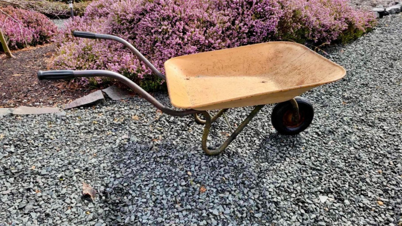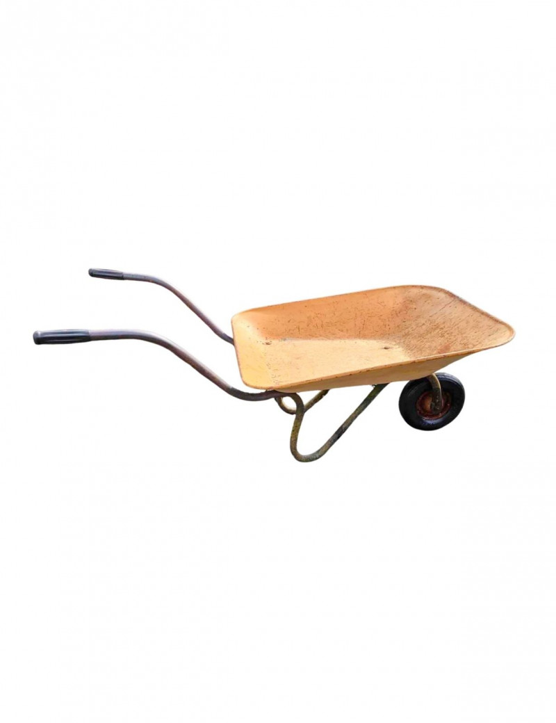 Vintage metal wheelbarrow featuring a classic single-wheel design and aged yellow painted metal tub. This charming rustic piece shows beautiful natural patina from years of outdoor use, making it perfect for farmhouse garden décor, landscaping displays, or repurposed planter arrangements. Vintage wheelbarrows like this are commonly used in cottage gardens, porch displays, and seasonal yard styling. A functional and decorative piece ideal for gardeners, collectors of vintage tools, or anyone looking to add authentic rustic character to their outdoor space.