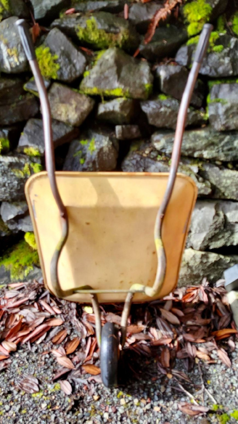 The single-wheel metal wheelbarrow became a staple tool in American gardens and farms throughout the early to mid-20th century. Known for their durability and simple construction, these wheelbarrows were widely used for transporting soil, plants, tools, and building materials. Today, vintage examples are often repurposed as decorative garden planters or farmhouse landscape accents, appreciated for their rustic charm and authentic patina developed over decades of use.