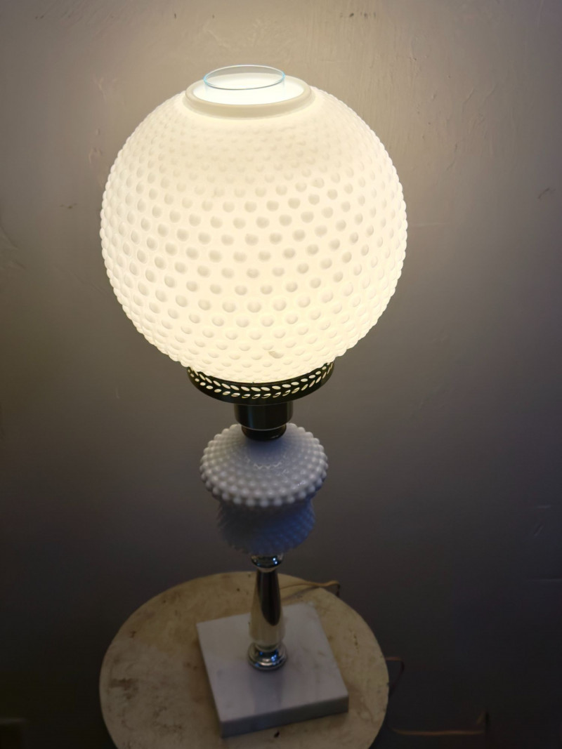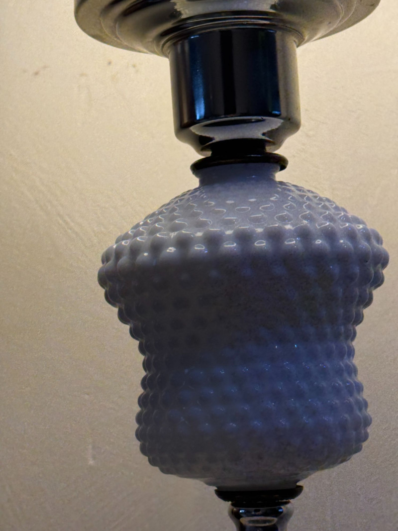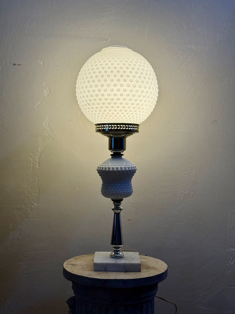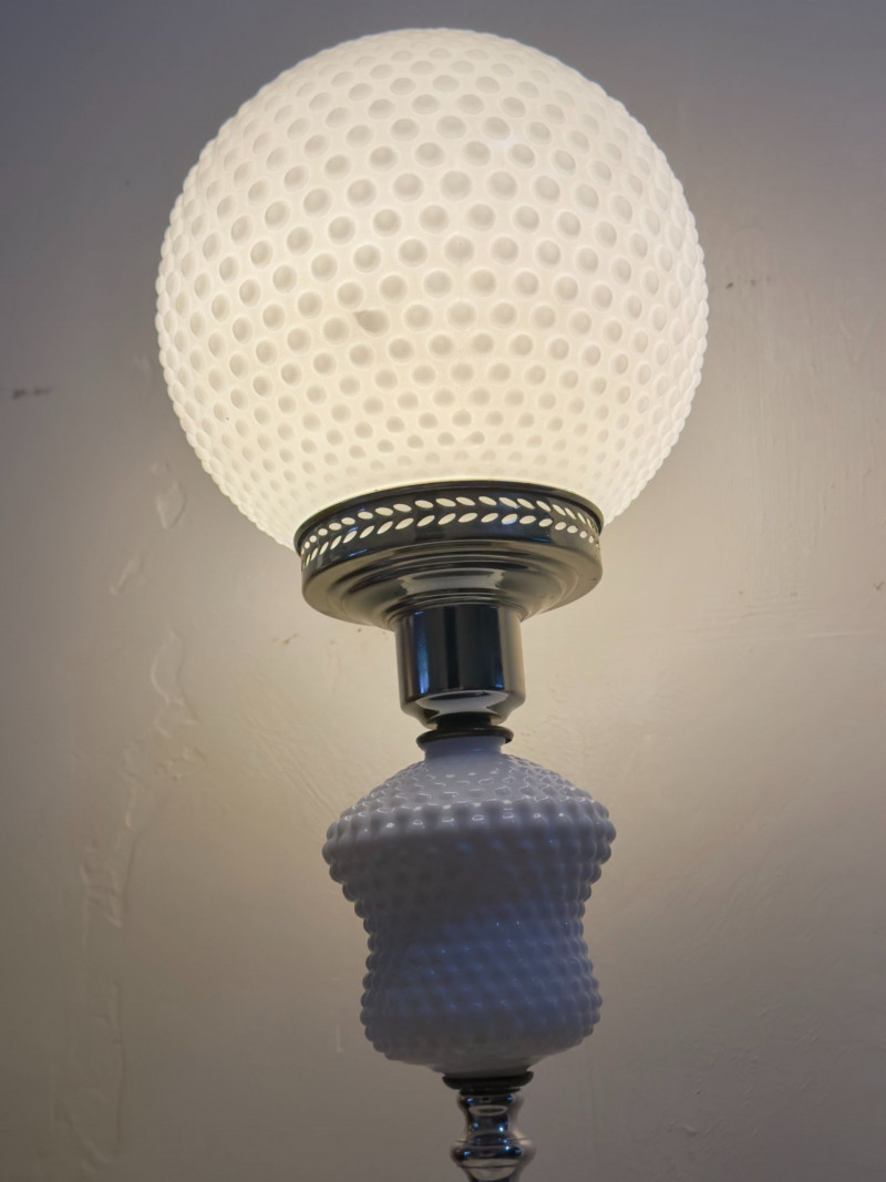 • Hobnail milk glass “Gone With the Wind” lamps became popular in postwar American homes and are now a staple of mid-century lighting collections.