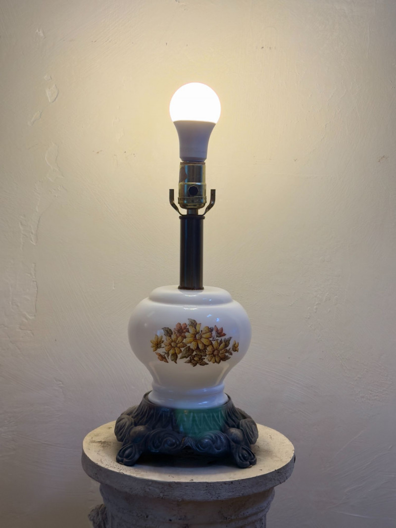 Floral lamp shows expected age-related wear to the base and hardware.