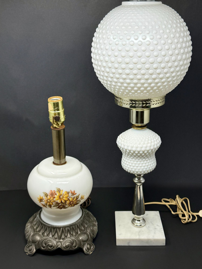 Vintage Milk Glass Hobnail Hurricane Lamp & Floral Table Lamp Lot This curated vintage lighting lot features two distinct table lamps that together showcase classic mid-century American decorative styles. The pairing blends textured milk glass elegance with traditional floral detailing, making it ideal for layered, collected interiors. The first lamp is a tall milk glass hobnail hurricane lamp in the iconic “Gone With the Wind” style. It features a large hobnail globe with a matching hobnail mid-section, brass-tone hardware, and a square marble base. This style became especially popular in the 1950s–1960s and remains highly sought after for its sculptural presence and soft light diffusion. The second lamp is a vintage milk glass table lamp with a floral transfer decoration. It is mounted on an ornate metal base with classical scroll detailing, offering a more traditional aesthetic that complements the cleaner lines of the hurricane lamp. Together, the lamps provide contrast while maintaining a cohesive vintage feel. Dimensions: Condition: Notes: Estimated Value: