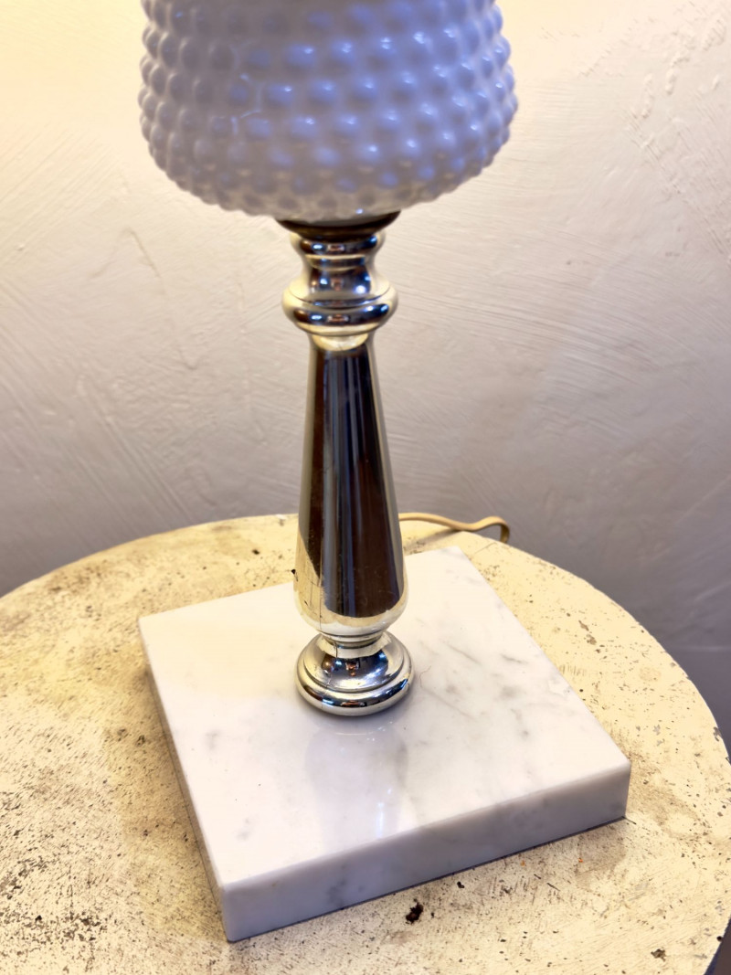 Hobnail lamp shows light wear consistent with age, including minor surface marks to metal components.