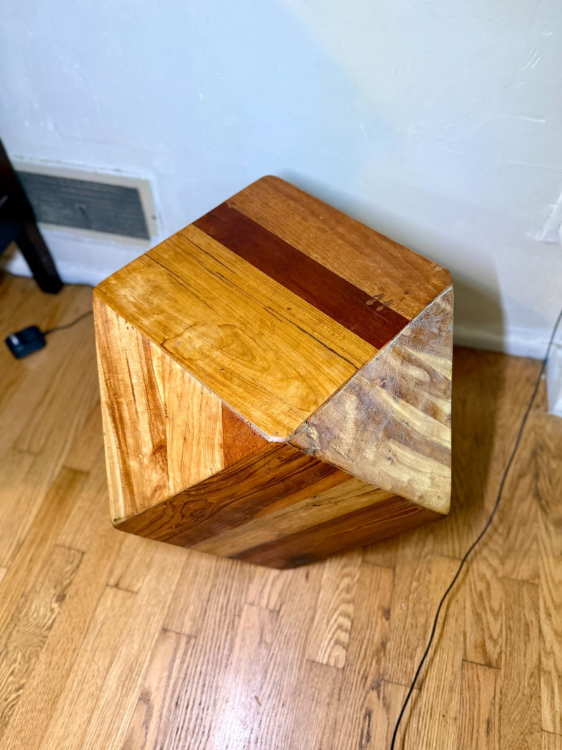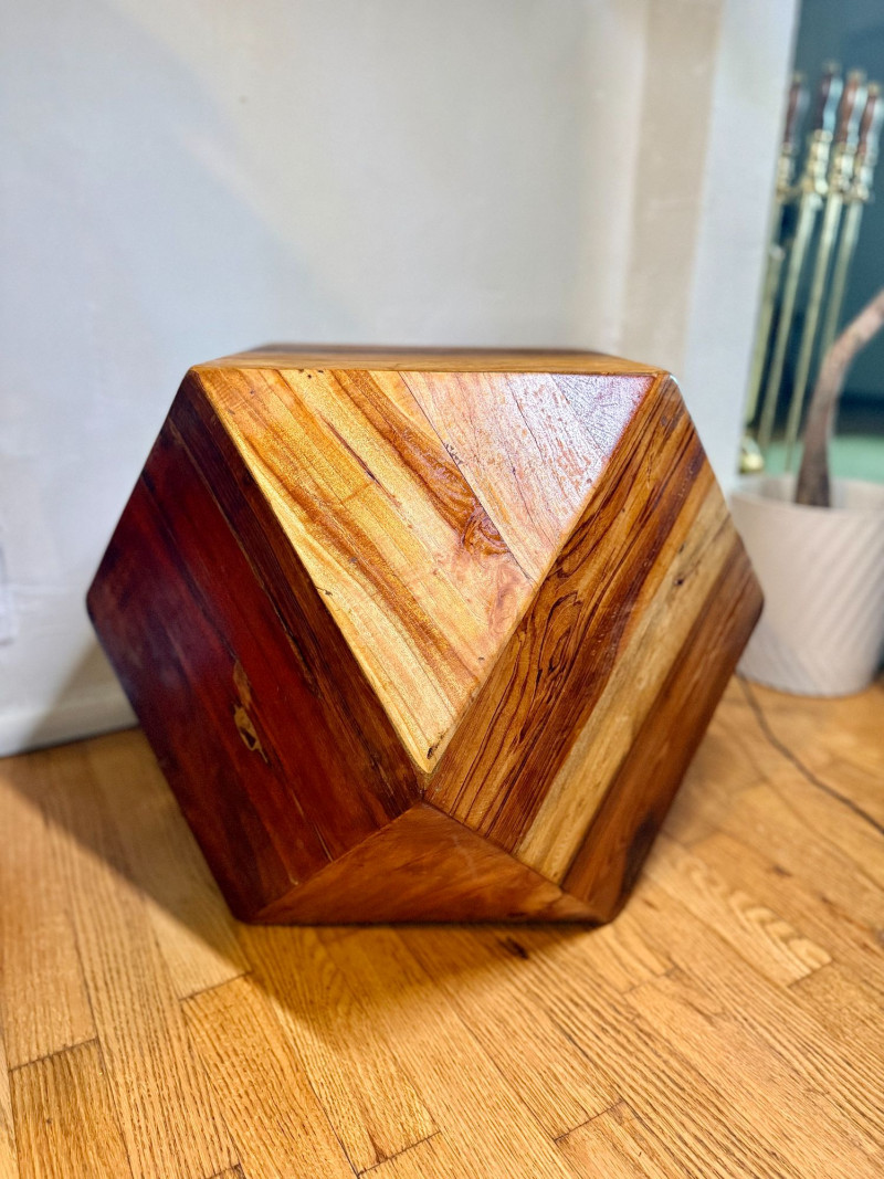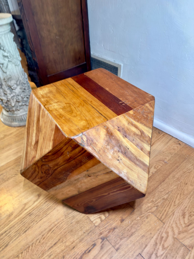 Geometric Reclaimed Wood Faceted Cube Side Table / Stool This sculptural faceted cube is crafted from reclaimed solid wood planks arranged in angular planes, creating a bold geometric form with strong modern presence. The design emphasizes structure, material, and craftsmanship over ornamentation. Each panel features visible grain variation, tonal shifts, and natural markings that highlight the reclaimed nature of the wood. The faceted construction gives the piece depth and movement, allowing it to read differently from every angle. This style became especially popular in modern and mid-century–inspired interiors, where natural materials were paired with architectural forms. Similar examples have been produced by contemporary design houses and studio furniture makers, often as statement side tables or stools. The piece functions equally well as a side table, accent table, pedestal, or low stool. Dimensions: Condition: Notes: Estimated Value: