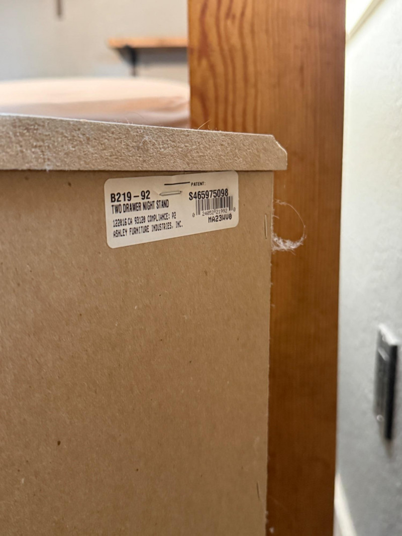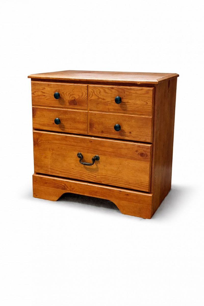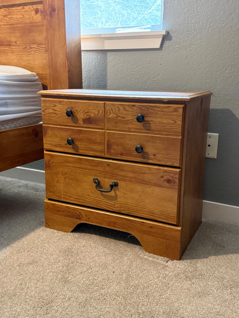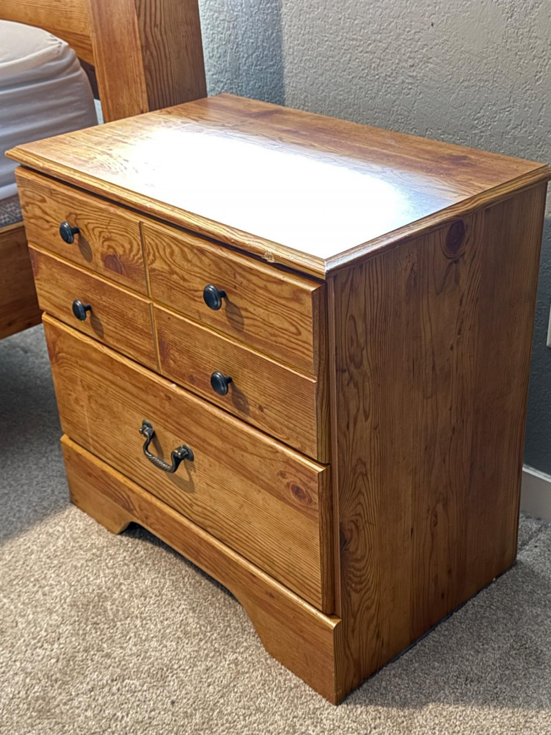 Ashley Furniture Solid Wood Nightstand Rustic solid wood nightstand by Ashley Furniture Industries featuring warm honey-toned wood grain, clean paneled design, and classic farmhouse styling. Includes four small upper drawers and one large lower drawer for versatile storage. Finished with black round knobs and a decorative metal pull for added character. Details: Condition: Measurements (approx.): Value: Style Notes:
