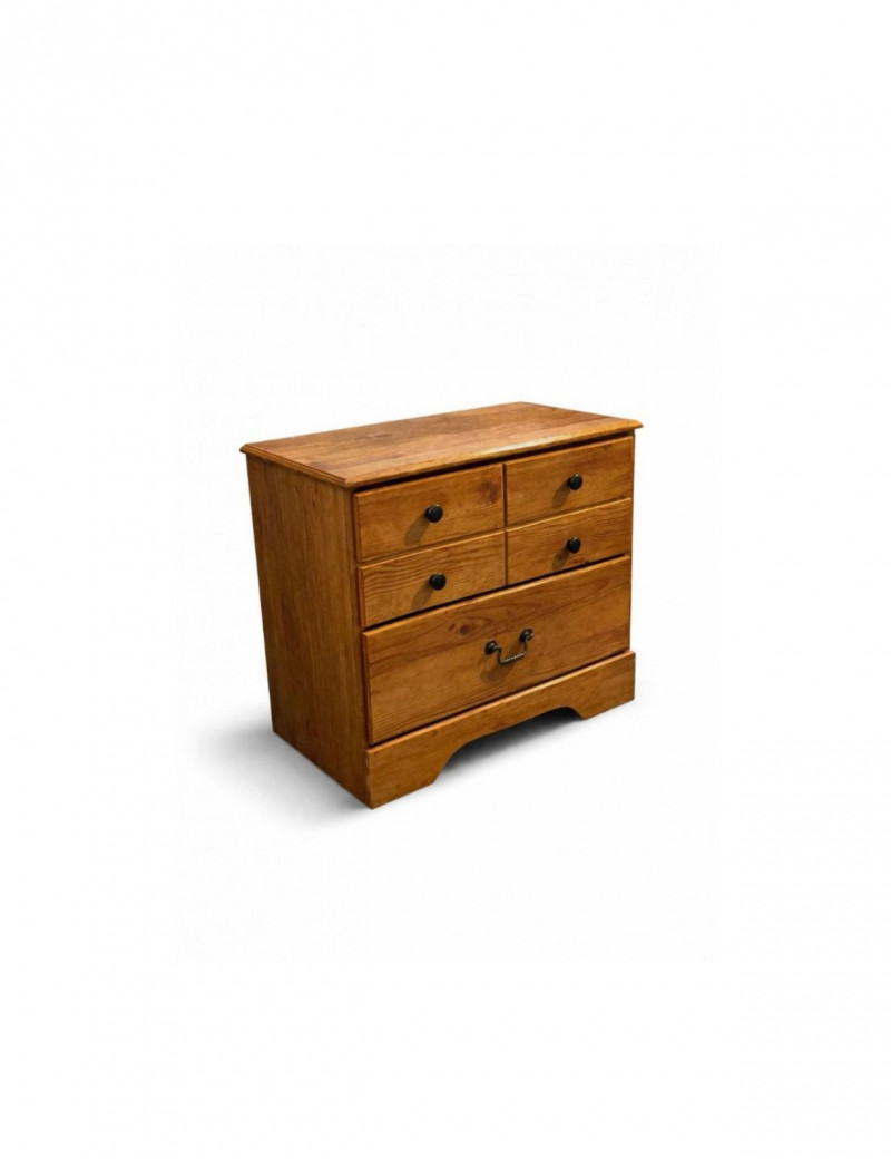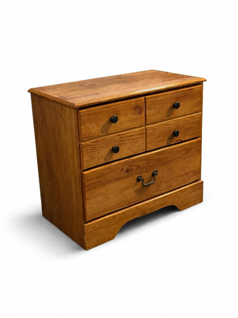 Ashley Furniture Solid Wood Nightstand Rustic solid wood nightstand by Ashley Furniture Industries featuring warm honey-toned wood grain, clean paneled design, and classic farmhouse styling. Includes four small upper drawers and one large lower drawer for versatile storage. Finished with black round knobs and a decorative metal pull for added character. Details: Condition: Measurements (approx.): Value: Style Notes:
