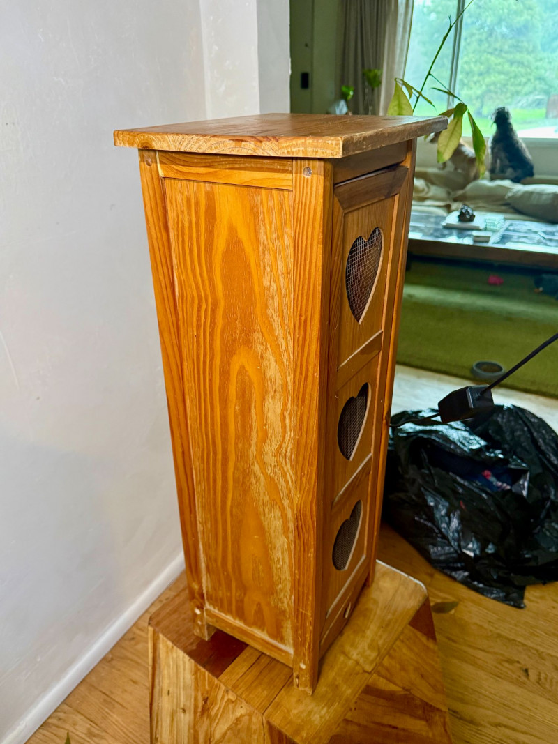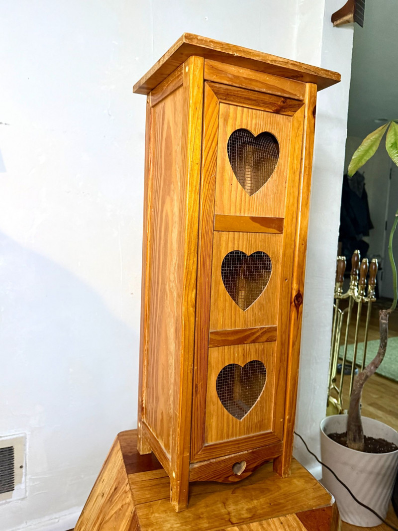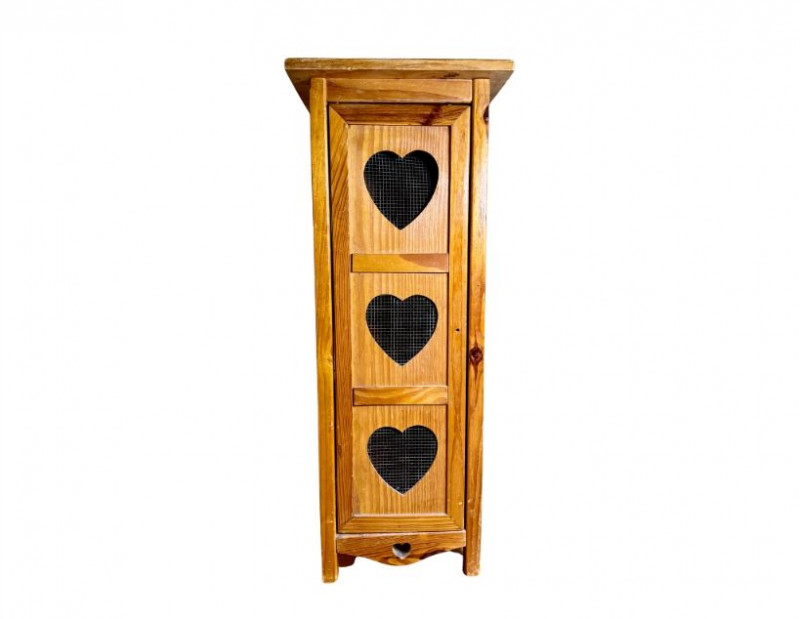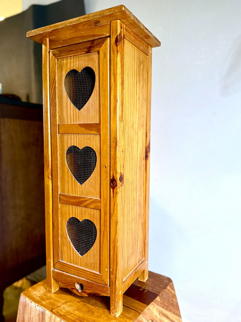 Handcrafted Rustic Pine Storage Cabinet with Heart Cutout Panels Handcrafted solid pine storage cabinet featuring three vertically aligned heart-shaped cutout panels backed with wire mesh. Finished in a warm honey-toned stain that highlights the natural grain, knots, and character of the wood. The narrow vertical form rests on four short legs and is topped with a simple overhanging plank-style crown, giving the piece a balanced rustic silhouette. The heart cutouts serve both decorative and functional purposes, allowing airflow while adding classic folk-art charm. This cabinet is well suited for linen storage, pantry use, bathroom organization, or as a decorative accent in cottage, farmhouse, or European country interiors. The piece offers visual interest without occupying significant floor space, making it ideal for smaller rooms or vertical styling. Type: Narrow standing storage cabinet Estimated Measurements: Historical Note: Value Context: