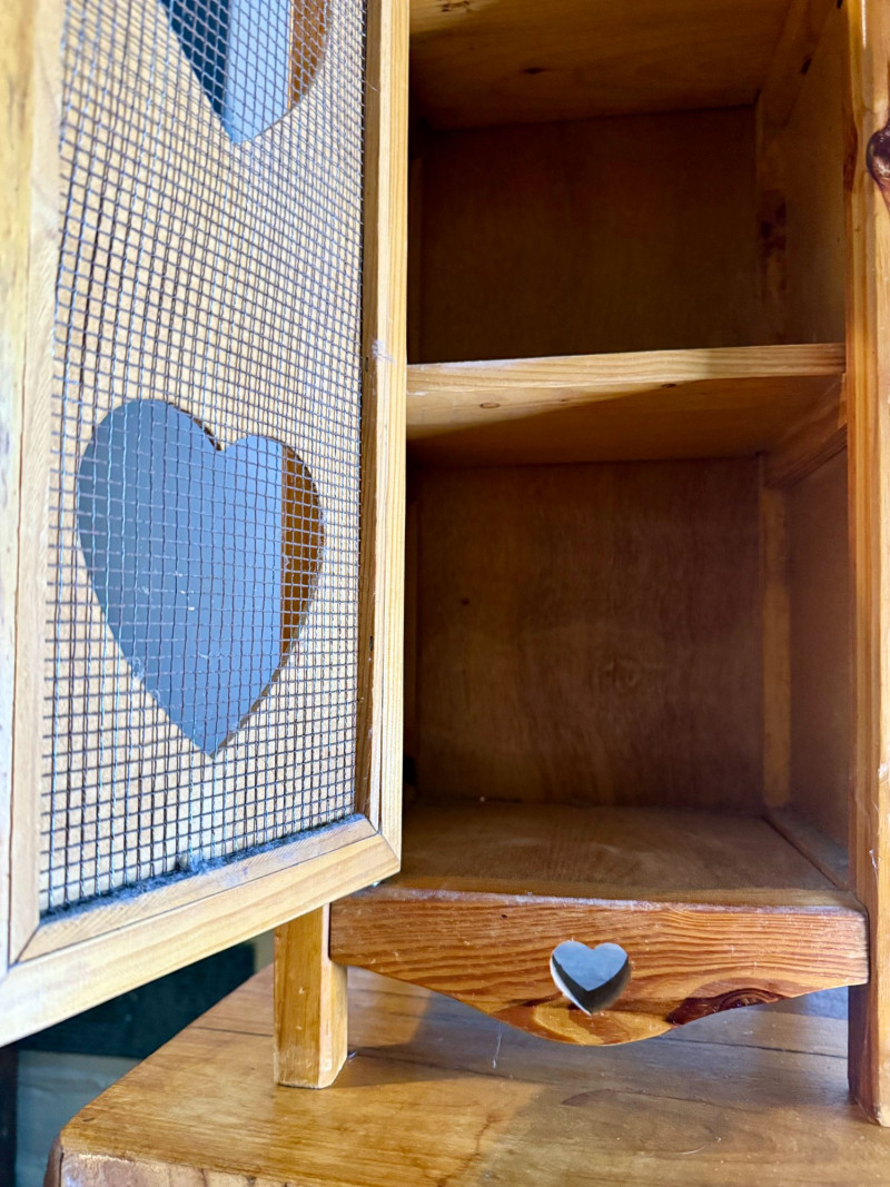 Heart motifs have long been used in European Alpine, Scandinavian, and early American folk furniture as symbols of warmth, hospitality, and home. In utilitarian cabinets, pierced heart panels were often incorporated to improve ventilation for stored linens or pantry items while serving as a decorative identifier of regional craftsmanship.
