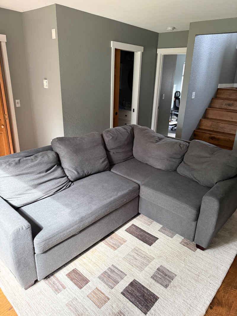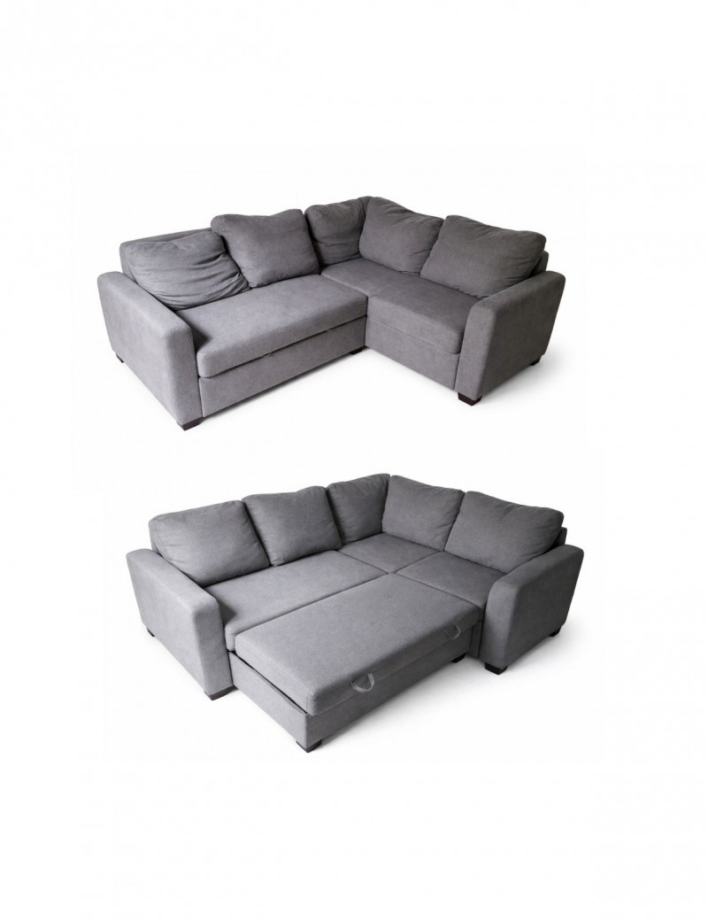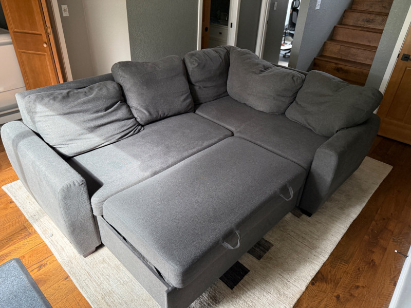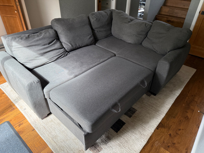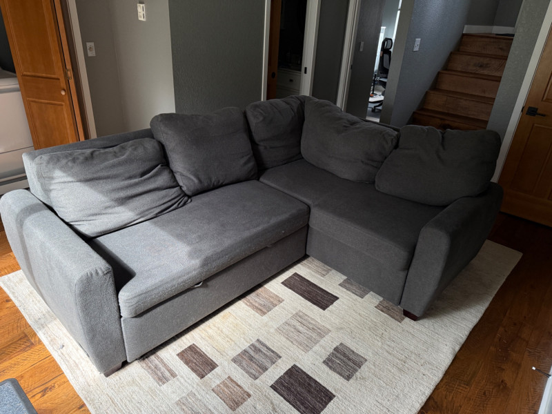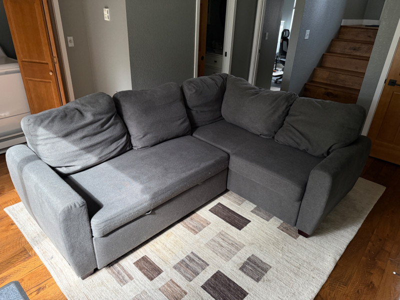 Modern Gray Sectional Sleeper Sofa Comfortable and versatile L-shaped sectional sofa in a neutral gray tone, featuring a pull-out sleeper for added functionality. Clean lines and a low-profile silhouette make it easy to style in any space. Details Approx. Dimensions Condition Notes