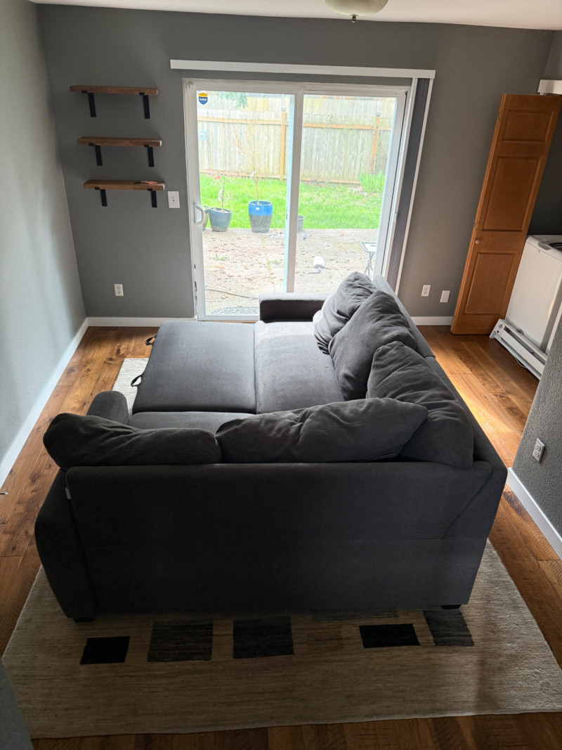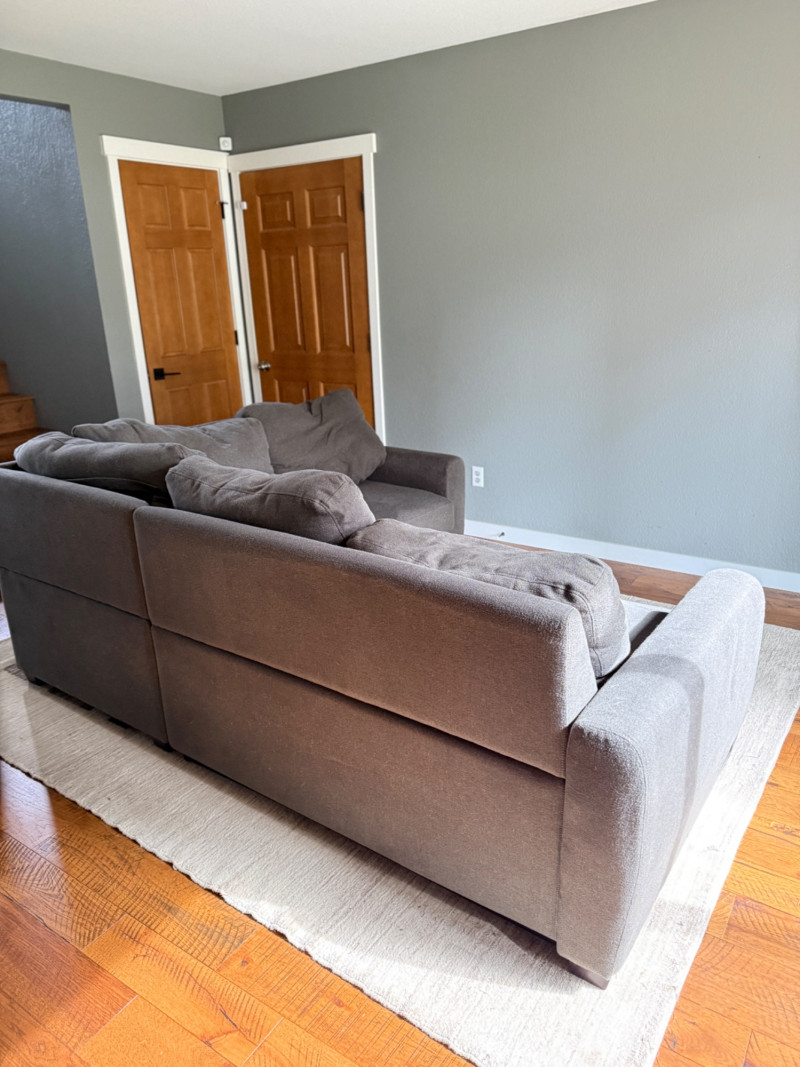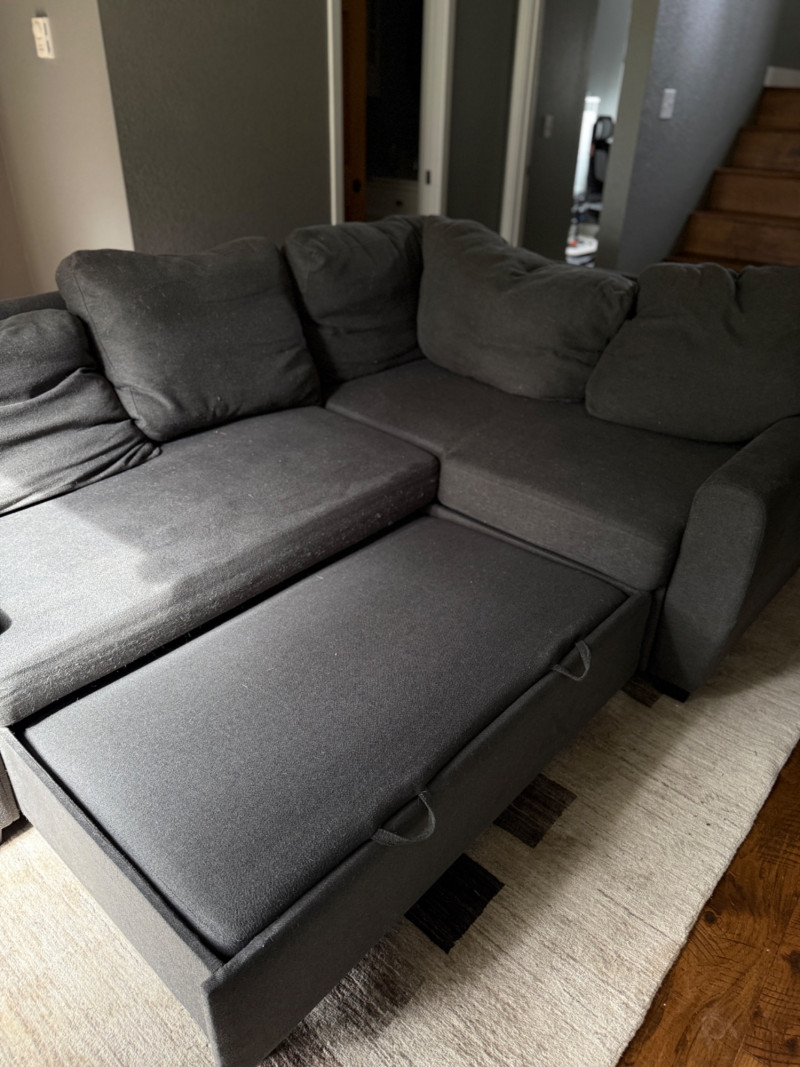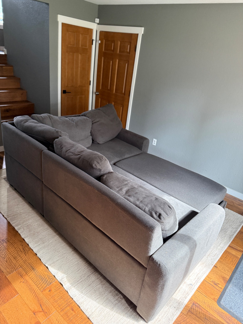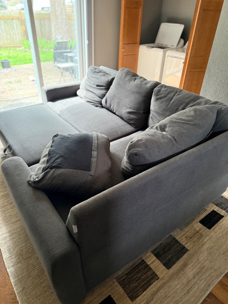 Modern Gray Sectional Sleeper Sofa Comfortable and versatile L-shaped sectional sofa in a neutral gray tone, featuring a pull-out sleeper for added functionality. Clean lines and a low-profile silhouette make it easy to style in any space. Details Approx. Dimensions Condition Notes