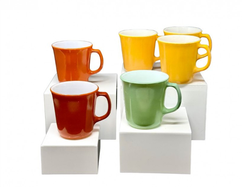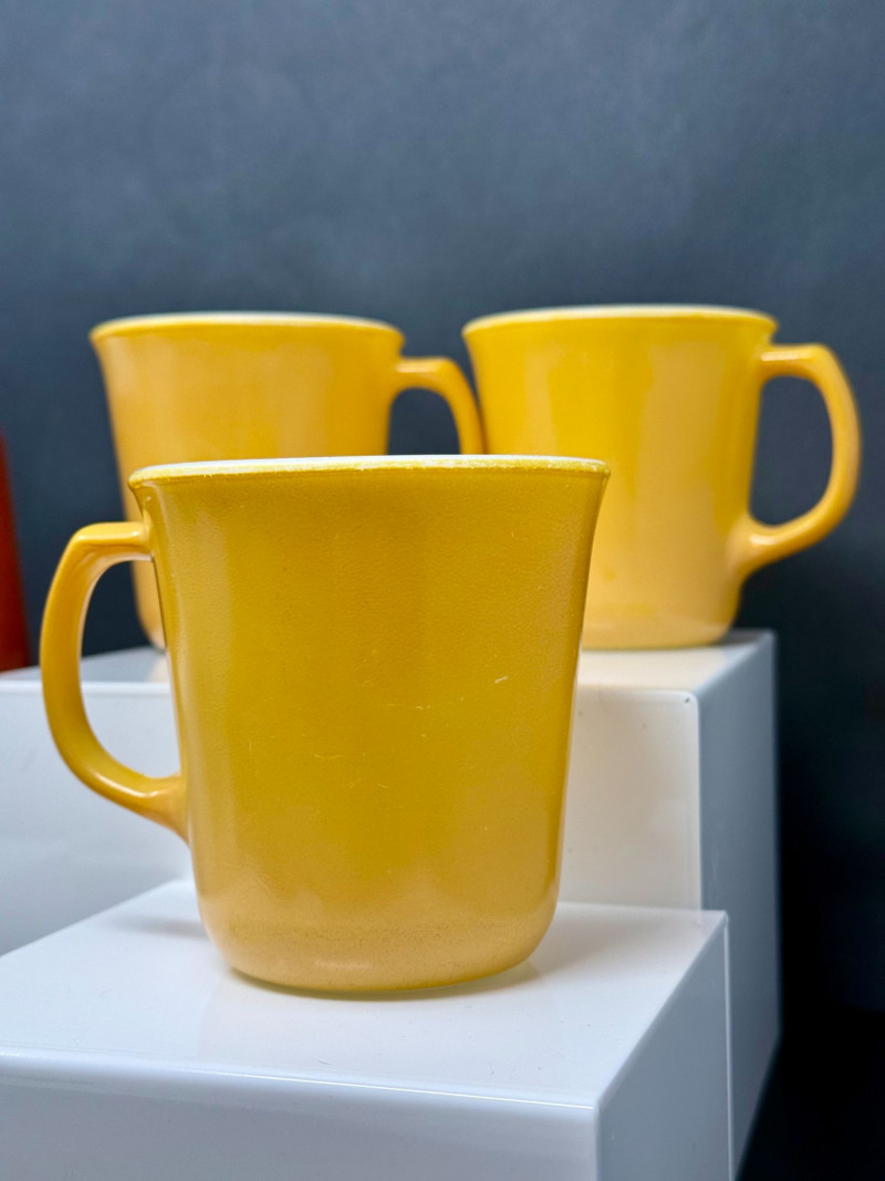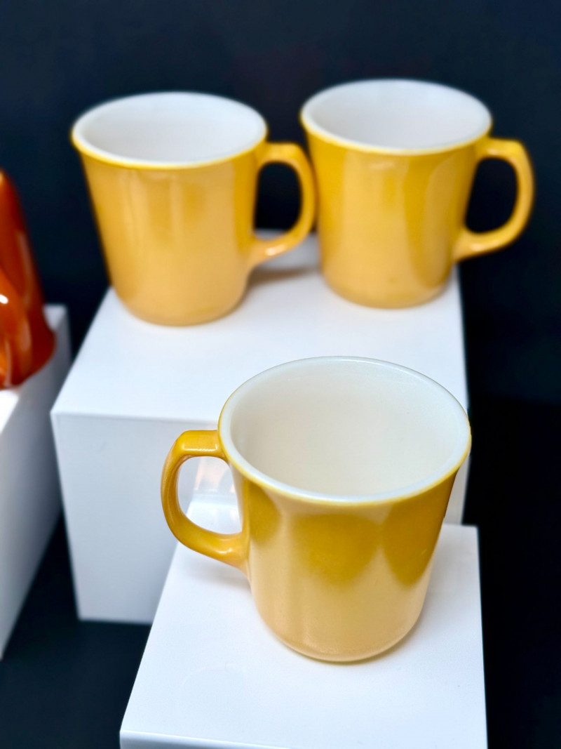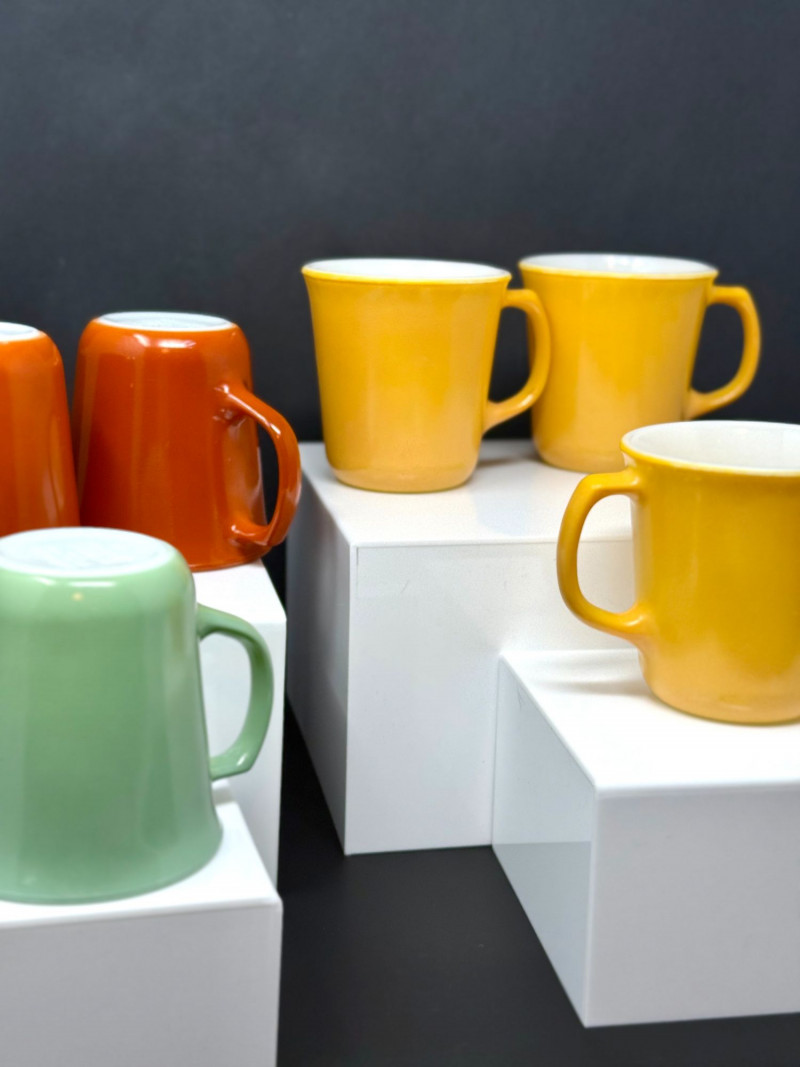 Mid-Century Modern Pyrex and CorningWare Ceramic Coffee Mugs — 6-Piece Assorted Color Set Mid-century modern ceramic coffee mug set featuring a mix of vintage Pyrex and CorningWare examples in classic mid-century colorways. The set includes rich red, green, and orange Pyrex mugs paired with bright yellow CorningWare mugs, all finished with contrasting white interiors and smooth glossy glazes. Each mug features a straight-sided, stackable form with an integrated handle, a design widely used in mid-century kitchens for its practicality and clean modern aesthetic. The saturated color palette reflects the era’s embrace of bold yet earthy tones, making this set equally suited for everyday use, open shelving display, or curated tabletop styling. Type: Coffee mugs (6-piece set) Approximate Measurements (each): Historical Note: Value Context: