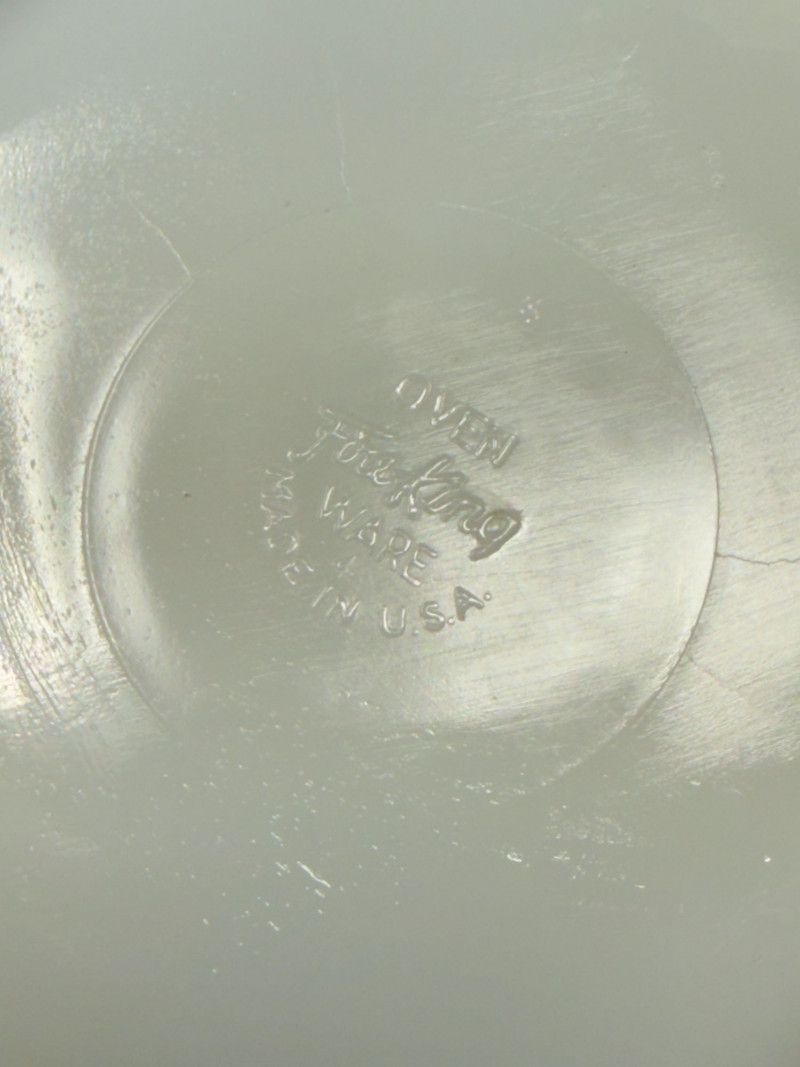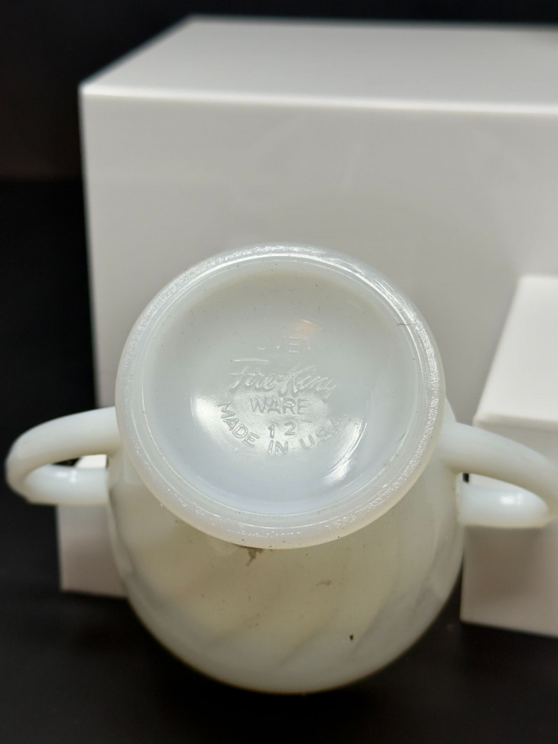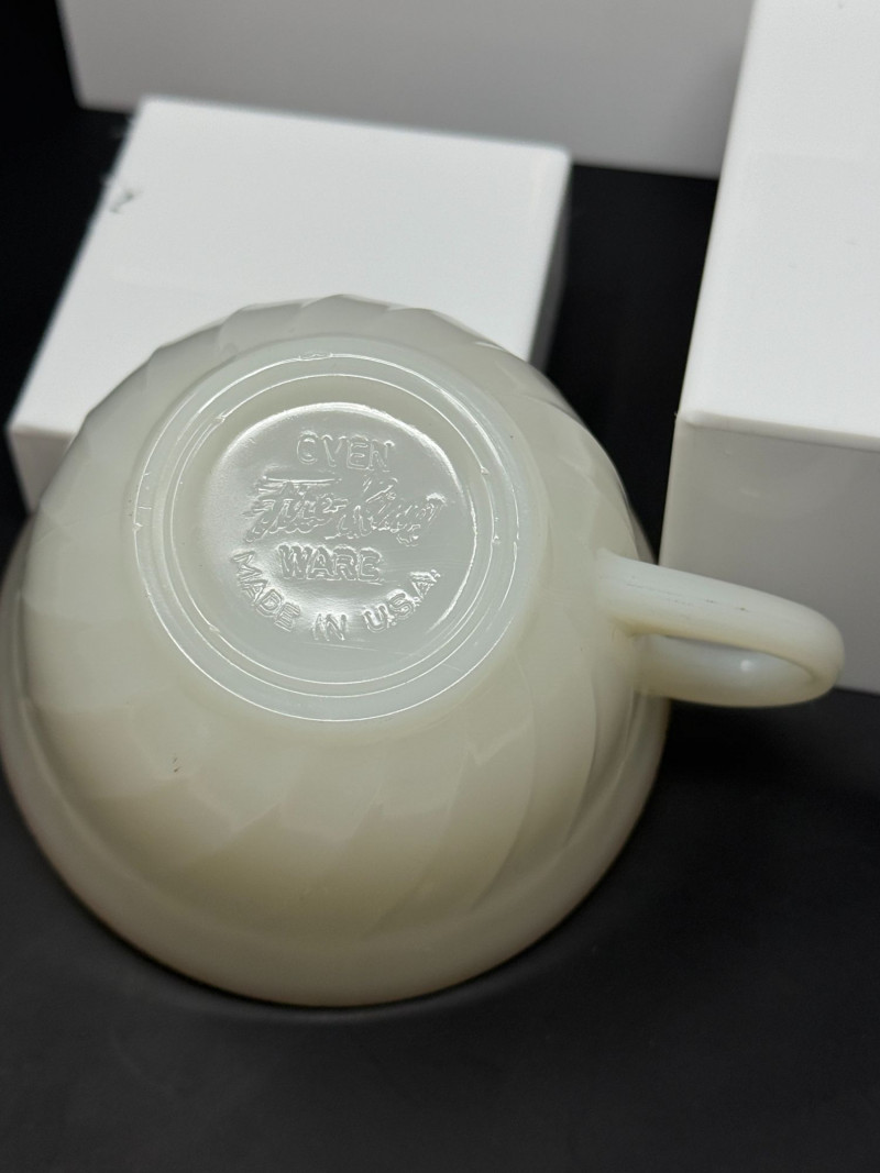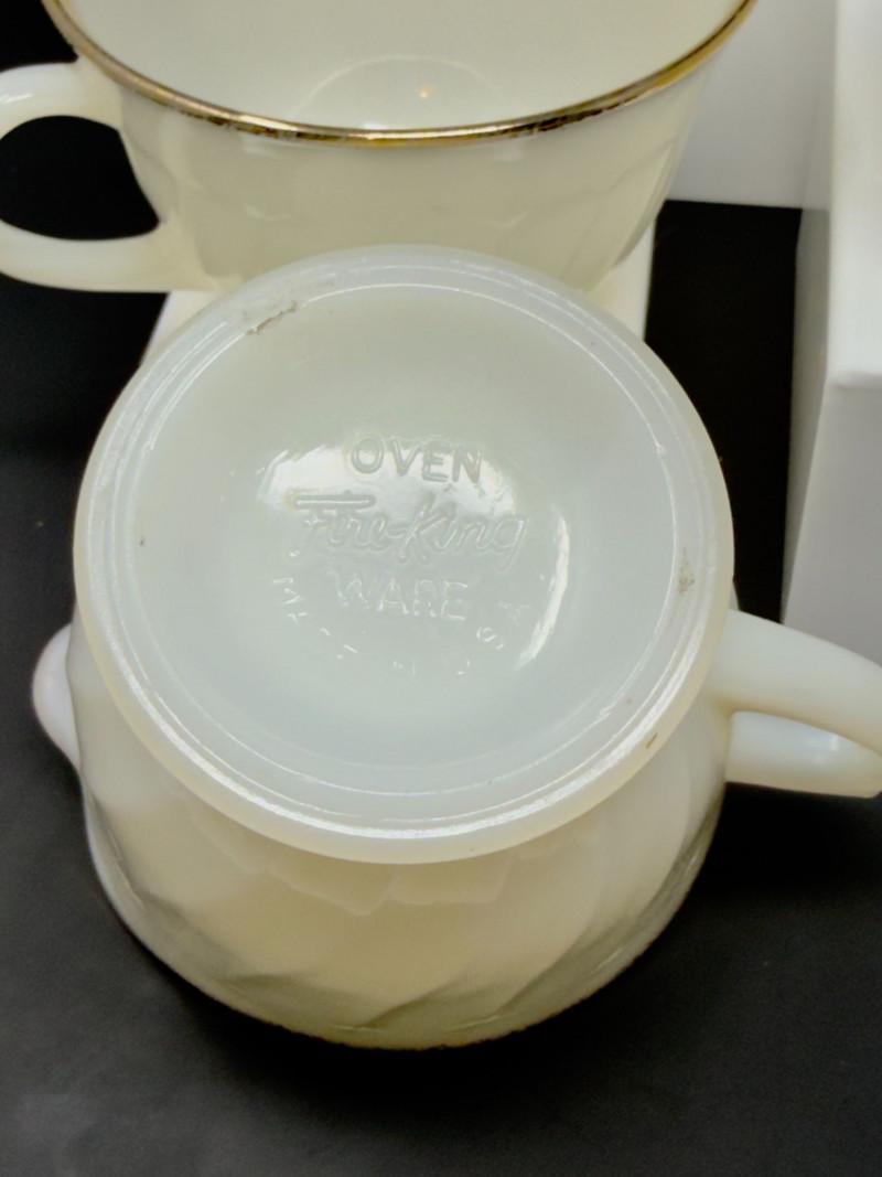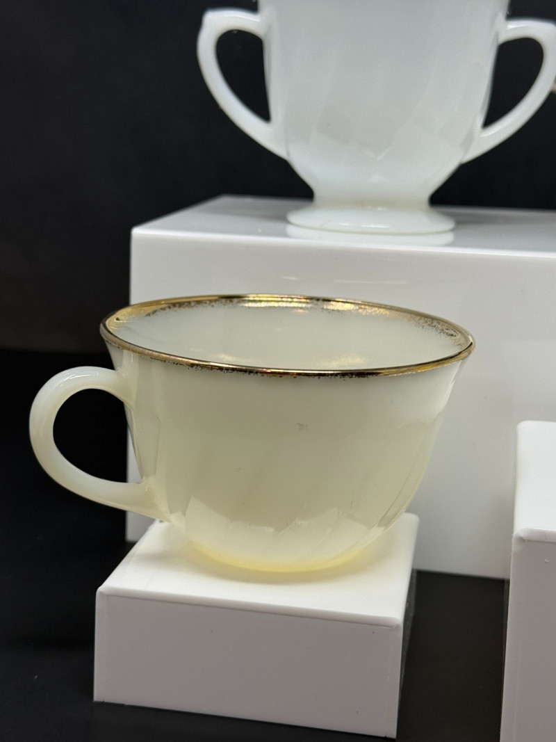 Fire-King, produced by Anchor Hocking, was widely popular in mid-century American homes for its durable milk glass and elegant designs. Gold-trimmed patterns such as White Swirl and Golden Anniversary were marketed for special occasions and entertaining, offering an affordable alternative to fine china while maintaining a refined appearance.