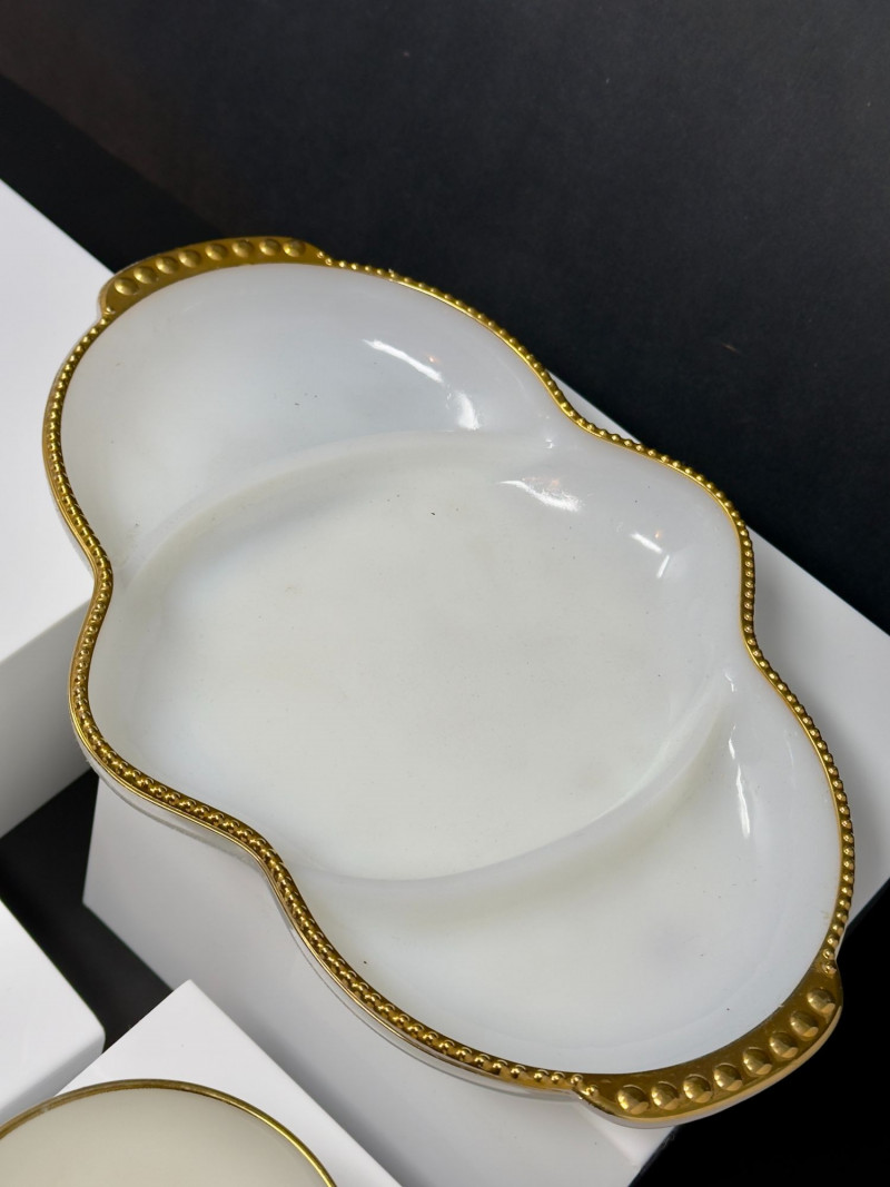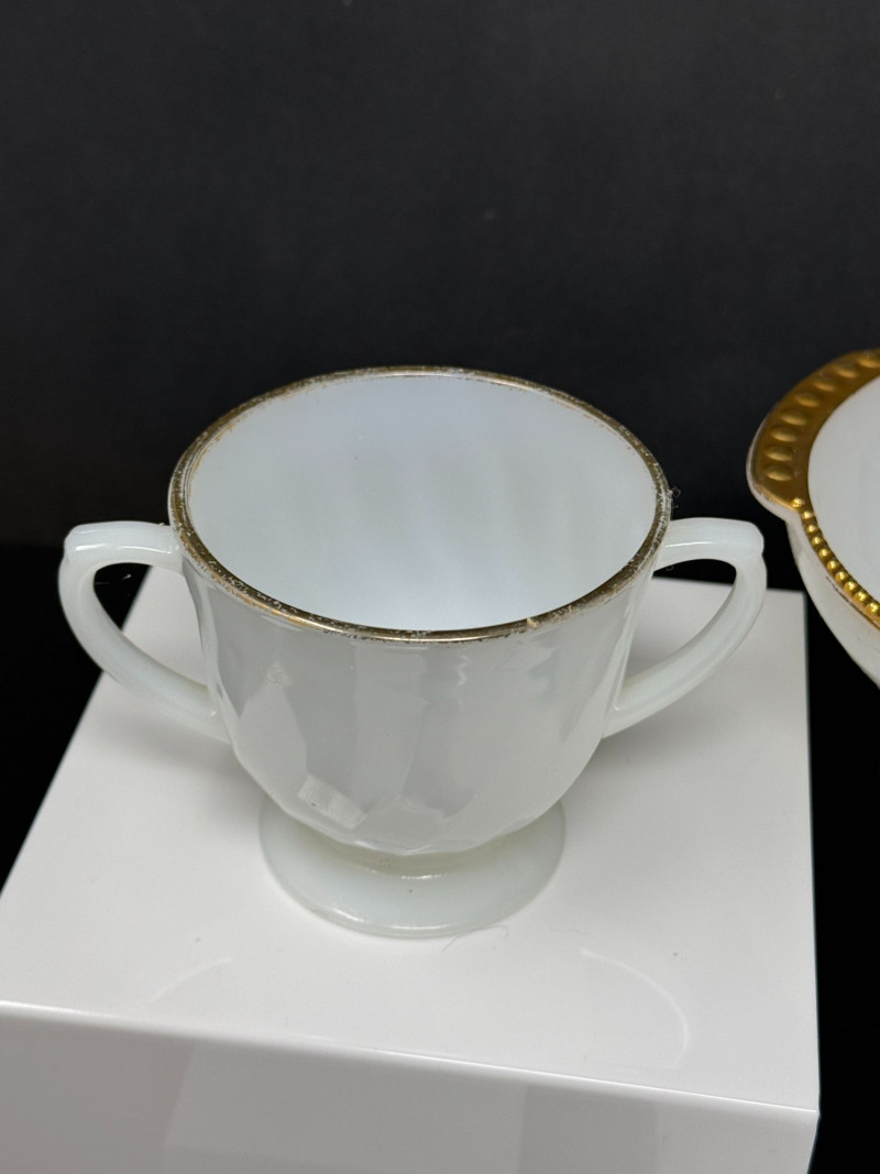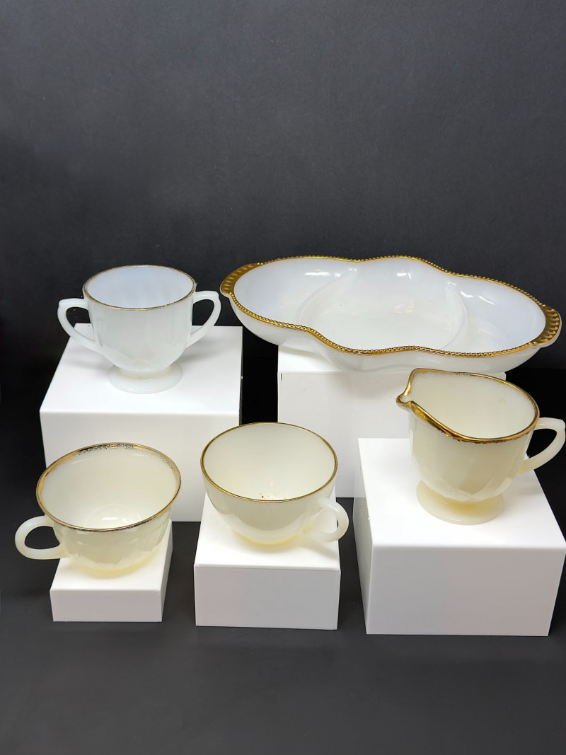 Vintage Fire-King Milk Glass Tea Service with Gold Trim and Divided Relish Dish Vintage Fire-King Oven Ware milk glass grouping featuring coordinated white swirl forms accented with gold trim. The set includes multiple footed teacups, a matching creamer and sugar bowl, and a large three-section divided relish dish with a scalloped rim and beaded gilt edge. The soft translucence of the milk glass paired with the warm gold detailing gives the collection an elegant yet approachable mid-century presentation. The pieces display classic Fire-King silhouettes designed for both everyday use and entertaining, with balanced proportions and subtle molded detailing. The divided relish dish serves as a strong centerpiece, while the cups and service pieces offer versatility for tea service, dessert presentation, or decorative display. This grouping works well in mid-century modern, traditional, and cottage-style interiors. Type: Tea and serving set (group lot) Included Pieces: Condition: Approximate Measurements: Historical Note: