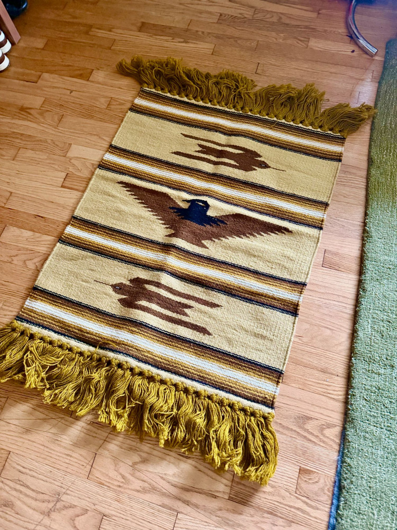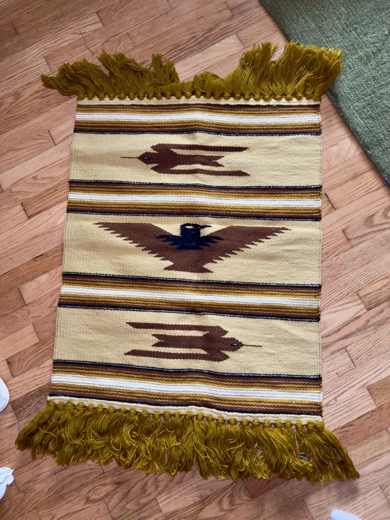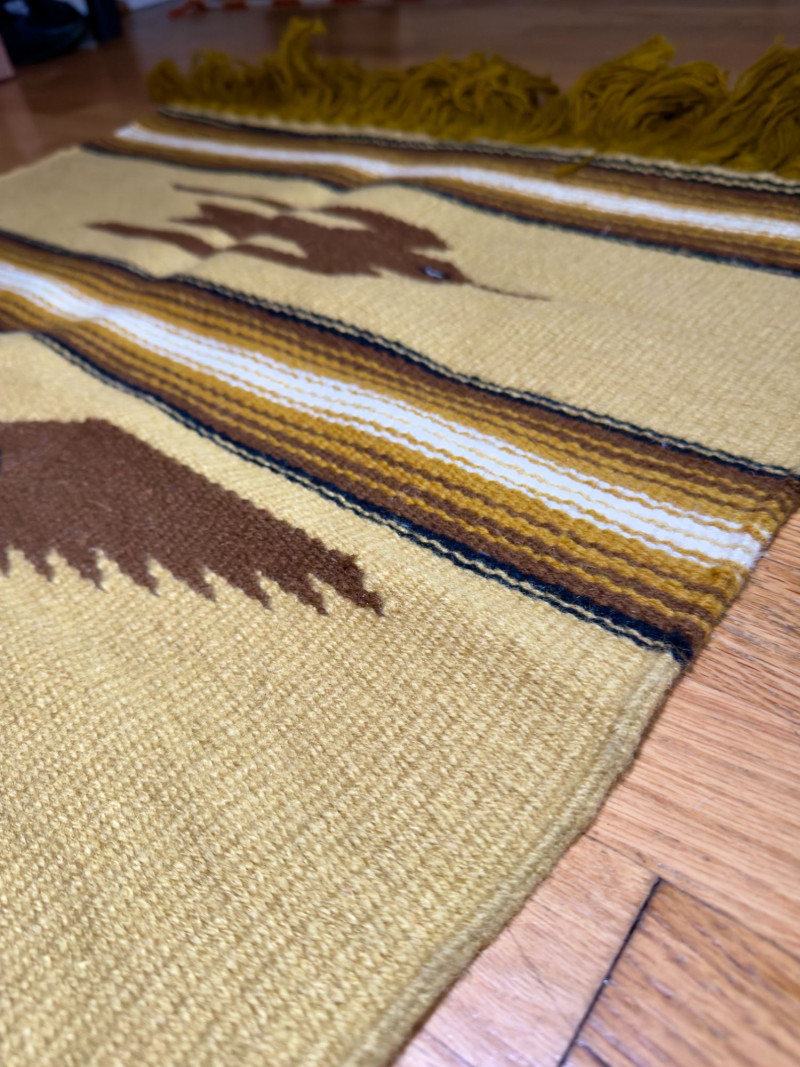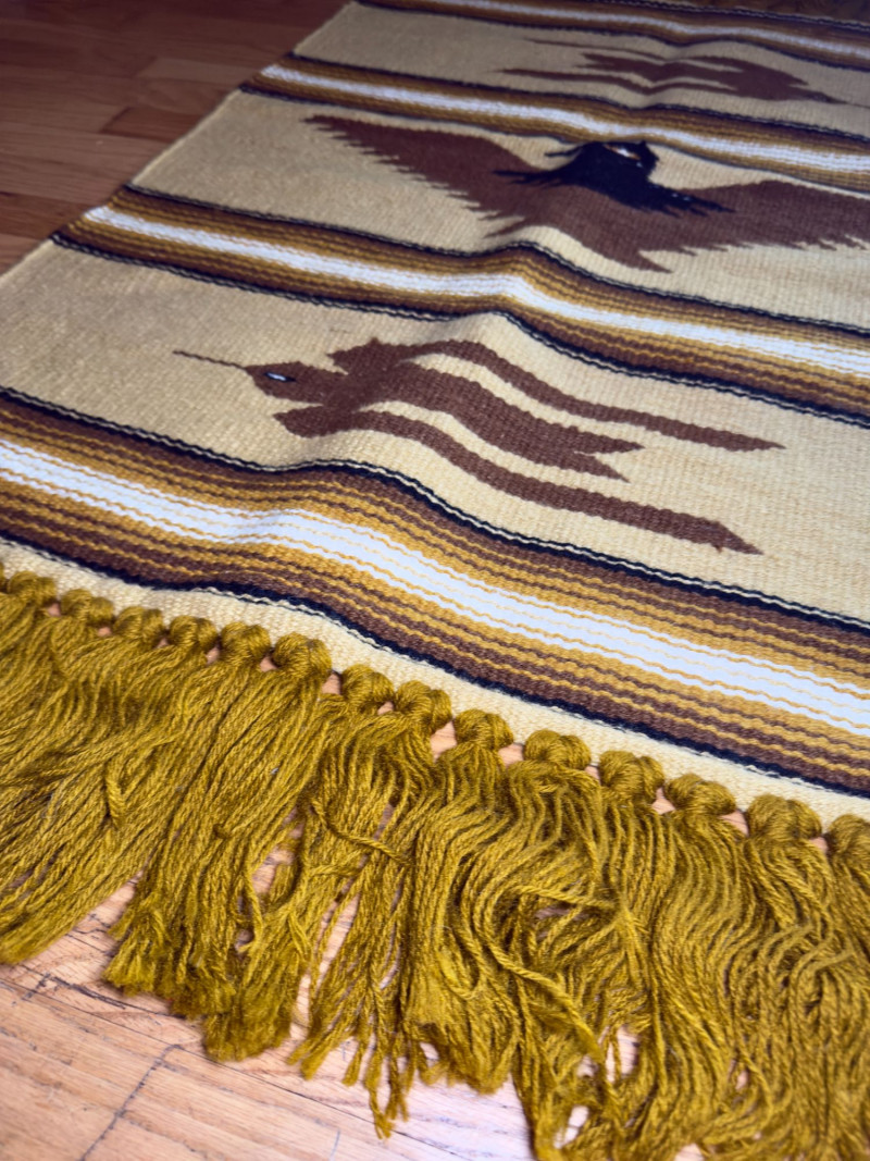 Handwoven Southwestern Textile with Stylized Bird Motifs and Fringe Handwoven wool textile featuring a striped Southwestern composition with repeating stylized bird motifs and knotted fringe ends. The design incorporates earthy mustard, cream, brown, and black tones arranged in horizontal bands, with a central bird figure rendered in a bold, graphic silhouette. The texture and color palette give the piece a warm, grounded presence. The textile is finished with thick twisted fringe at both ends, suggesting traditional loom weaving techniques. Its size and construction make it suitable for use as a wall hanging, runner, bench accent, or decorative layering piece. The overall aesthetic aligns with mid-century Southwestern and Zapotec-inspired textiles popular in American interiors during the mid to late 20th century. Type: Handwoven textile / rug / wall hanging Condition: Approximate Measurements: Historical Note: