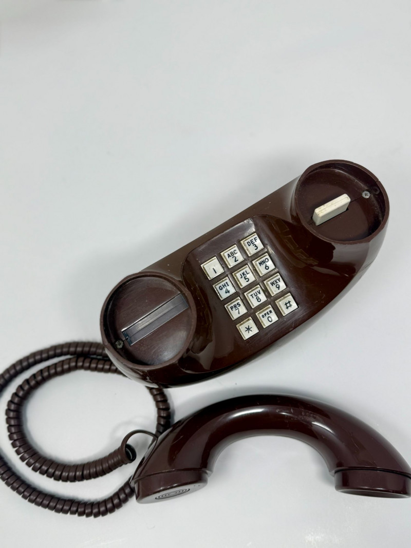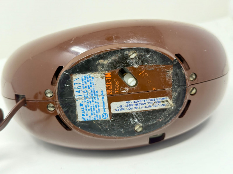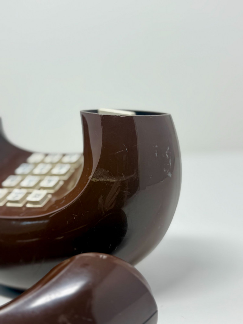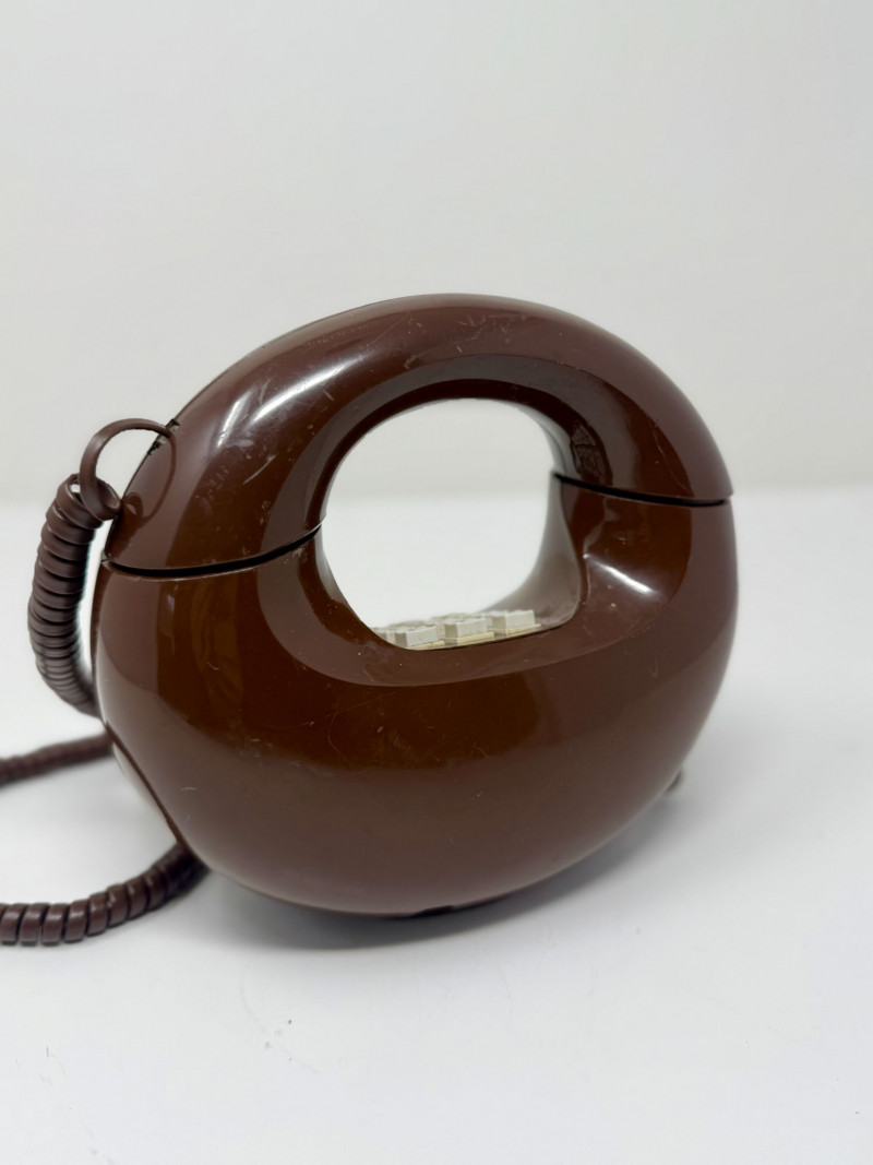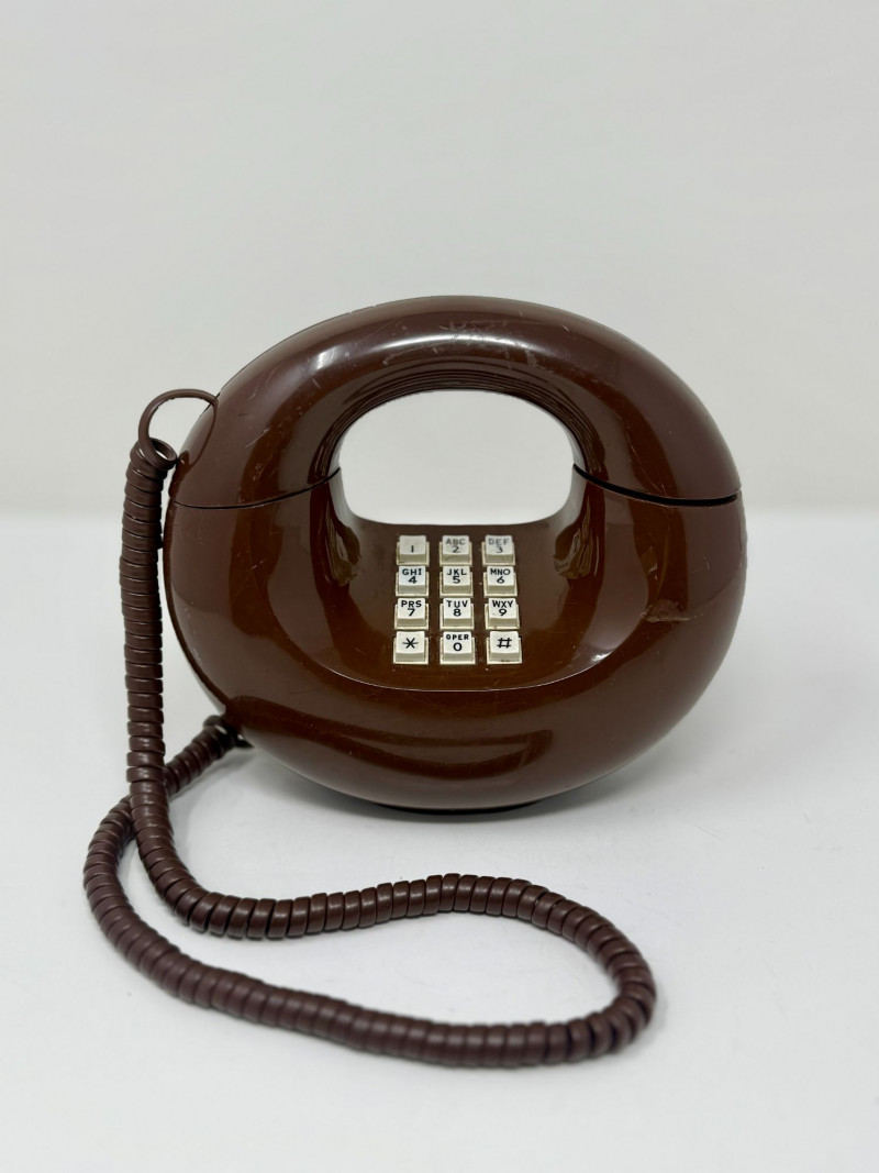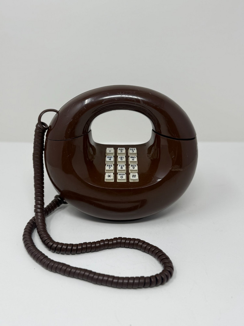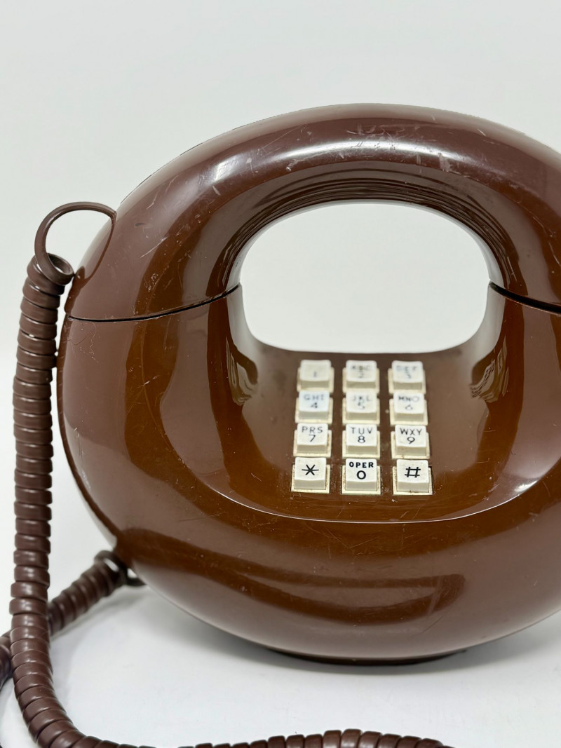Vintage 1970s Western Electric Brown Touch-Tone Donut Phone, Sculptural Circular Telephone Sculptural vintage touch-tone telephone in a distinctive circular “donut” form, produced in the 1970s using Western Electric / Bell System components. The phone features a glossy brown molded plastic body with an integrated handset cradle and central 12-button touch-tone keypad. Its bold, futuristic silhouette reflects the era’s fascination with space-age and modernist design, making it both a functional telephone and a decorative statement piece. The handset connects via a matching brown coiled cord, and the phone retains its classic push-button configuration with alphabetized number keys. Donut-style telephones were produced in limited quantities compared to standard desk models and are now sought after for their sculptural form and retro appeal. This example appears to be a novelty design utilizing authentic Western Electric internal components rather than a standard mass-market housing. Dimensions: Approx. 8" H x 10" W x 4.5" D Condition: Good vintage condition. Surface shows light scuffs and scratches consistent with age and use. Buttons appear intact and evenly seated. Cord shows normal wear with no visible breaks. Untested; functionality cannot be guaranteed. Please review photos carefully for condition details. Notes: Circular “donut” telephones emerged during the 1970s as experimental and novelty designs, blending telecommunications technology with sculptural industrial design. Western Electric phones were widely known for their durability and quality, and novelty forms incorporating Bell System components are now collectible as both design objects and pop-culture artifacts. Estimated Value: $150–$300