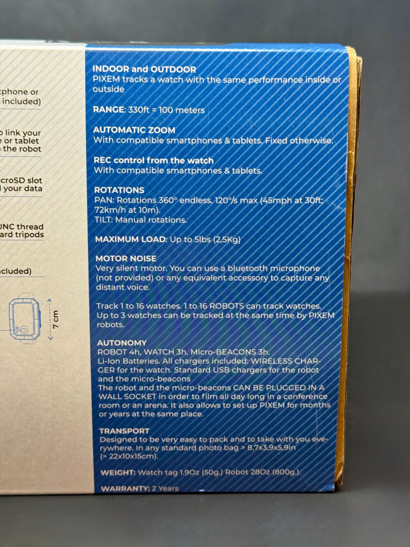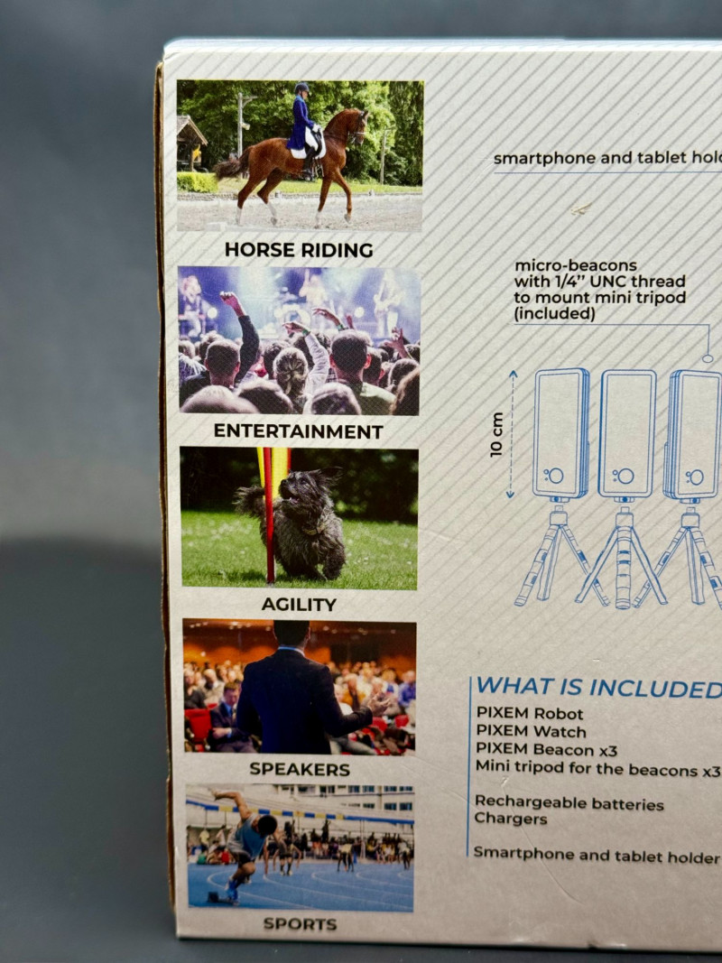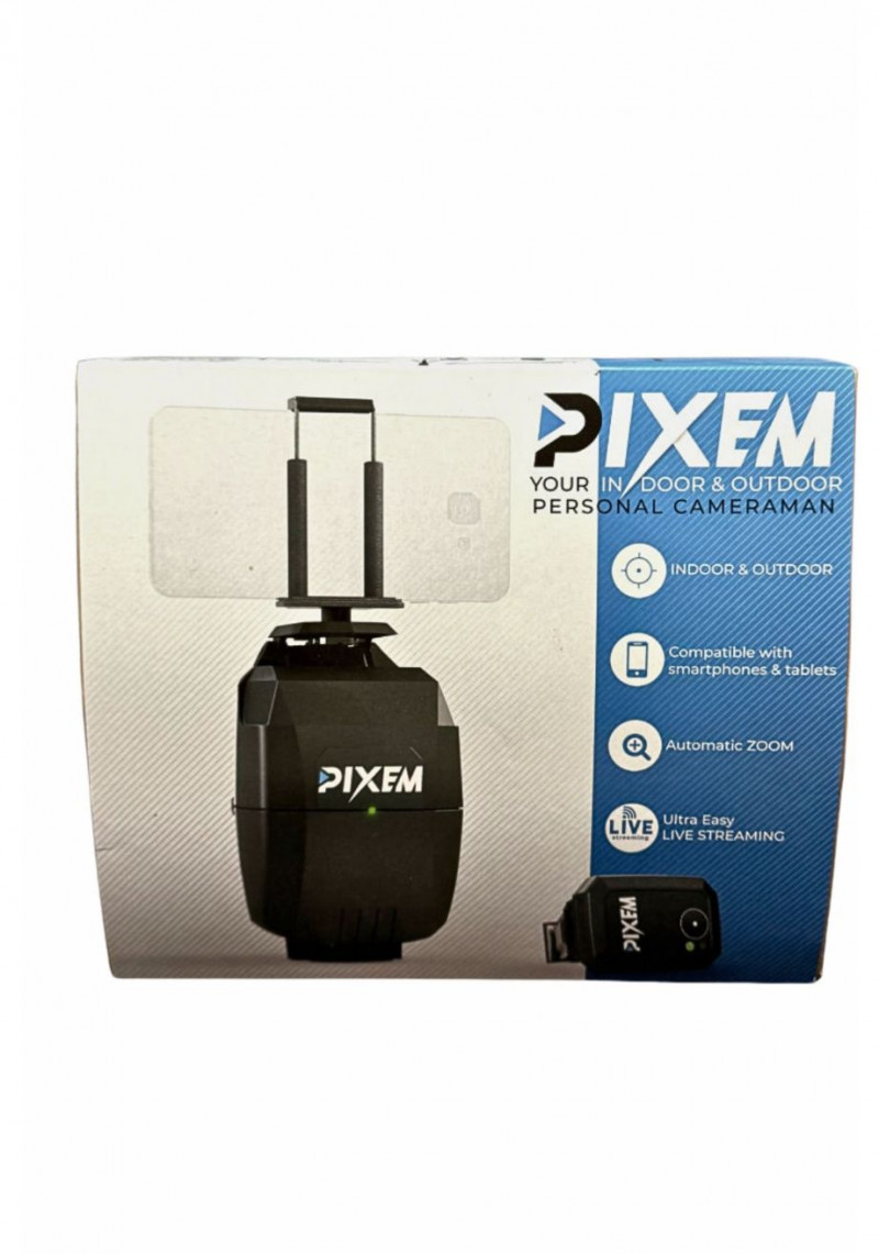 PIXEM Indoor & Outdoor Personal Camera — New in Unopened Box PIXEM indoor and outdoor personal camera system, offered new in its original unopened retail packaging. Designed as a compact, smartphone-compatible personal cameraman, the PIXEM system allows hands-free recording and live streaming using automated tracking and zoom functions. The unit is compatible with smartphones and tablets and was marketed for personal filming, live streaming, and remote content capture. Features include automatic zoom, indoor and outdoor usability, and ultra-easy live streaming functionality. The boxed presentation includes printed feature icons and branding, making this example suitable for both use and resale. Type: Personal camera system Packaging Condition: Estimated Era: Contemporary (late 2010s–2020s) Historical Note: