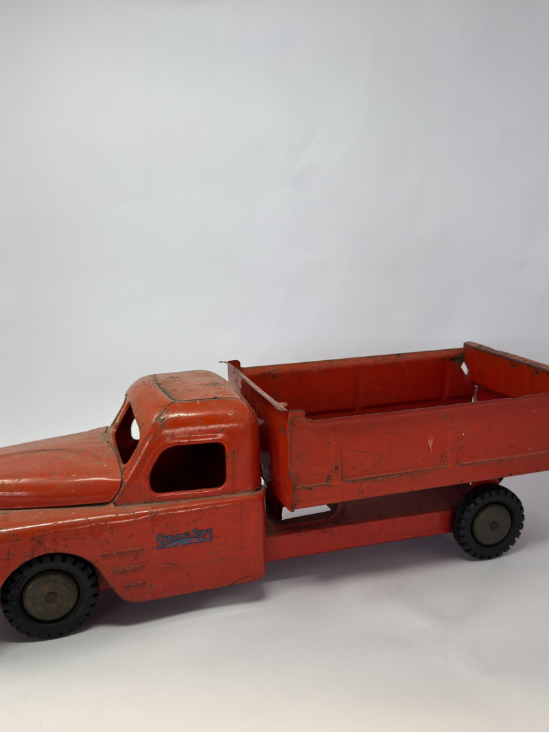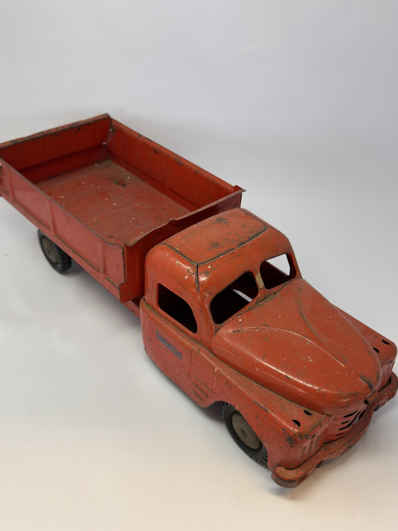Vintage Structo Pressed Steel Dump Truck Red Metal Toy 1940s 1950s Vintage Structo pressed steel dump truck in classic red finish, dating to the 1940s–1950s era. This solid metal toy features the iconic rounded cab design often associated with Structo’s “Diamond T” style trucks and retains great original character. Constructed from durable pressed steel with rubber wheels, this piece has a functional dump bed and a nicely aged patina that collectors love. A great display item for vintage toy collectors, industrial décor, or farmhouse styling. Condition: Measurements: Historical Note: Est. $170