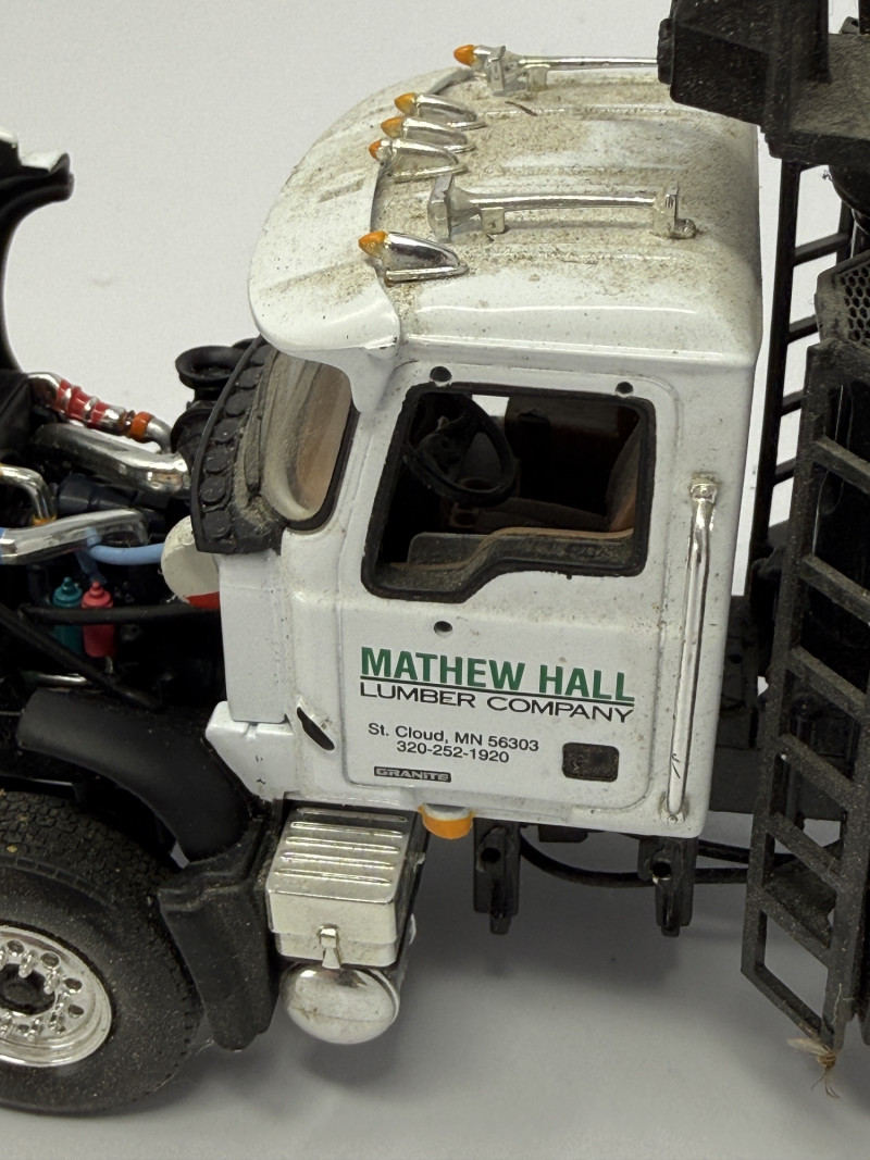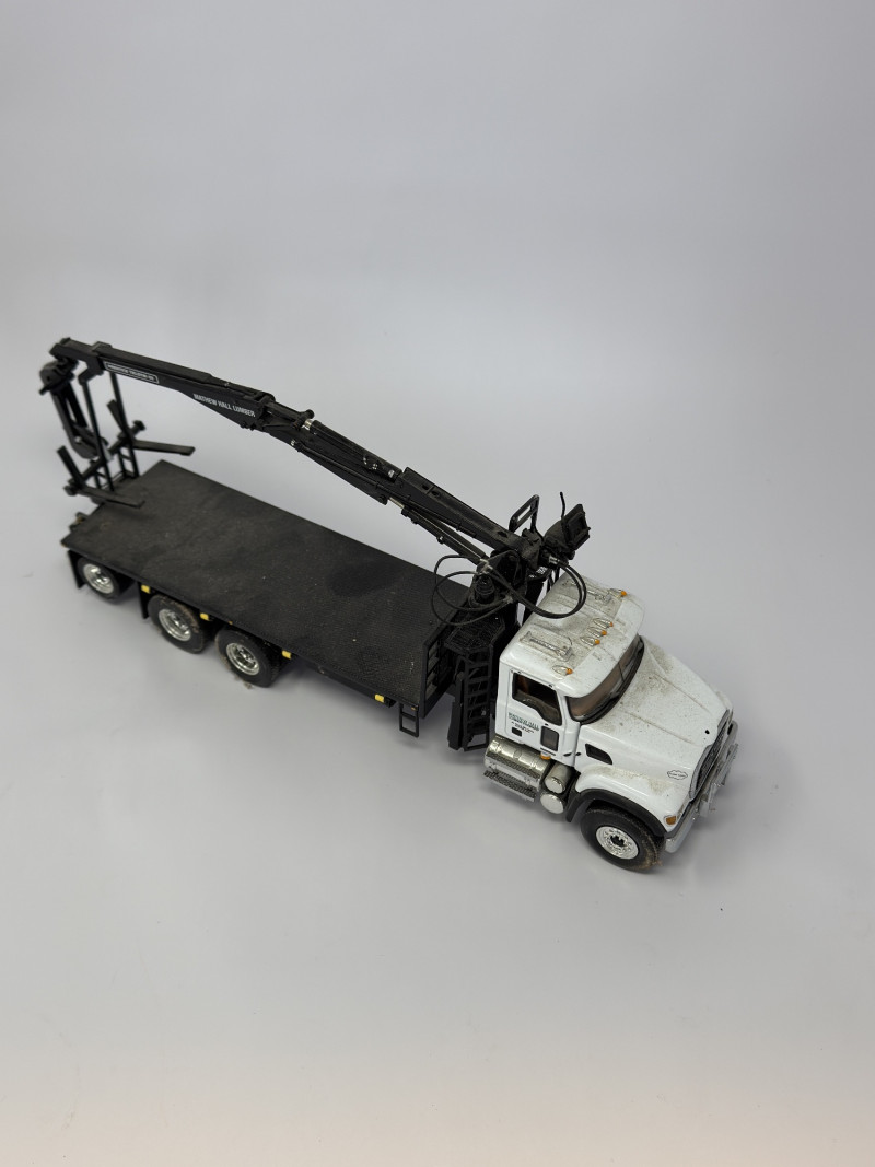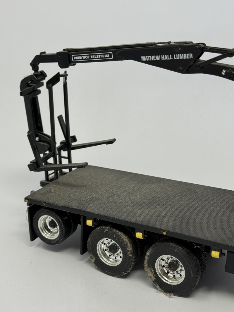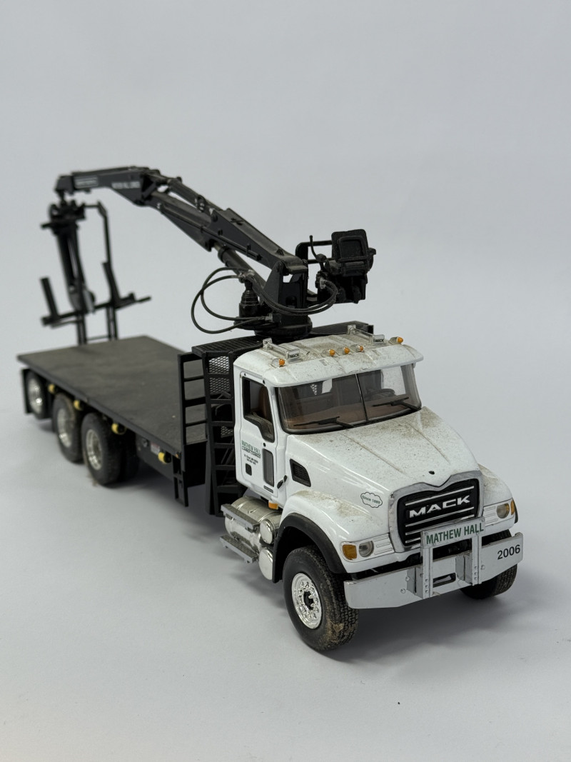 First Gear Mack Granite Material Handler Truck 1:50 Diecast Prentice Telstik TS-33 2006 Highly detailed 1:50 scale diecast model of a Mack Granite material handler truck by First Gear, featuring a Prentice Telstik TS-33 crane. Produced in 2006 for Mathew Hall Lumber Company, this is a well-crafted collector piece with realistic construction and functional components. Features include a rotating and extendable crane arm, detailed engine compartment under a tilt hood, multi-axle flatbed, and authentic branding throughout. A great addition for diecast collectors, construction equipment enthusiasts, or display. Condition: Measurements: Historical Note: