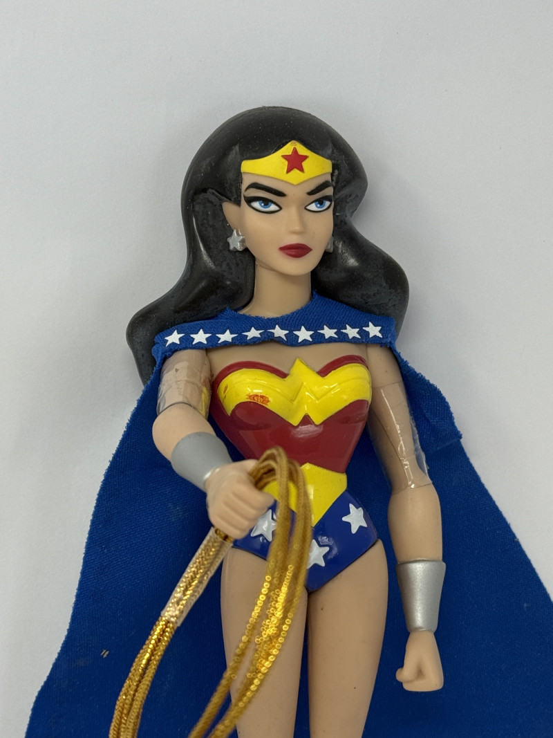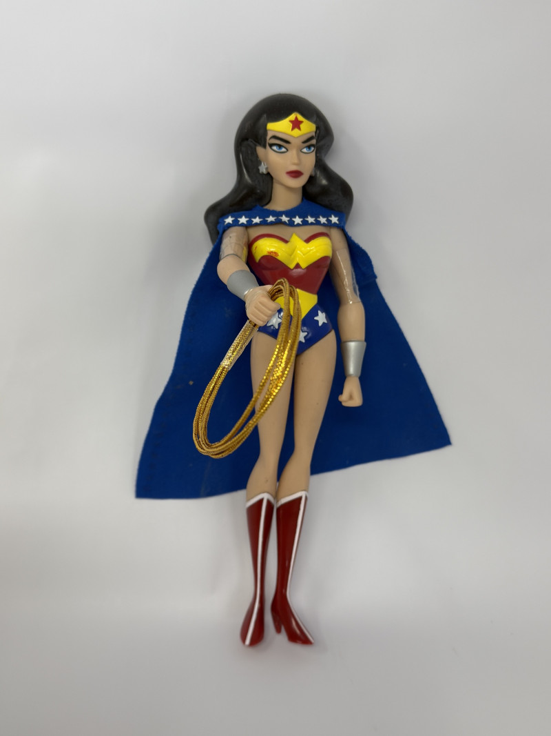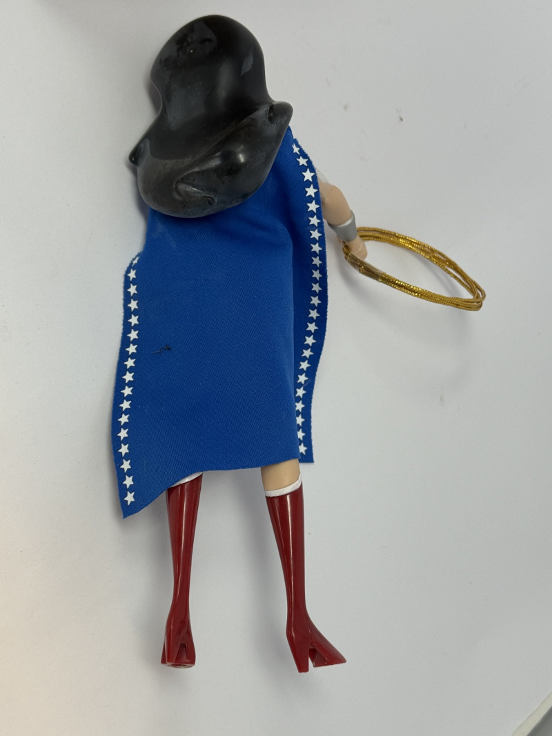 Vintage Wonder Woman Figure & Tin Robot Wind-Up Toy Lot w/ Box Superhero Collectible Unique vintage toy lot featuring a Wonder Woman figure alongside a colorful tin wind-up style robot, complete with original box. A fun mix of superhero and retro space-age toy design, perfect for collectors or display. The Wonder Woman figure features her classic red, blue, and gold costume with lasso accessory and cape. The tin robot has a bright lithographed design with mid-century sci-fi styling and comes housed in its original cardboard packaging. Great for collectors of DC memorabilia, vintage tin toys, or nostalgic display pieces. Condition: Measurements: Historical Note: