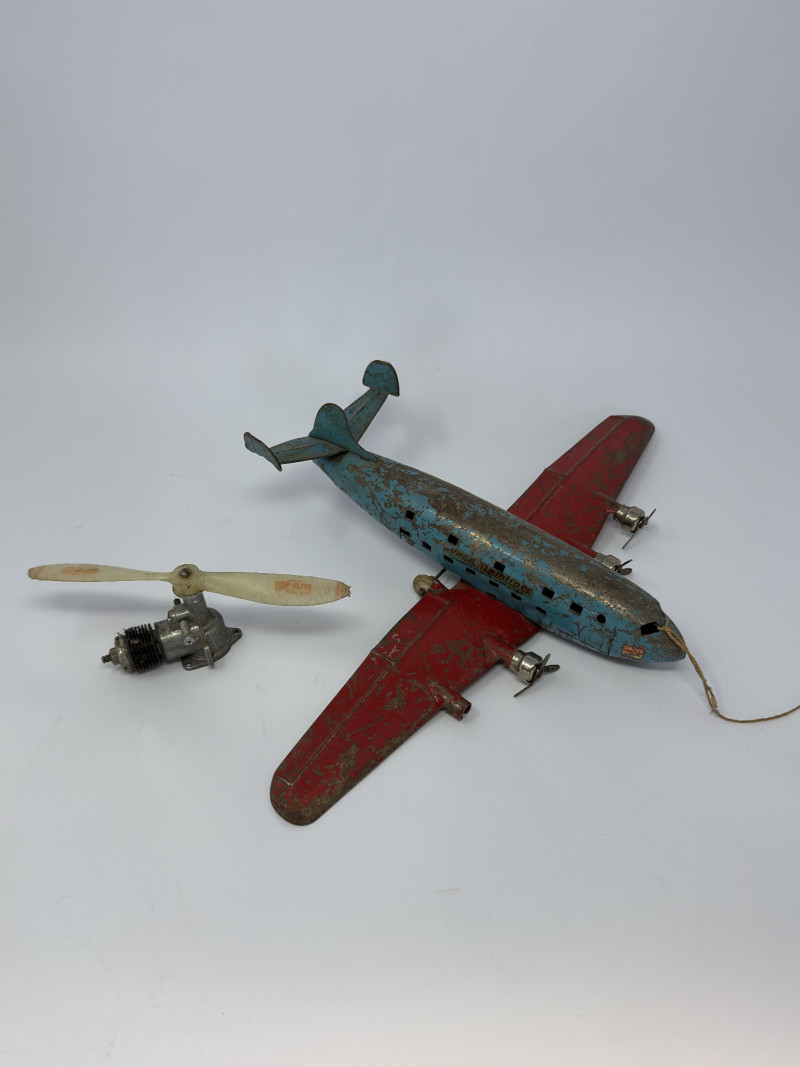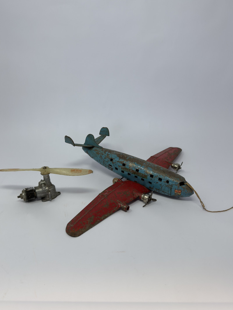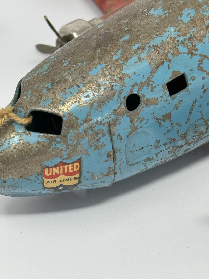 Vintage tin lithograph airplane toy featuring classic United Airlines markings, likely dating to the mid-20th century. This piece showcases great aged character with original paint, red wings, and blue fuselage. Includes a detached propeller/motor component, suggesting it was originally a wind-up or mechanical toy. A fantastic display piece for aviation collectors, vintage toy enthusiasts, or industrial décor. Condition: Measurements: Historical Note: