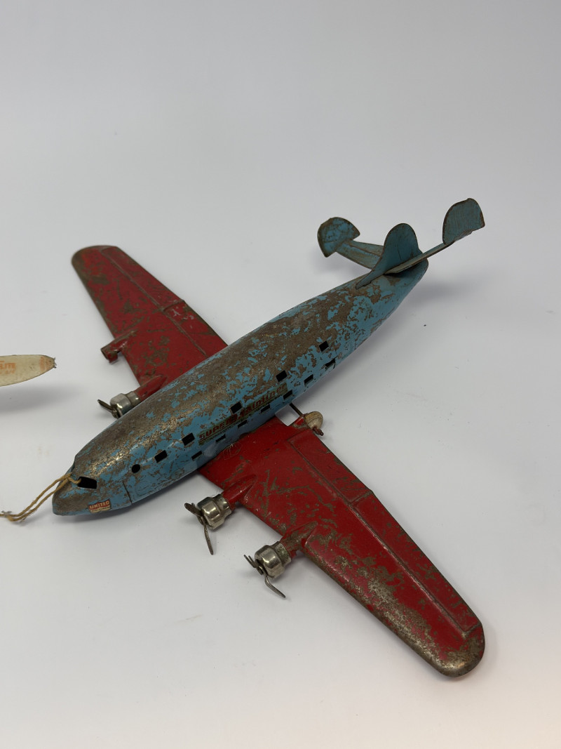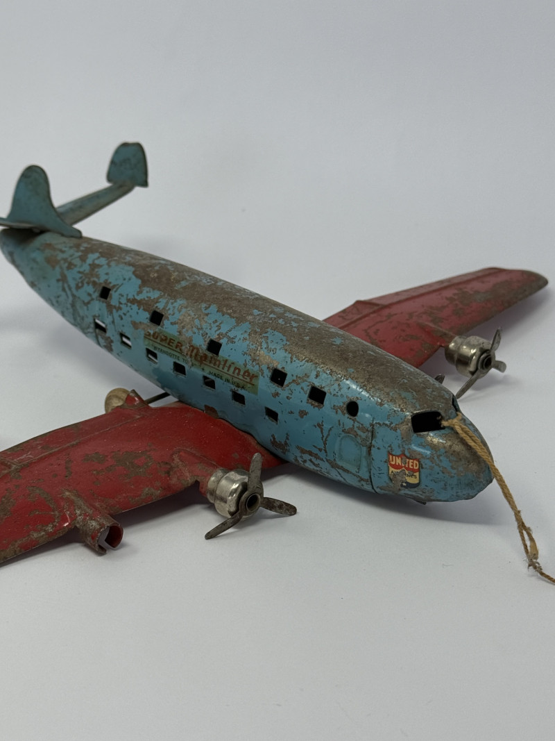 Tin lithograph airplanes were popular from the 1930s–1950s, often produced in Japan or the U.S. as affordable mechanical toys. Airline-branded versions, like United Airlines, are especially collectible today due to their connection to early commercial aviation history.