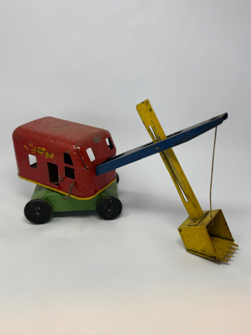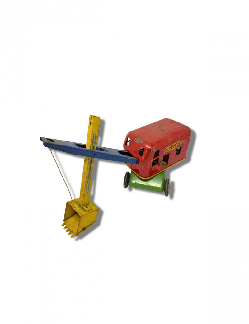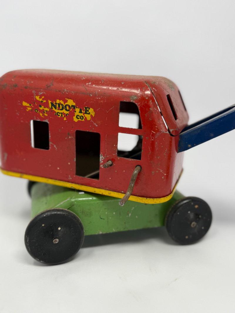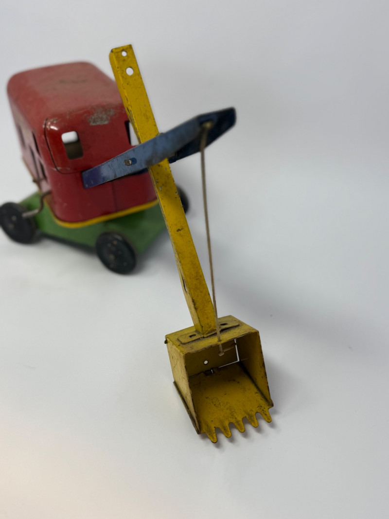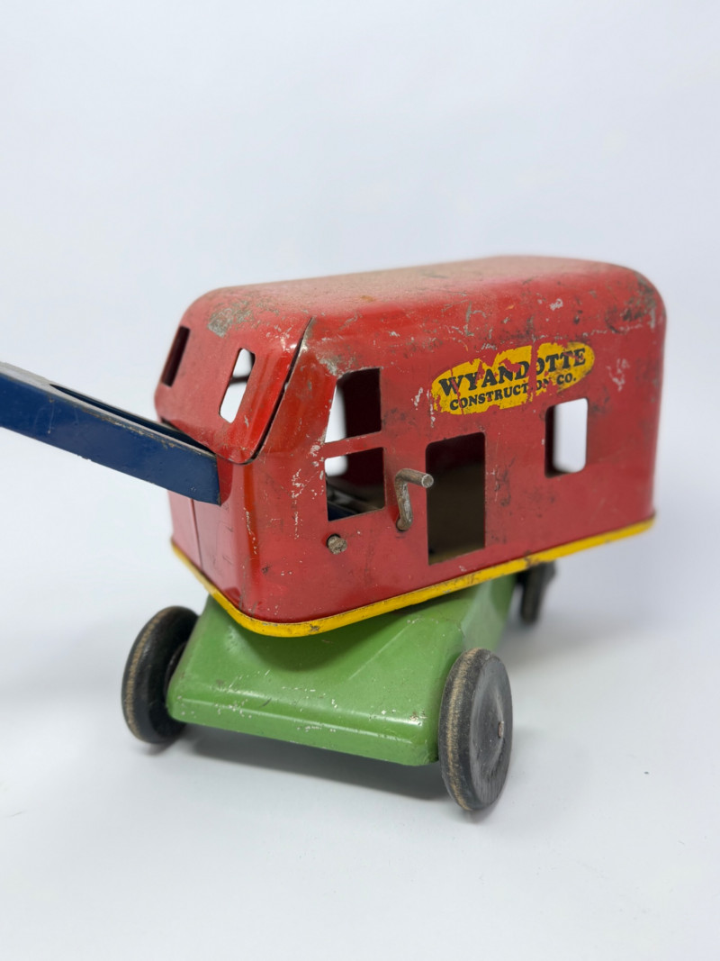 Vintage Wyandotte pressed steel construction toy featuring a mobile crane/excavator design with articulated arm and bucket. This colorful piece showcases classic red, green, blue, and yellow paint with original lithographed details. Marked “Wyandotte Toys,” a well-known American toy manufacturer, this piece dates to the 1930s–1940s era and reflects early construction equipment toy design. The crane arm and bucket assembly add great display appeal and mechanical charm. A fantastic collectible for vintage toy enthusiasts, construction memorabilia collectors, or industrial décor styling. Condition: Measurements: Historical Note: