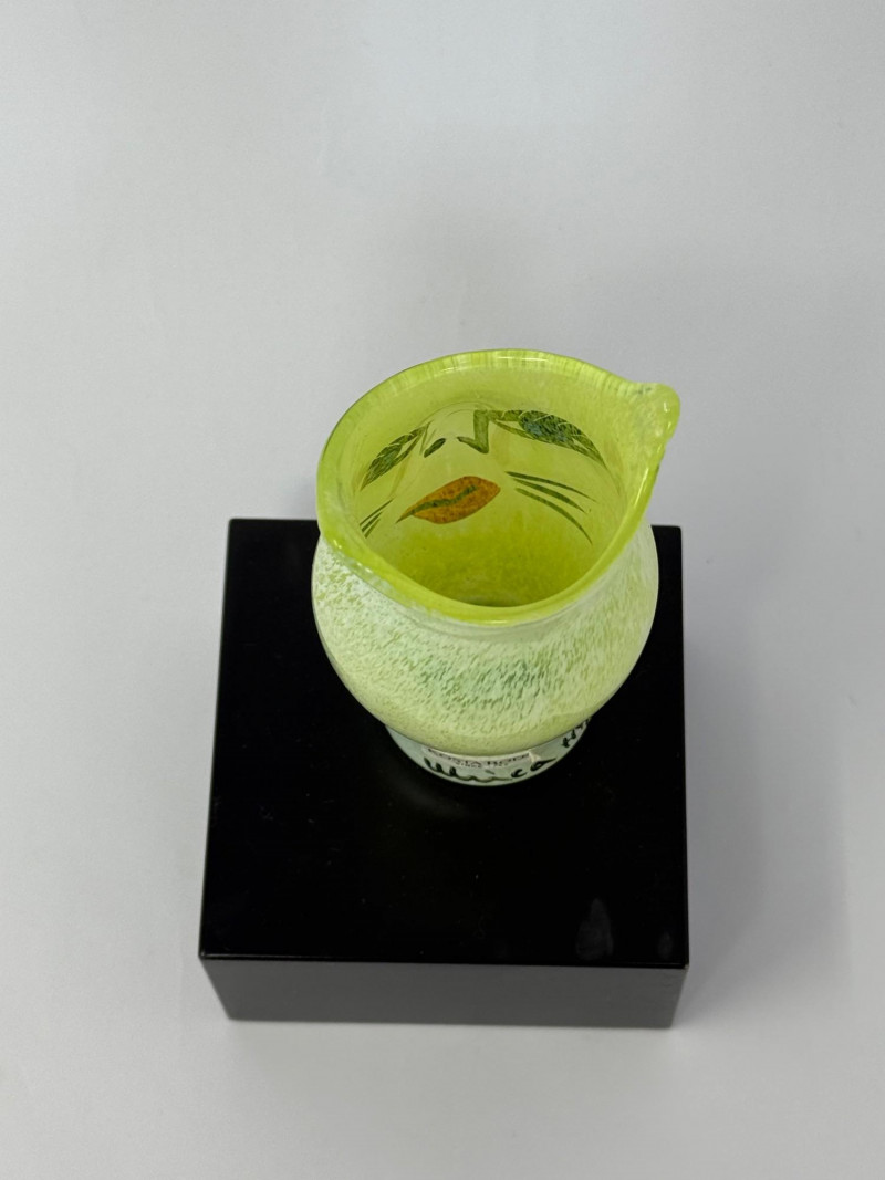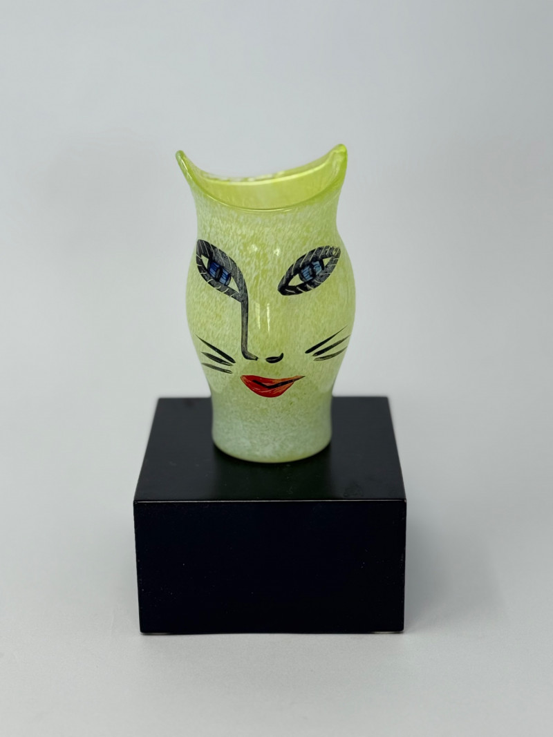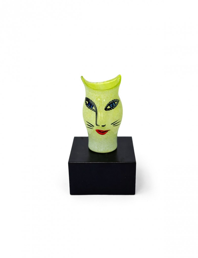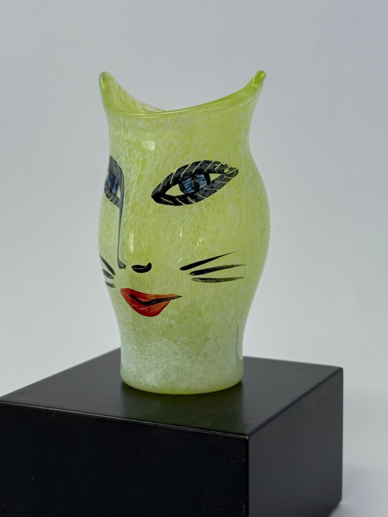 Kosta Boda Ulrica Hydman Vallien Cat Vase Green Art Glass Sweden Signed Iconic Kosta Boda art glass vase designed by renowned Swedish artist Ulrica Hydman Vallien, featuring her signature whimsical cat face design. This piece is done in a vibrant translucent green with hand-painted facial details, embodying her playful and expressive style.