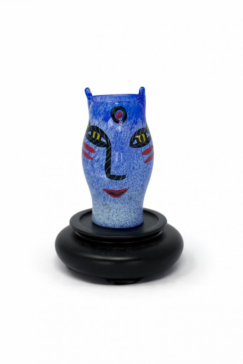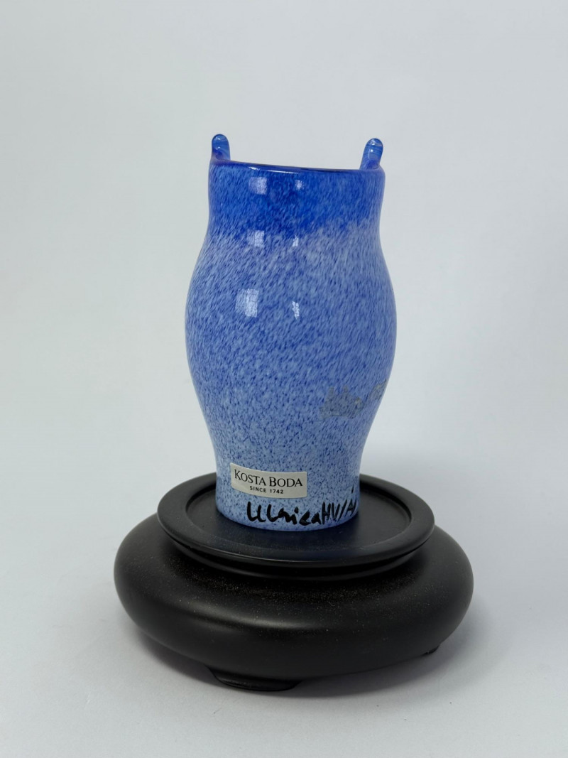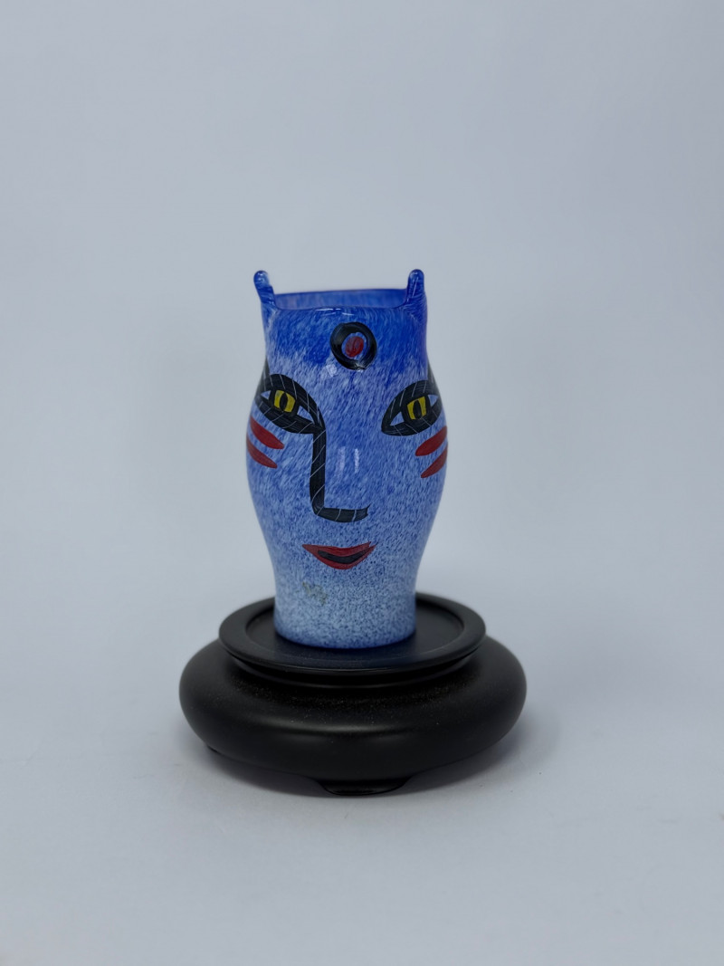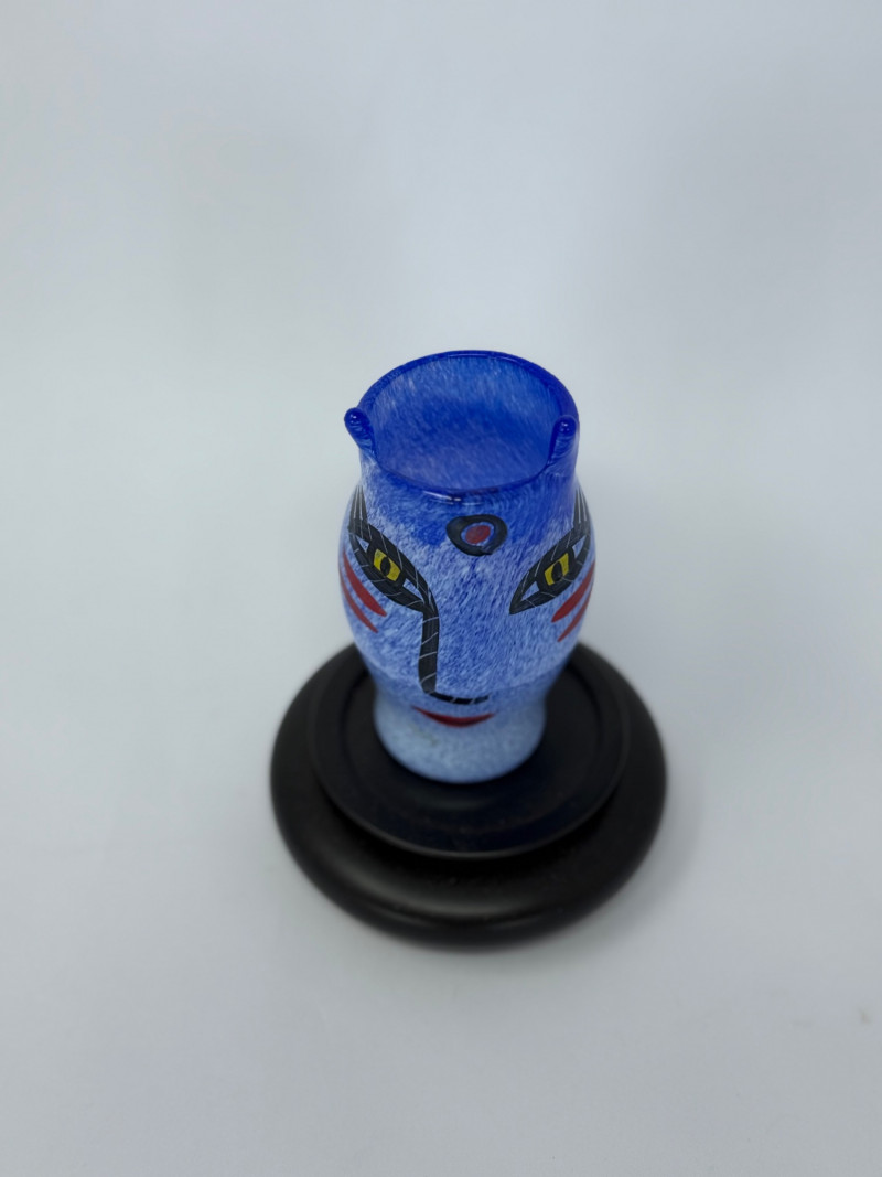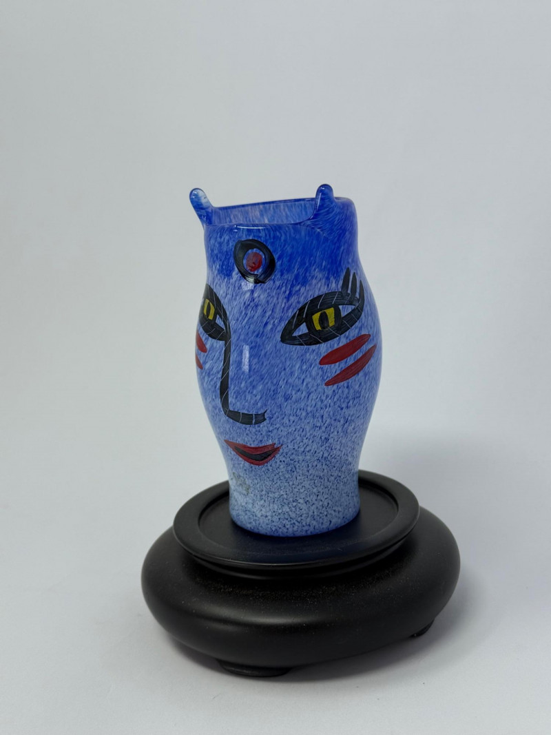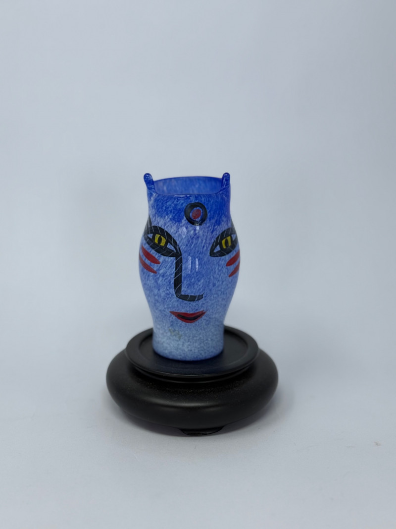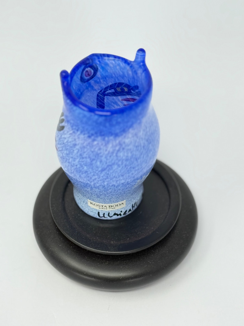 Striking Kosta Boda art glass vase designed by celebrated Swedish artist Ulrica Hydman Vallien, featuring her iconic cat/face motif in a rich cobalt blue colorway. Hand-decorated with expressive facial details, this piece is a classic example of her playful and highly collectible style. Signed and labeled on the base, confirming authenticity. A beautiful standalone piece or perfect to pair with other Vallien designs for a bold, artistic display. Condition: Measurements: Historical Note: