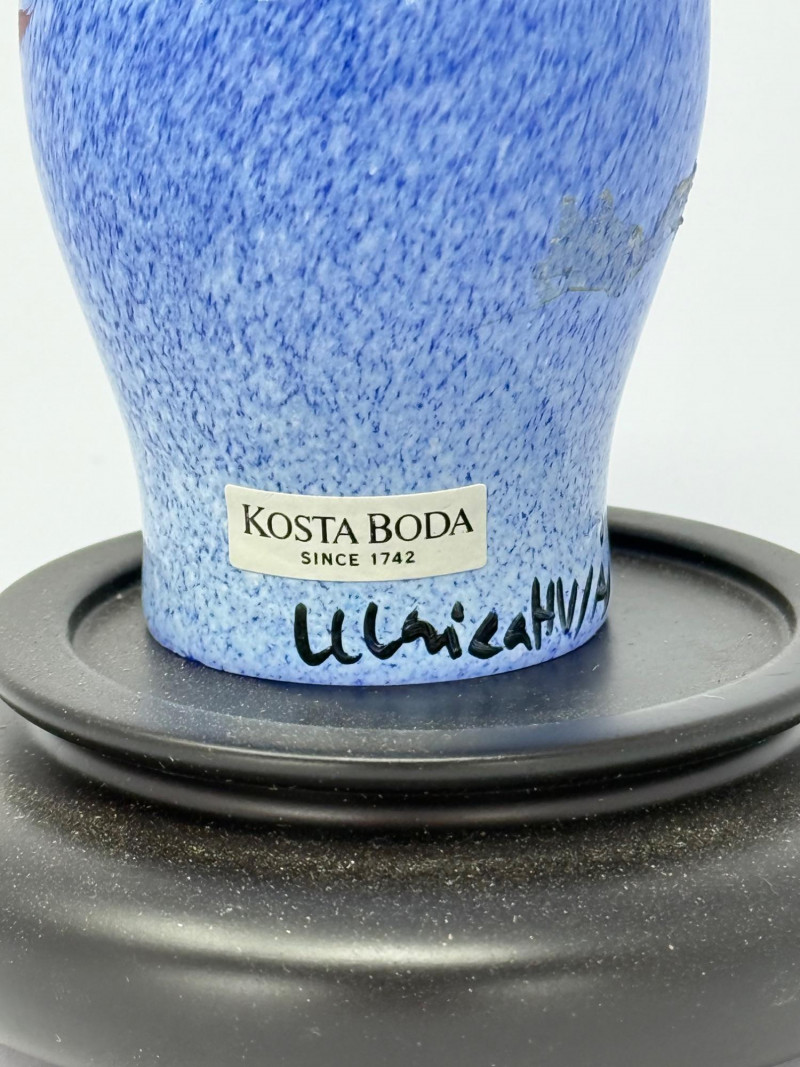 Ulrica Hydman Vallien was a leading designer for Kosta Boda and became internationally recognized for her whimsical, hand-painted glass pieces. Her face and animal series—like this cat vase—remain among the most sought-after modern Scandinavian glass designs.