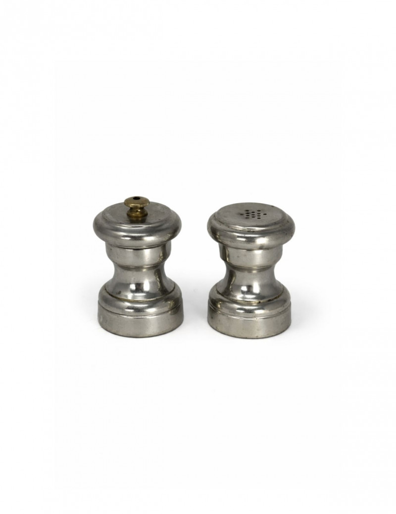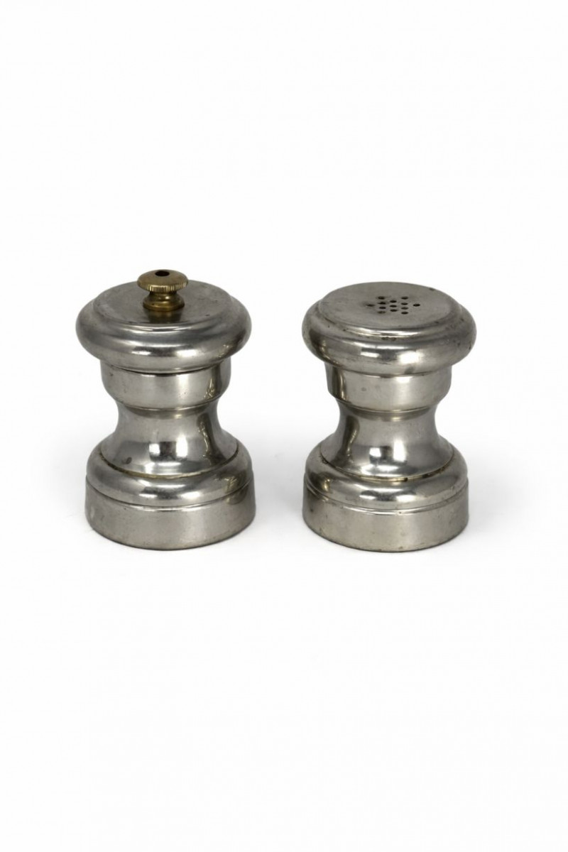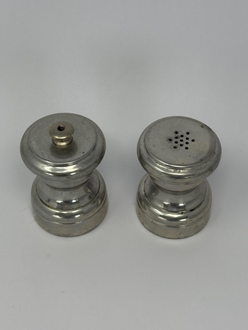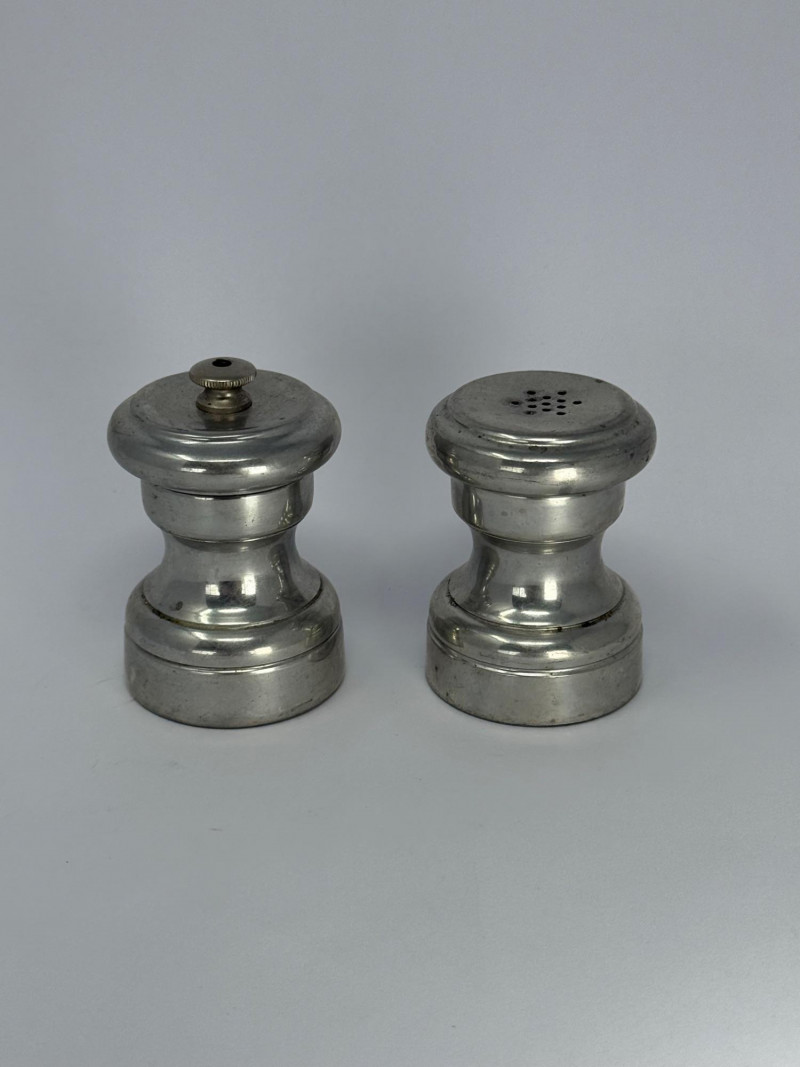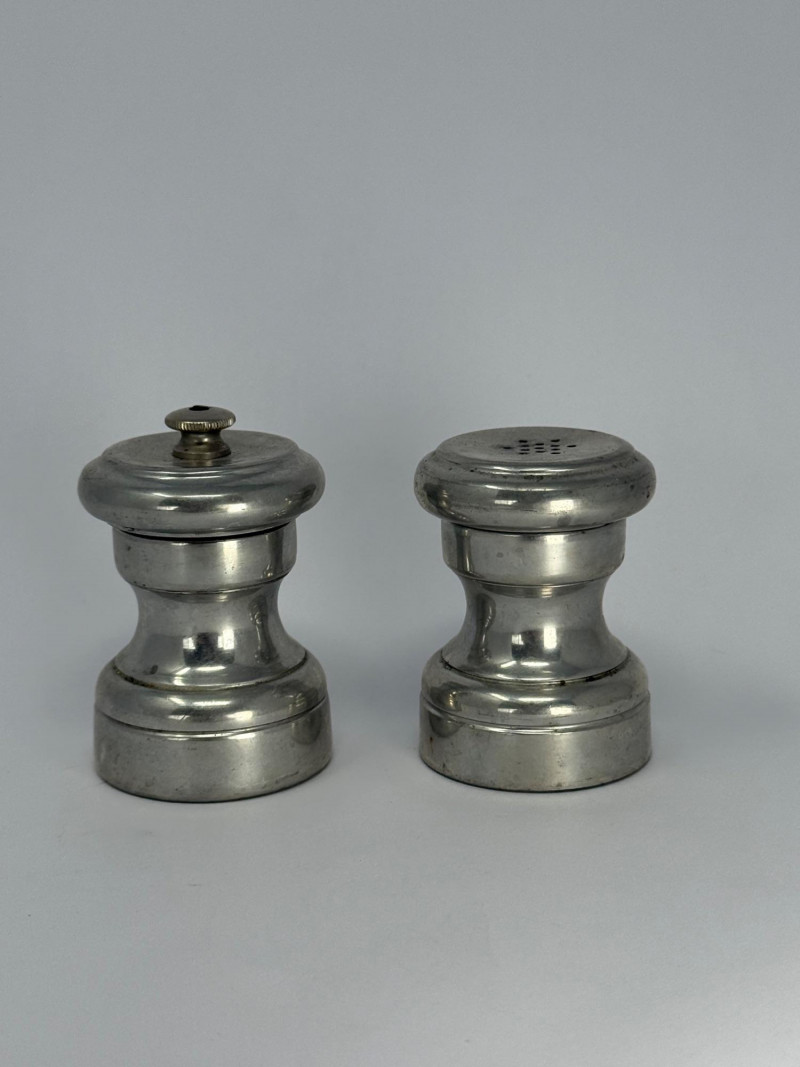 Good vintage condition with age-appropriate wear, visible patina, oxidation, and light surface marks. Pepper grinder shows interior wear but retains original mechanism.