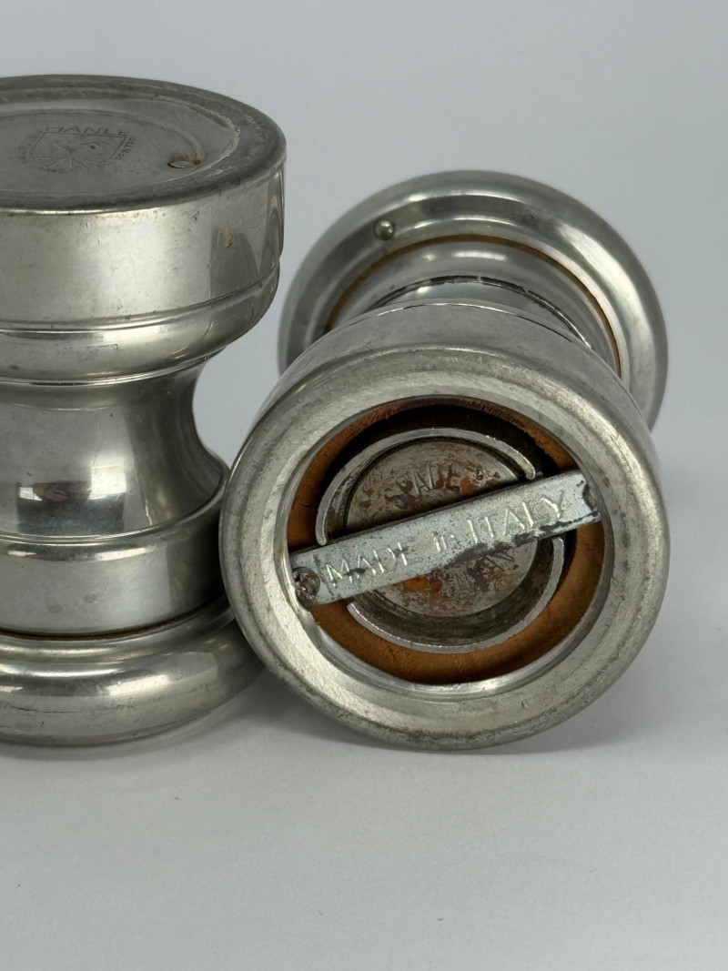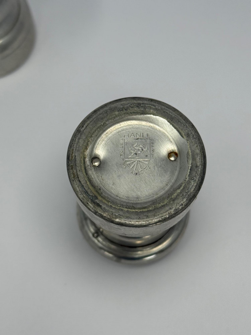 Vintage HANALEI Distinctive Pewter salt and pepper set in classic mid-century modern design. This set features a sleek, minimalist silhouette with a solid, weighty feel—crafted from pewter, a hallmark of vintage tableware design. The understated form makes it a versatile addition to both modern and traditional settings. Includes both a salt shaker and pepper grinder, with the grinder marked “Japan / Italy” on the mechanism. Each piece is stamped “HANALEI” on the base, confirming the maker. Condition: Measurements: Style: