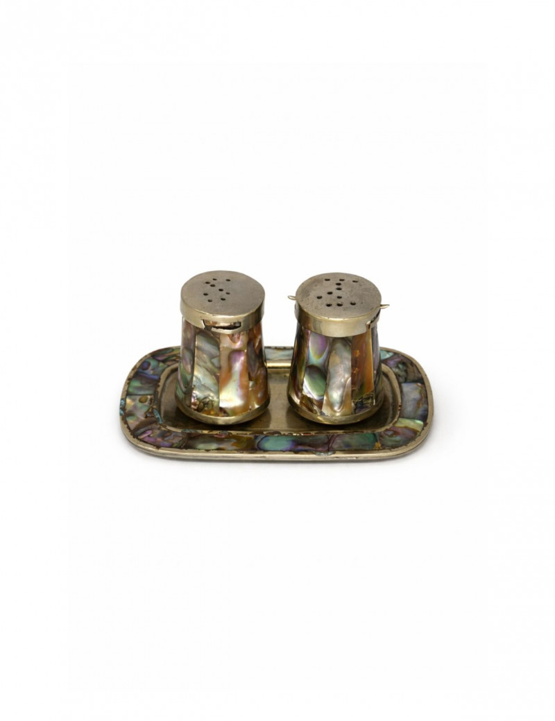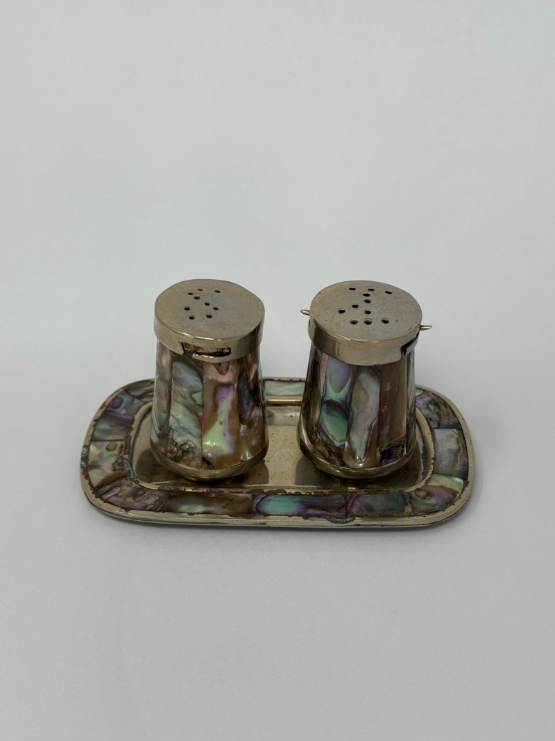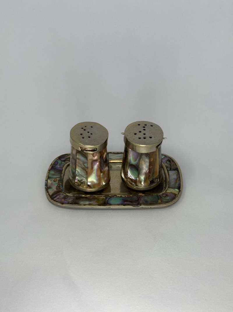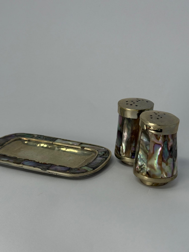 Lot # 19 - Vintage Abalone Salt Pepper Shakers Tray Set MCM