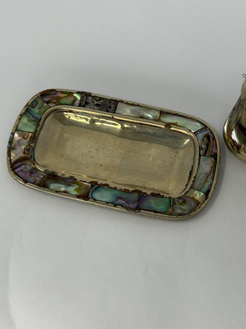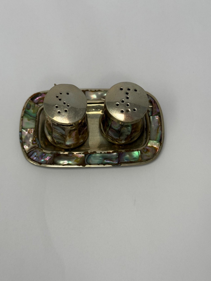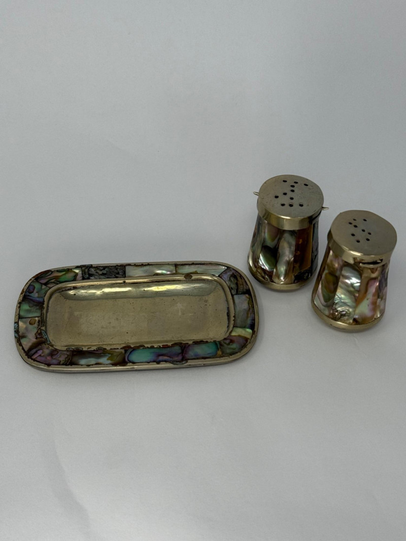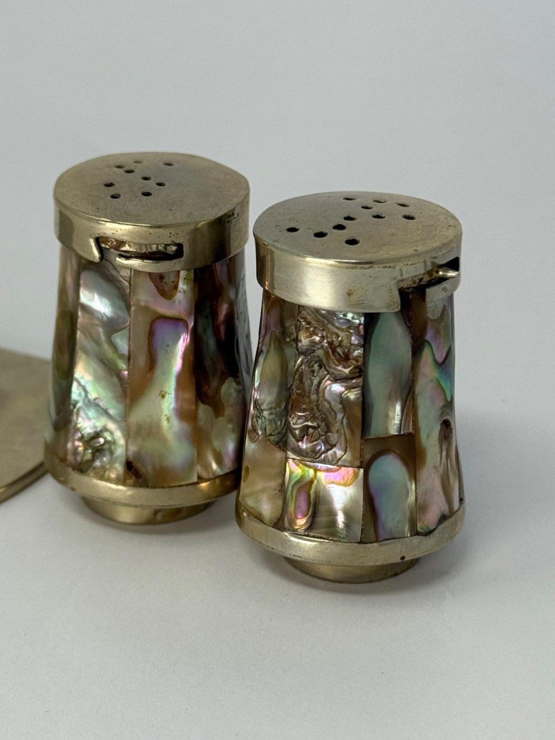Vintage Abalone Salt Pepper Shakers Tray Set MCM Vintage abalone shell inlay salt and pepper shaker set with matching tray, featuring a beautiful iridescent mosaic design. The shakers are clad in shimmering abalone shell panels with brass-tone accents, paired with a coordinating rectangular tray. The natural shell creates vibrant tones of green, purple, and blue, making this a striking mid-century modern table or display piece. A great decorative and functional set, perfect for collectors of MCM decor, coastal style, or unique serving pieces. Condition: Measurements: Notes: