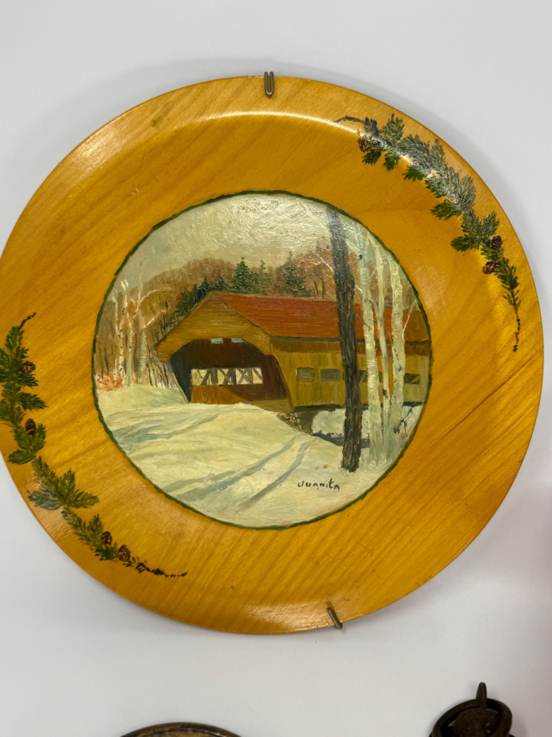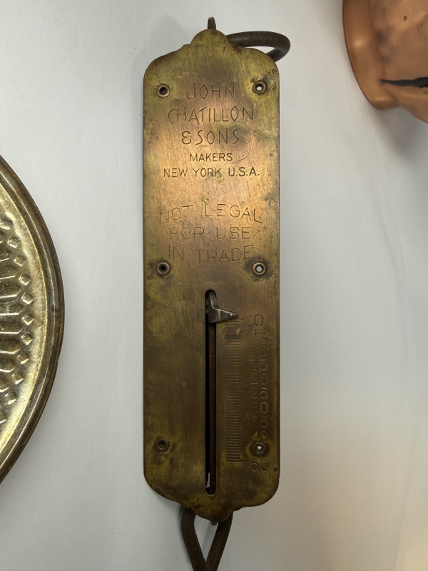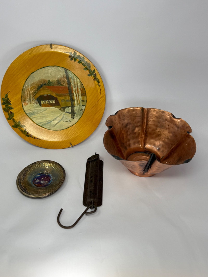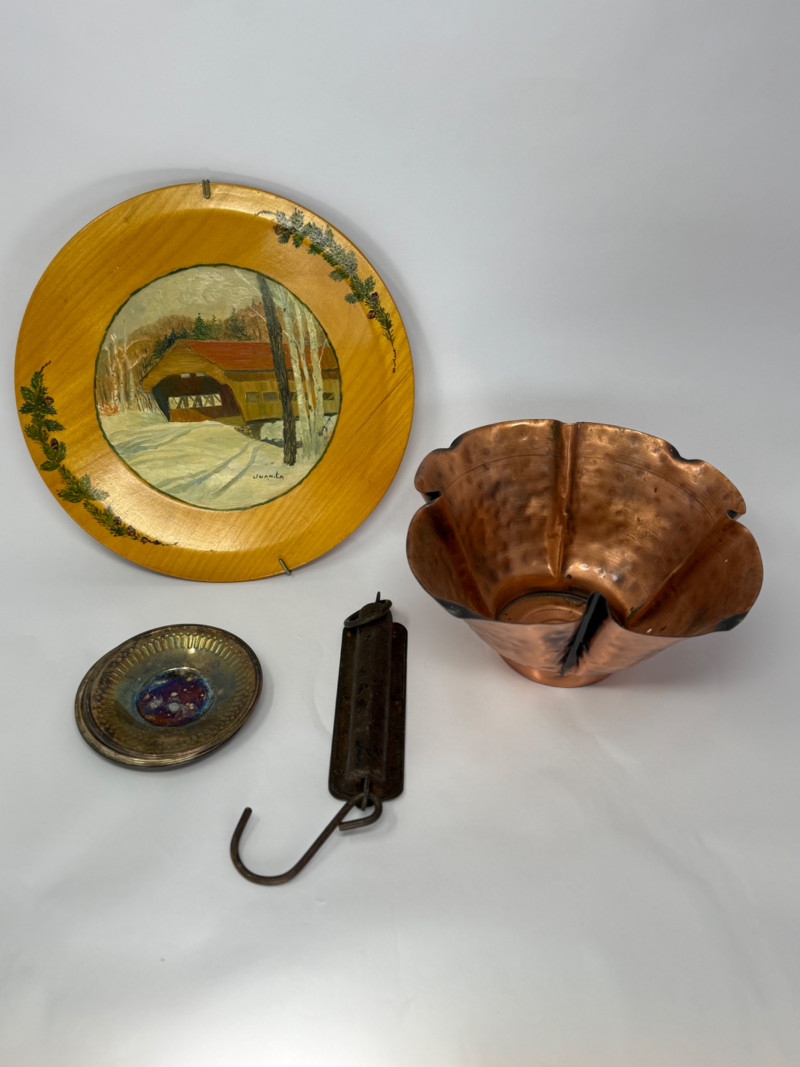 John Chatillon scales are collectible antique pieces. Copper bowl and hand-painted plate add strong visual appeal for resale or décor.
