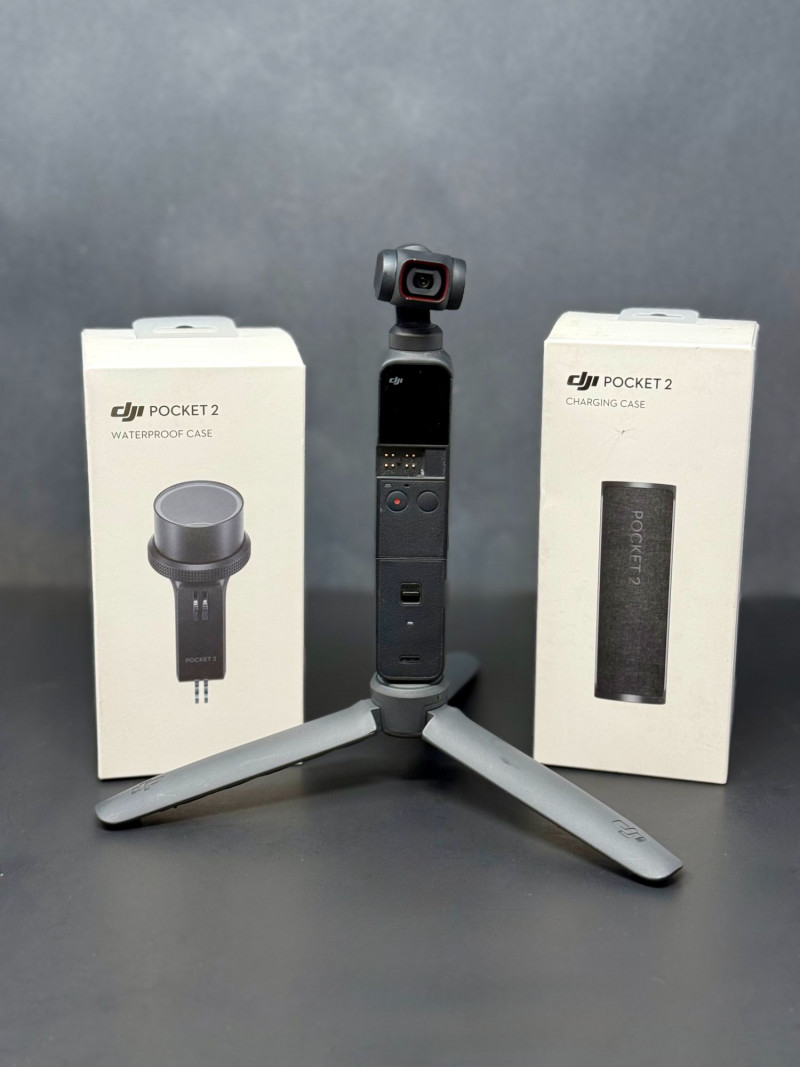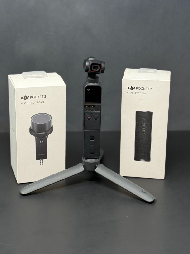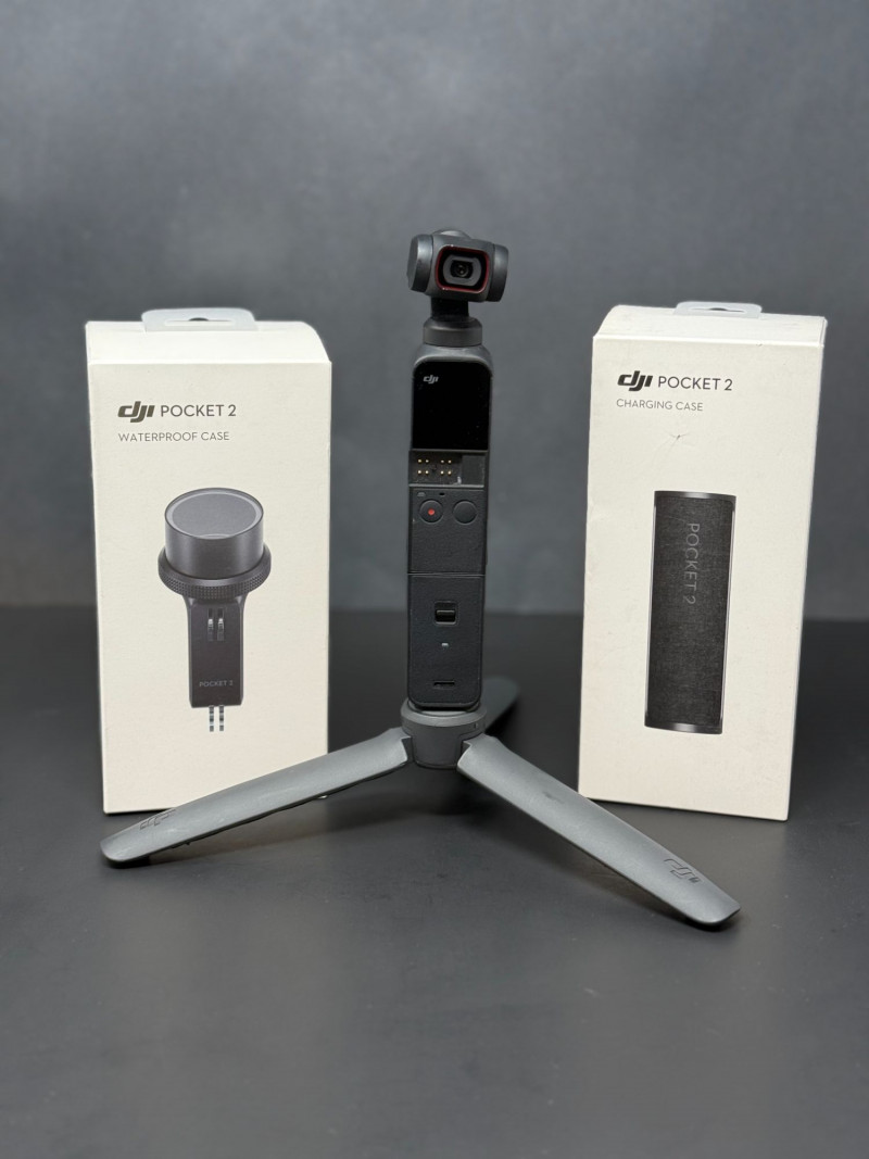 DJI Pocket 2 Gimbal Camera with Accessories — Charging Case & Waterproof Case Compact handheld gimbal camera system by DJI, featuring the Pocket 2 stabilized camera paired with original accessories. Designed for smooth, high-quality video capture in a highly portable format, the Pocket 2 integrates a built-in 3-axis gimbal for stabilized footage, making it ideal for travel, vlogging, and content creation. This set includes the Pocket 2 camera mounted with a fold-out mini tripod, along with the original DJI Pocket 2 charging case and DJI Pocket 2 waterproof case, both shown with original packaging. Type: Handheld gimbal camera DJI Pocket 2 camera Fold-out mini tripod base DJI Pocket 2 charging case DJI Pocket 2 waterproof case Original retail boxes for accessories Condition: Features: Integrated 3-axis gimbal stabilization Ultra-compact handheld design Compatible with smartphones and accessories Designed for smooth video, vlogging, and mobile content creation Estimated Era: Contemporary (2020s) Historical Note: Value Context: