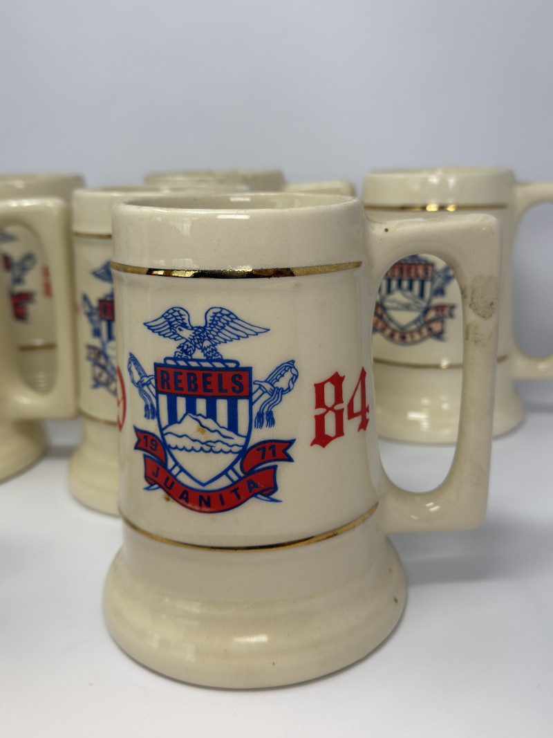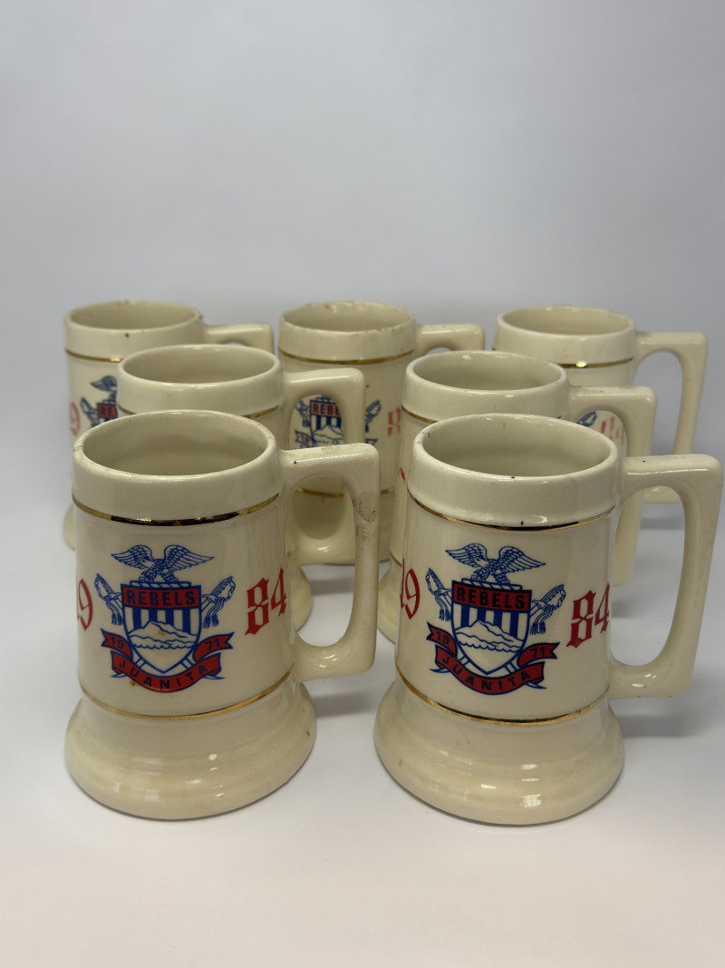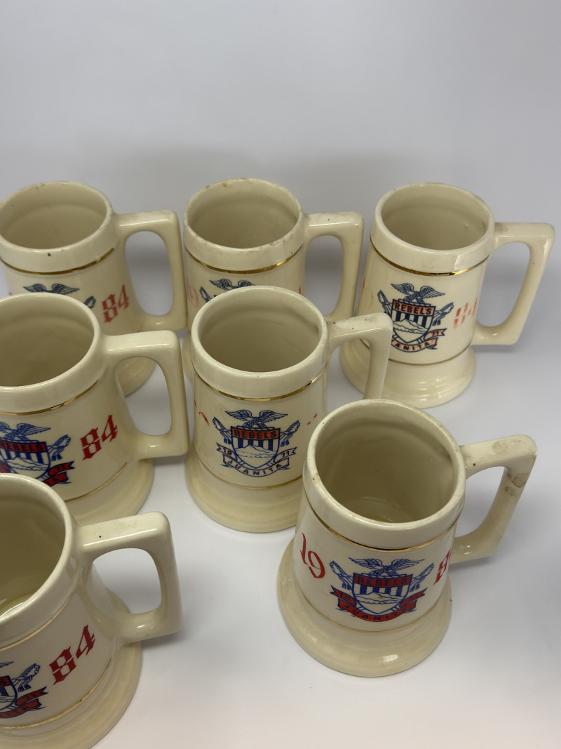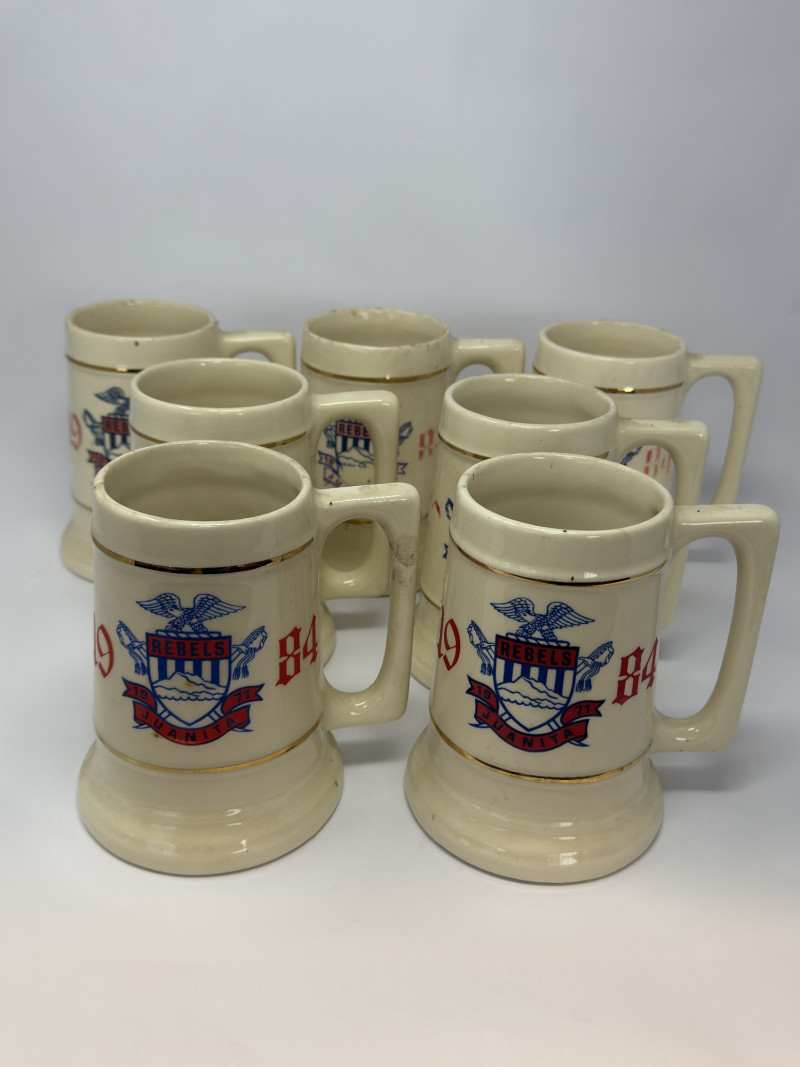 Vintage 1984 Rebels ceramic beer mug stein lot featuring classic cream-colored mugs with red, white, and blue crest design. Details: Great for: Condition: