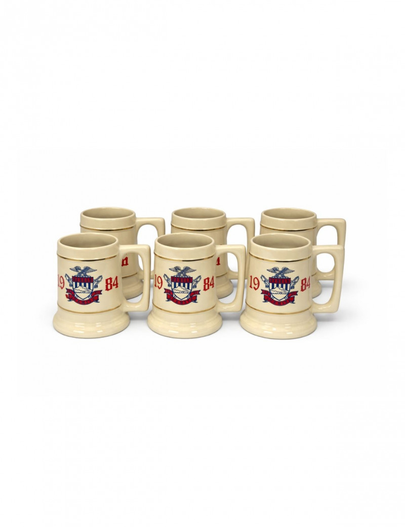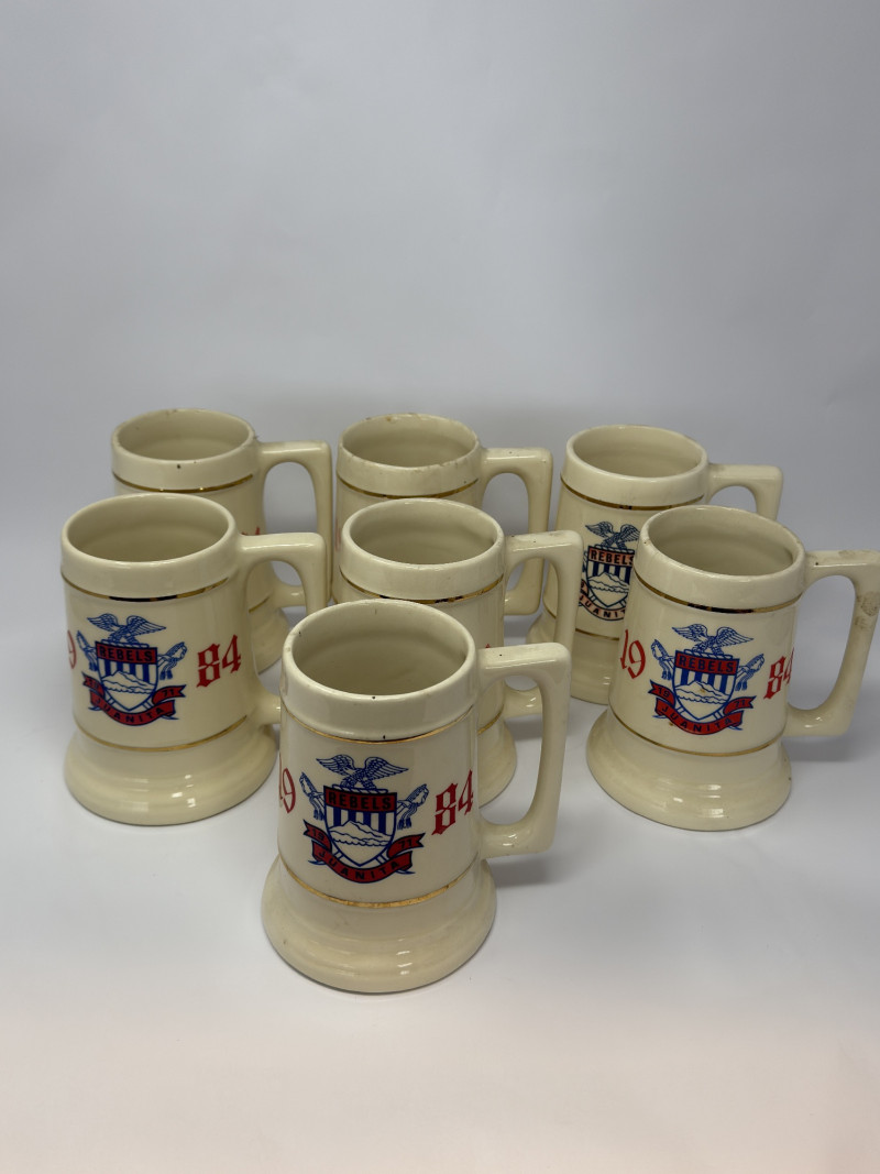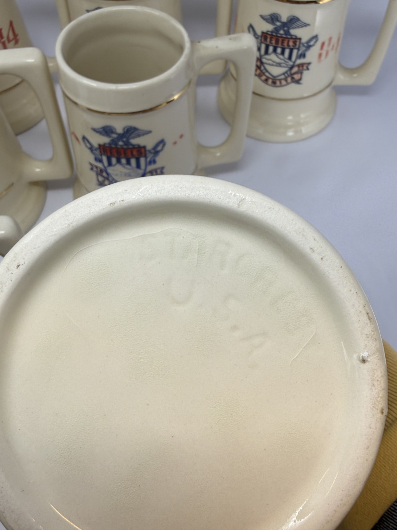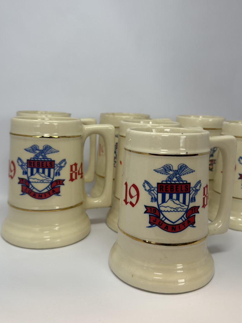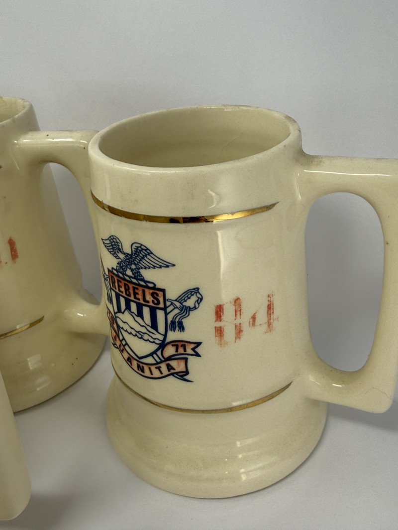 Vintage 1984 Rebels ceramic beer mug stein lot featuring classic cream-colored mugs with red, white, and blue crest design. Details: Great for: Condition: