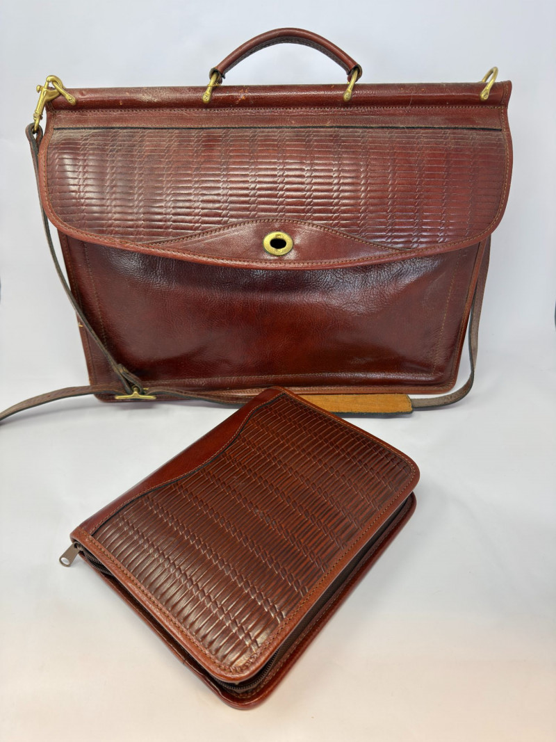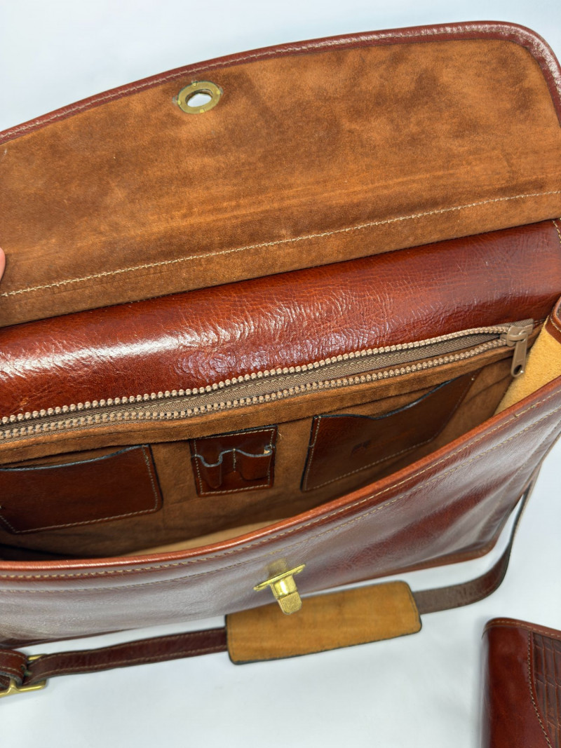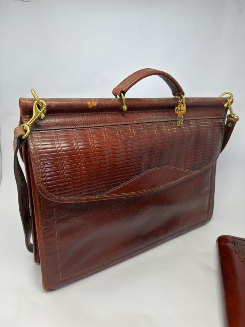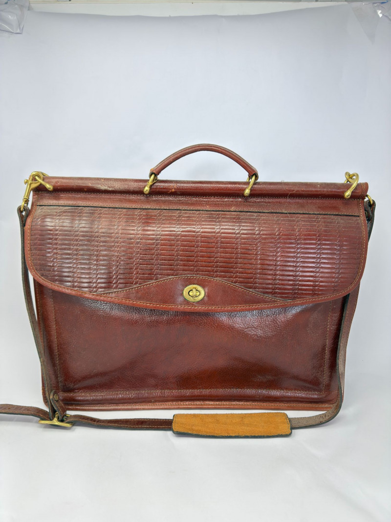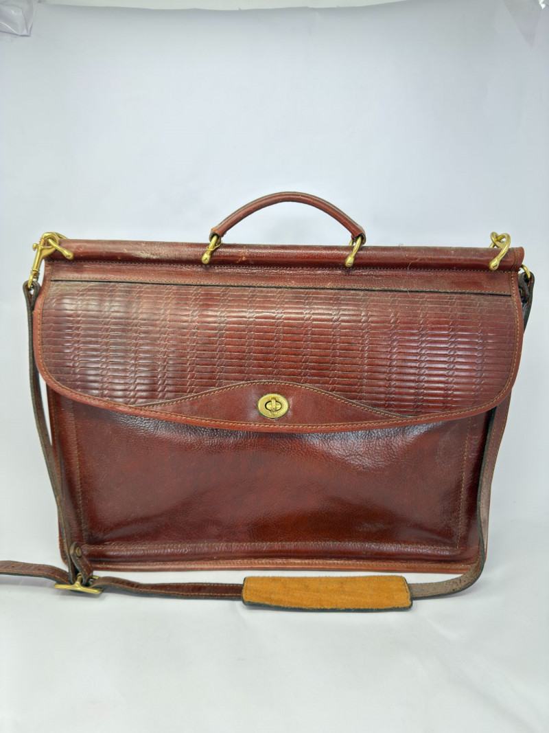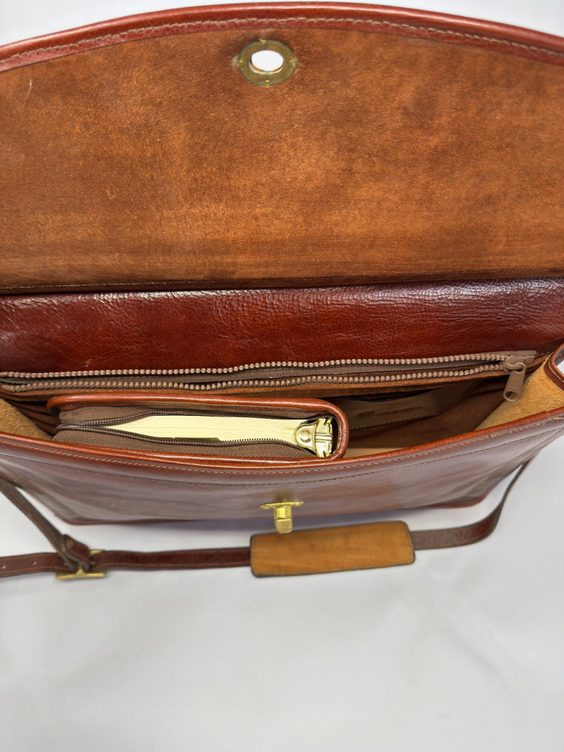 Good vintage condition with visible wear consistent with age. Scuffs, creasing, and patina throughout leather add character. Interior shows light wear but remains functional.