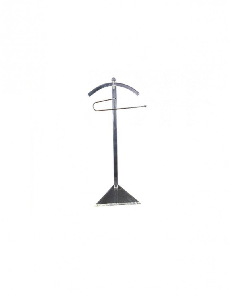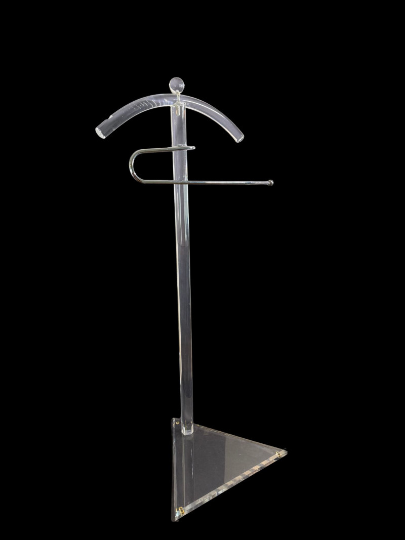 Postmodern Acrylic Glass Valet Stand, Italy, 1980s This sculptural postmodern valet stand is crafted from clear acrylic with a minimalist, architectural form typical of Italian design from the 1980s. The transparent construction creates a light, floating presence while allowing the form itself to act as a statement piece. The valet features a curved hanger-style top designed to support jackets or shirts, paired with a sleek horizontal metal bar for trousers or accessories. Its triangular acrylic base provides both stability and visual balance, emphasizing the geometric sensibility associated with postmodern interiors. Lucite and acrylic furniture gained prominence during the late 20th century as designers embraced modern materials, transparency, and functional sculpture. Valet stands such as this were commonly used in bedrooms and dressing areas, valued for their dual role as utility objects and design-forward décor. Together, the clean lines, clear material, and restrained metal detailing make this piece ideal for modern, postmodern, or mid-century–inspired interiors. Dimensions: Condition: Notes: Estimated Value: