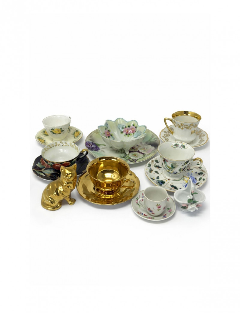 Mixed lot of vintage teacups, saucers, and decorative figurines, featuring a variety of floral patterns, gold accents, and collectible pieces. Includes: A beautiful mix of mid-century and vintage pieces, ideal for: Condition: Measurements: Style: Notes:
