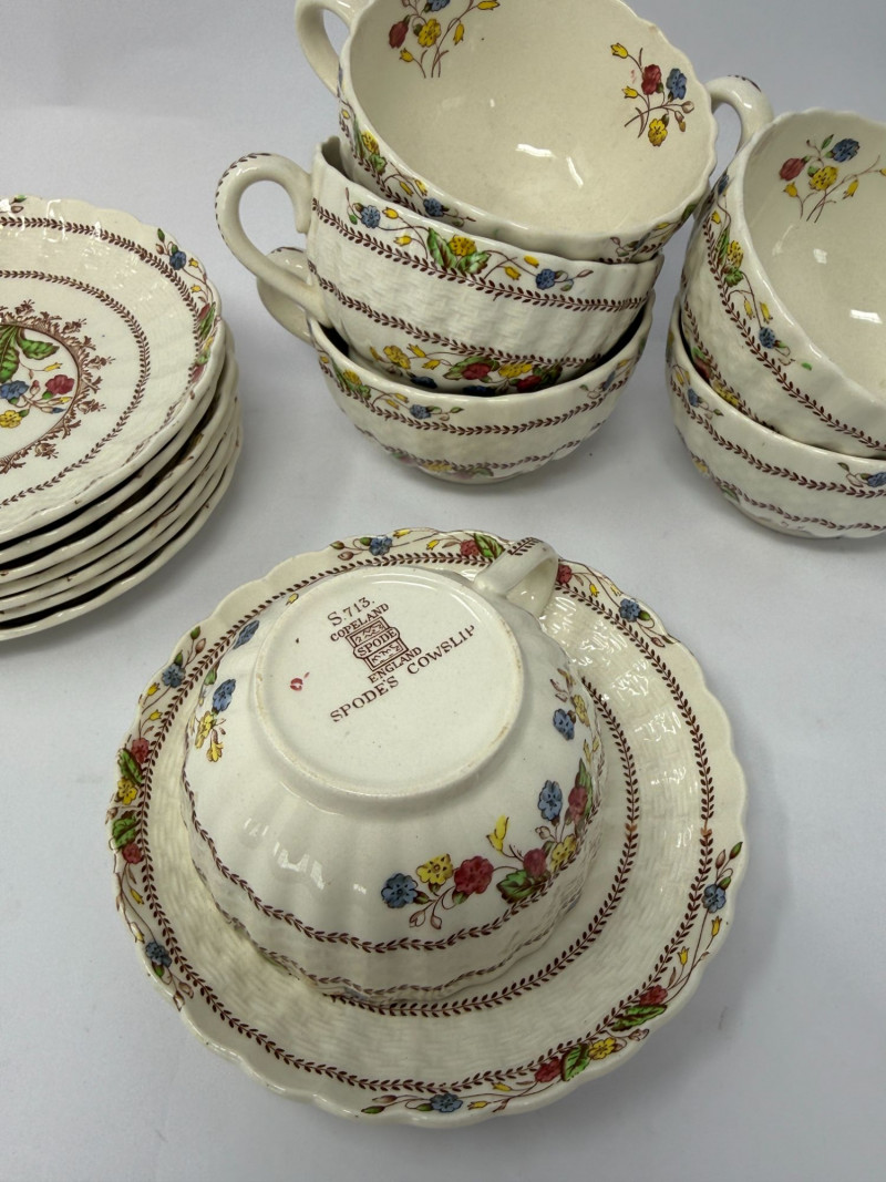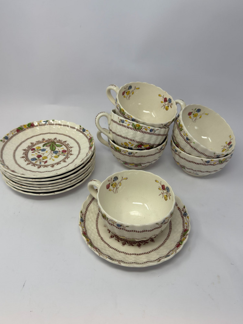Copeland Spode is one of England’s most well-known china makers, with roots dating back to the late 1700s. The Rosalie pattern, produced mid-20th century, reflects traditional English floral design on the Chelsea Wicker form. Similar partial sets typically sell in the $150–$300 range depending on condition and completeness.